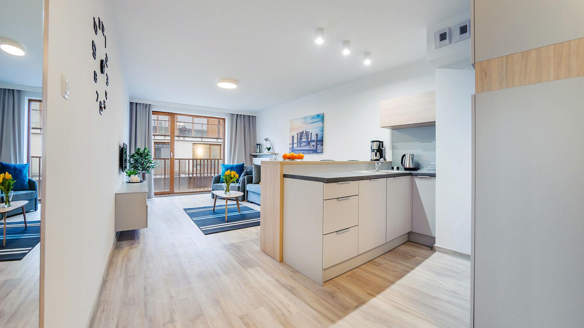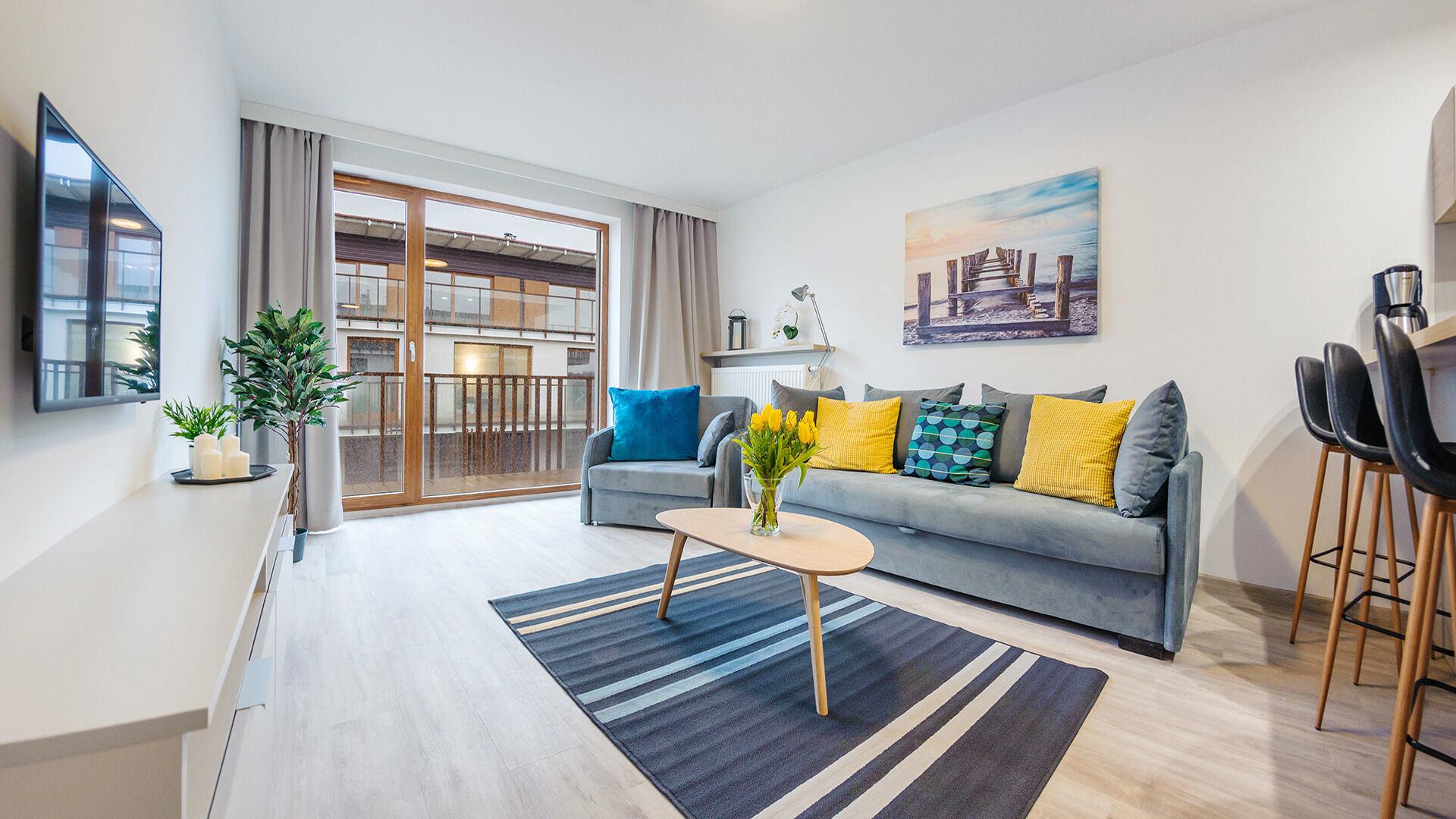 Die Apartments im Resorts Kolobrzeg liegen im ruhigen, westlichen Teil der Stadt, umgeben vom NATURA-2000-Park und nur wenige Minuten vom breiten Weststrand sowie einem Hundestrand entfernt. Die Lage bietet saubere Luft, direkten Kontakt zur Natur und Zugang zu Rad- und Spazierwegen. Die Apartments sind hochwertig ausgestattet und verfügen über voll ausgestattete Küchenzeilen sowie große Terrassen. Auf dem Gelände stehen nummerierte Außenparkplätze und Tiefgaragenplätze gegen Aufpreis zur Verfügung, zudem gibt es einen öffentlichen, kostenpflichtigen Parkplatz vor dem Gebäude. Gästen stehen ein täglich geöffneter Pool sowie eine Sauna zur Verfügung. Kolobrzeg bietet das ganze Jahr über zahlreiche Freizeit- und Kulturangebote sowie eine vielfältige Gastronomie.