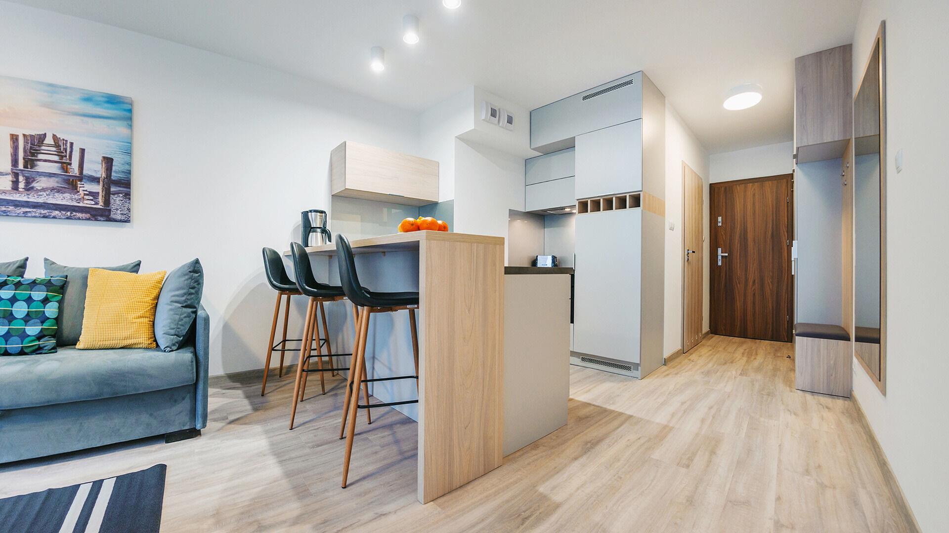 Die Apartments im Objekt Resorts Kolobrzeg befinden sich im westlichen Teil von Kolobrzeg, abseits des städtischen Trubels, umgeben vom Grün des NATURA-2000-Parks. Diese Lage garantiert saubere Luft, malerische Ausblicke und direkten Kontakt zur Natur. Die Plazowa-Straße mit ihren breiten Gehwegen und Radwegen ist ein Teil der R10-Fahrradroute. Ein fünfminütiger Spaziergang über einen direkten Zugang zum Meer reicht aus, um den breiten, sandigen „Weststrand” zu erreichen; ganz in der Nähe befindet sich auch ein Hundestrand. Alle Apartments sind hochwertig ausgestattet und verfügen über funktionale, voll ausgestattete Küchenzeilen sowie geräumige Terrassen mit Blick auf den Innenhof oder das Grün des NATURA-2000-Parks. Vor dem Gebäude gibt es einen öffentlichen, kostenpflichtigen Stadtparkplatz (begrenzte Anzahl an Stellplätzen). Auf dem Gelände stehen ein nummerierter Außenparkplatz sowie Parkplätze in der Tiefgarage zur Verfügung, die den meisten Apartments zugeordnet sind und gegen Aufpreis genutzt werden können. Im Objekt befindet sich ein Schwimmbad, das täglich von 10:00 bis 21:00 Uhr geöffnet ist, sowie eine Sauna, die täglich von 16:00 bis 21:00 Uhr geöffnet ist. Der Pool befindet sich im Gebäude A; aus Gebäude B gibt es keinen direkten Zugang zu Gebäude A.