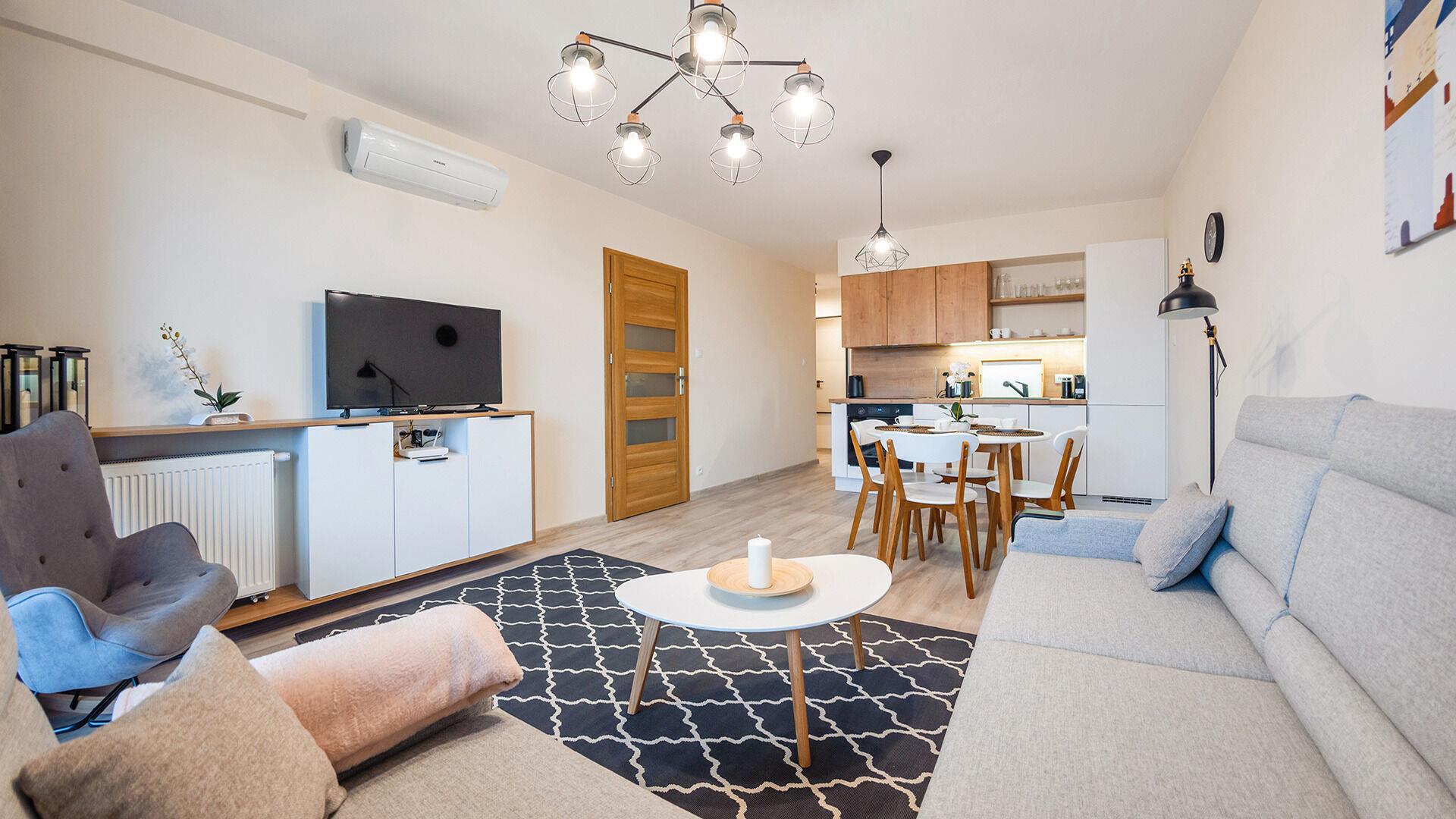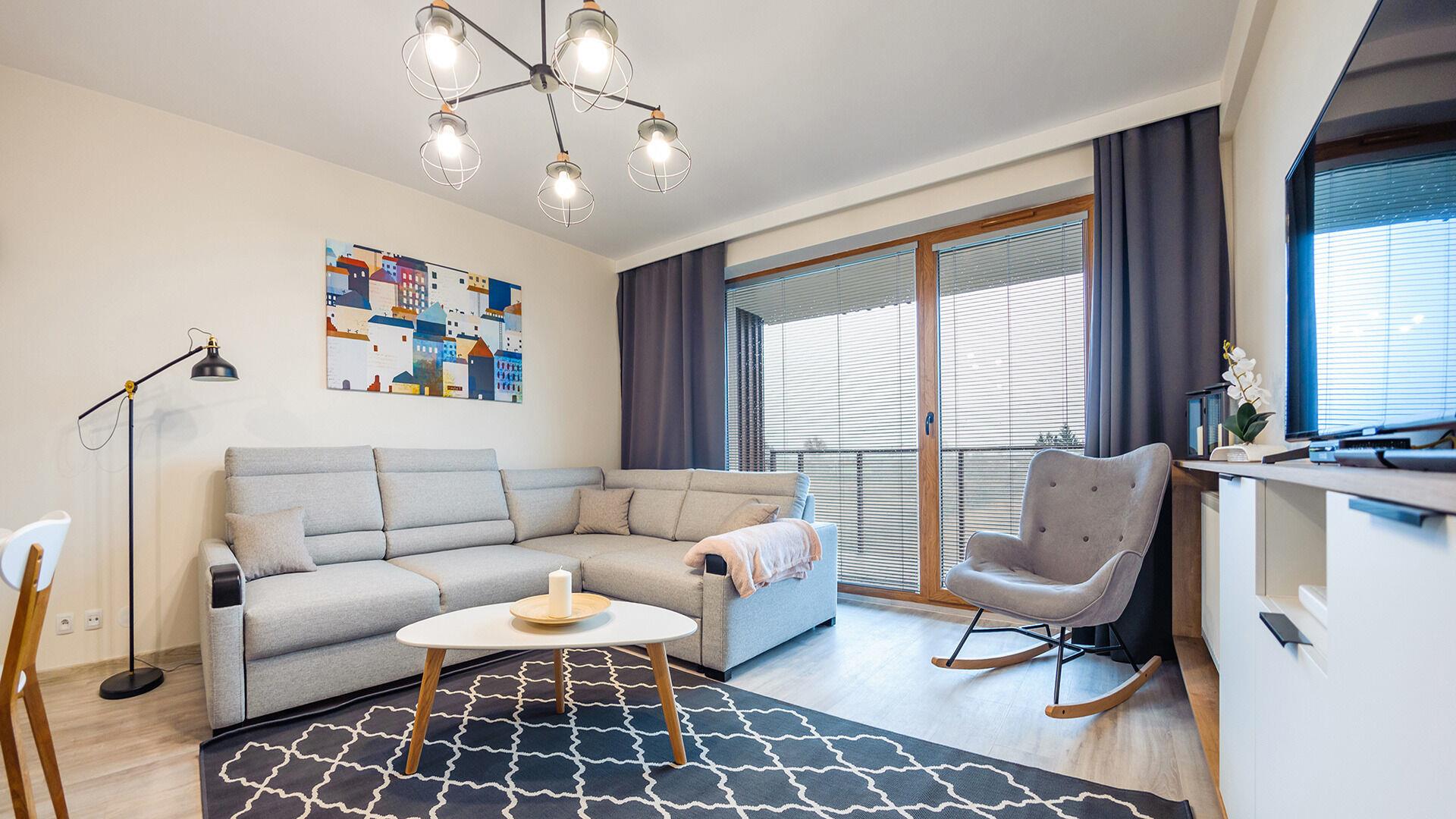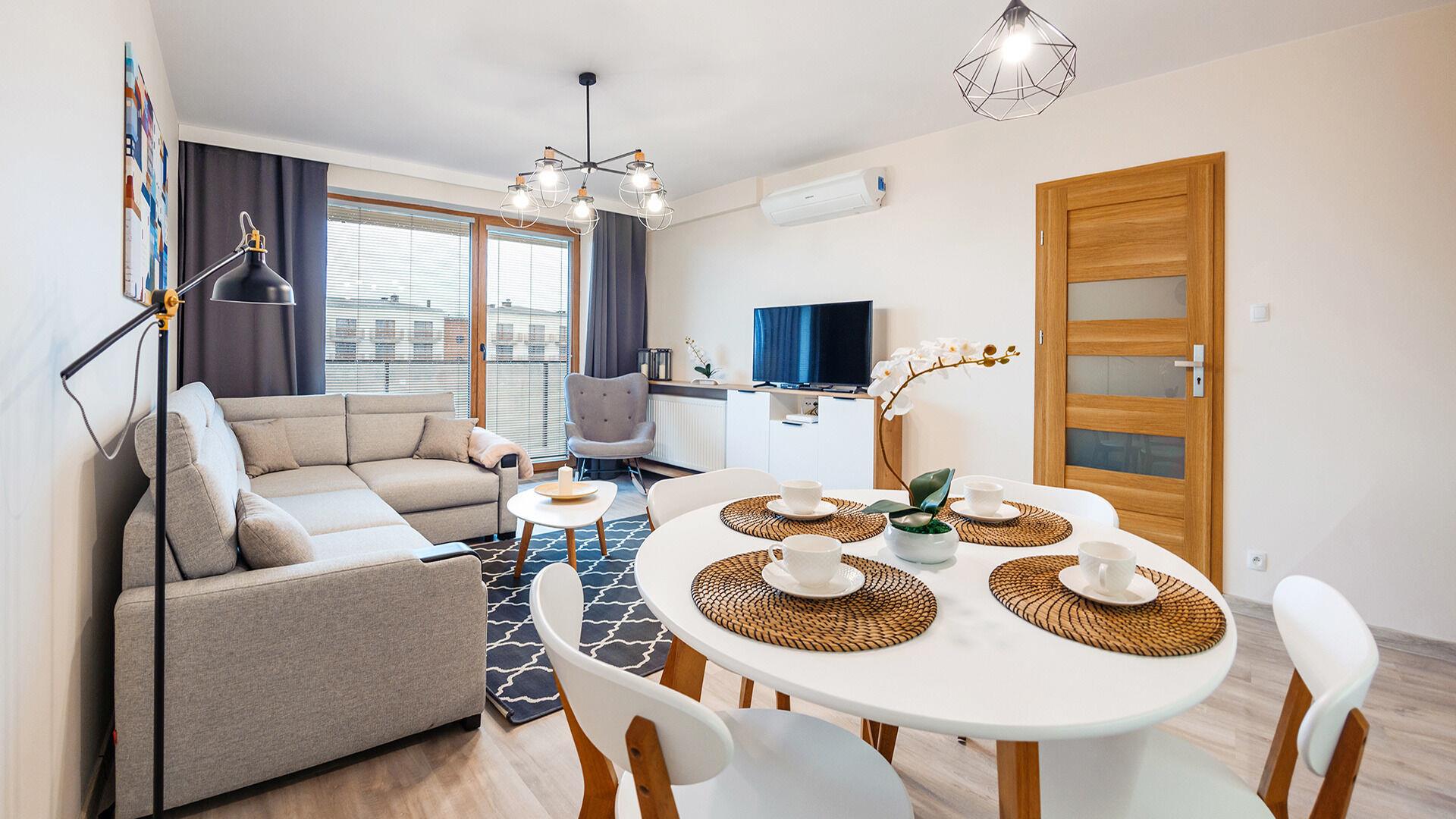 • Haustiere sind in der ausgewählten Wohnung erlaubt. Die Kosten für den Aufenthalt mit einem Haustier betragen 40 PLN pro Tag.