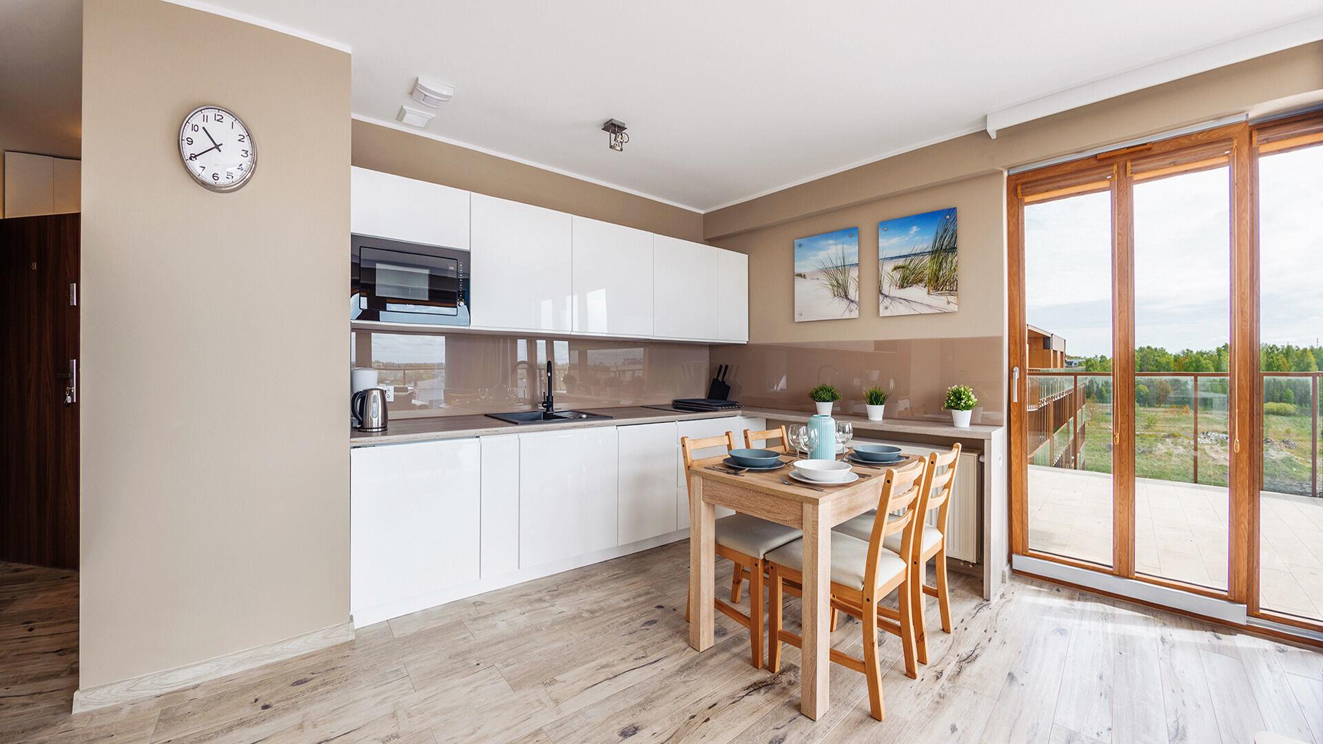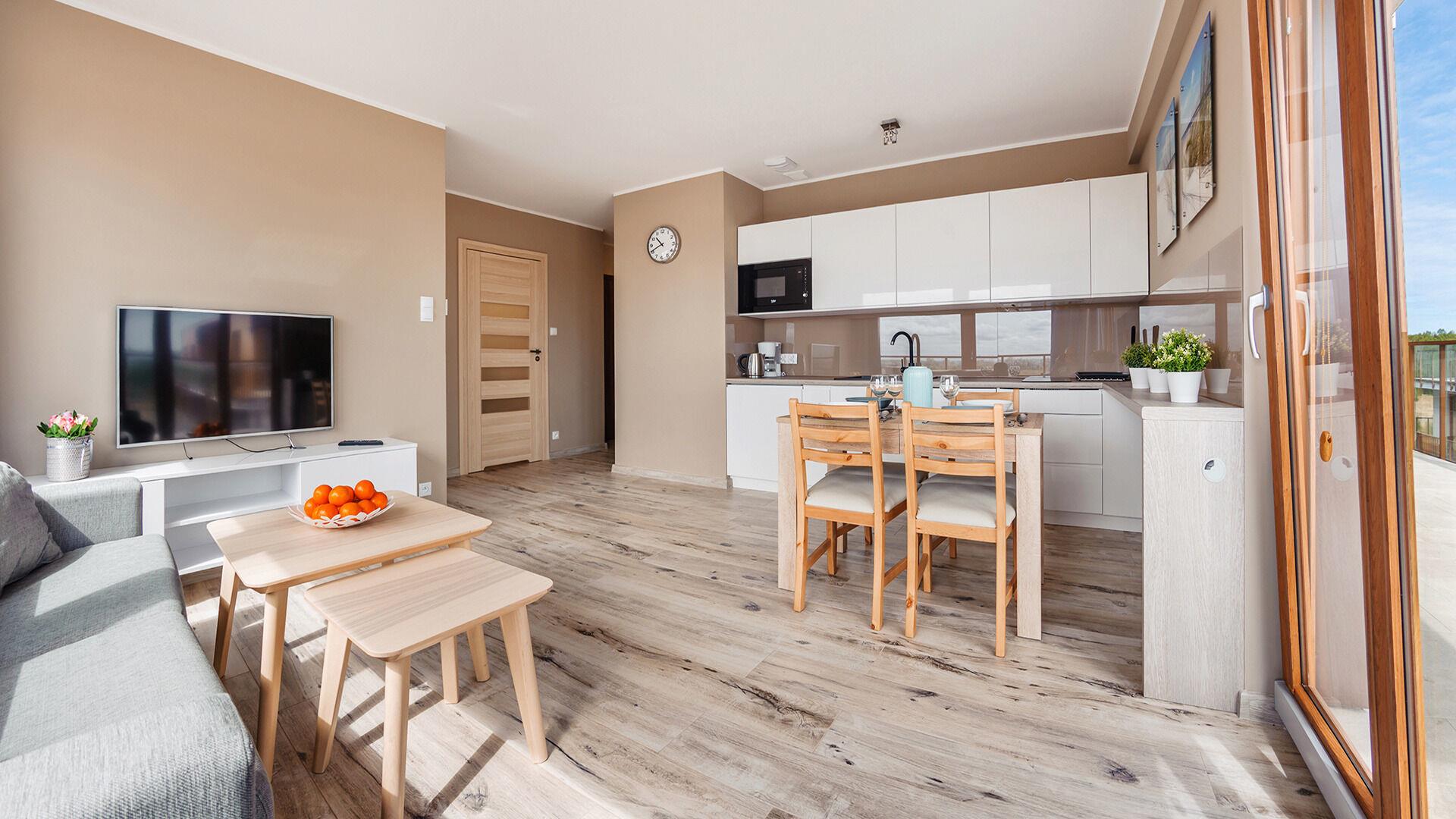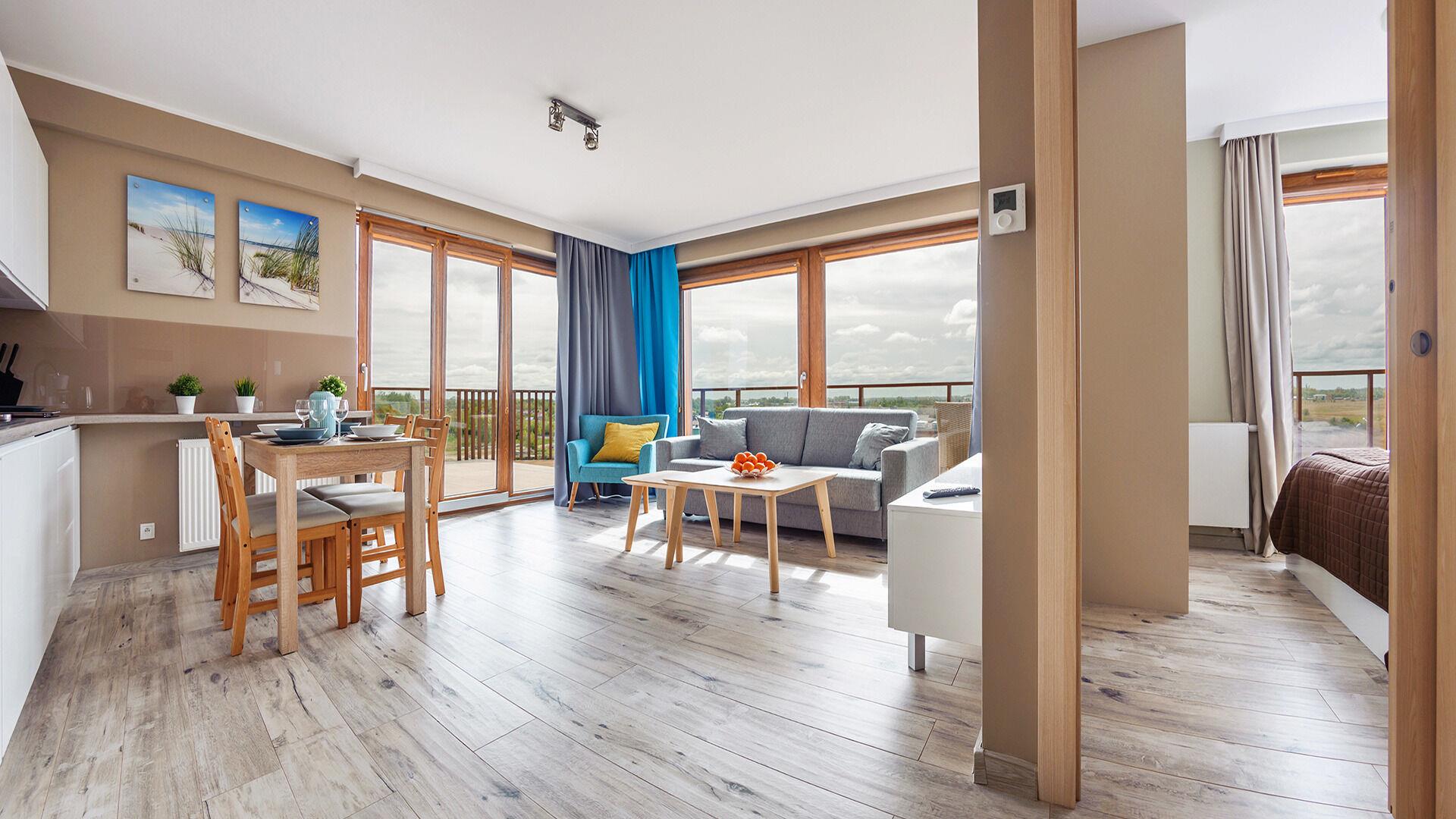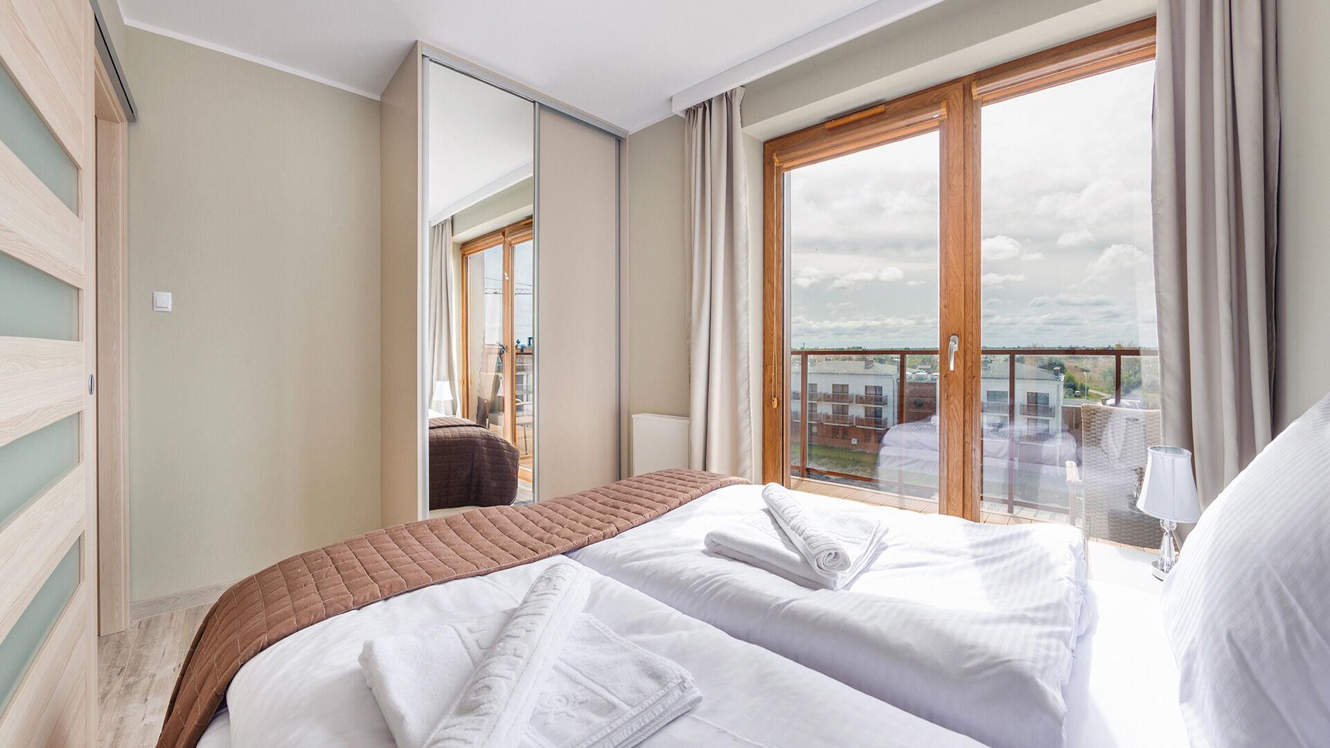 Die Apartments im Resorts Kolobrzeg liegen im ruhigen, westlichen Teil der Stadt, umgeben vom NATURA-2000-Park und nur wenige Minuten vom breiten Weststrand sowie einem Hundestrand entfernt. Die Lage bietet saubere Luft, direkten Kontakt zur Natur und Zugang zu Rad- und Spazierwegen. Die Apartments sind hochwertig ausgestattet und verfügen über voll ausgestattete Küchenzeilen sowie große Terrassen. Auf dem Gelände stehen nummerierte Außenparkplätze und Tiefgaragenplätze gegen Aufpreis zur Verfügung, zudem gibt es einen öffentlichen, kostenpflichtigen Parkplatz vor dem Gebäude. Gästen stehen ein täglich geöffneter Pool sowie eine Sauna zur Verfügung. Kolobrzeg bietet das ganze Jahr über zahlreiche Freizeit- und Kulturangebote sowie eine vielfältige Gastronomie.