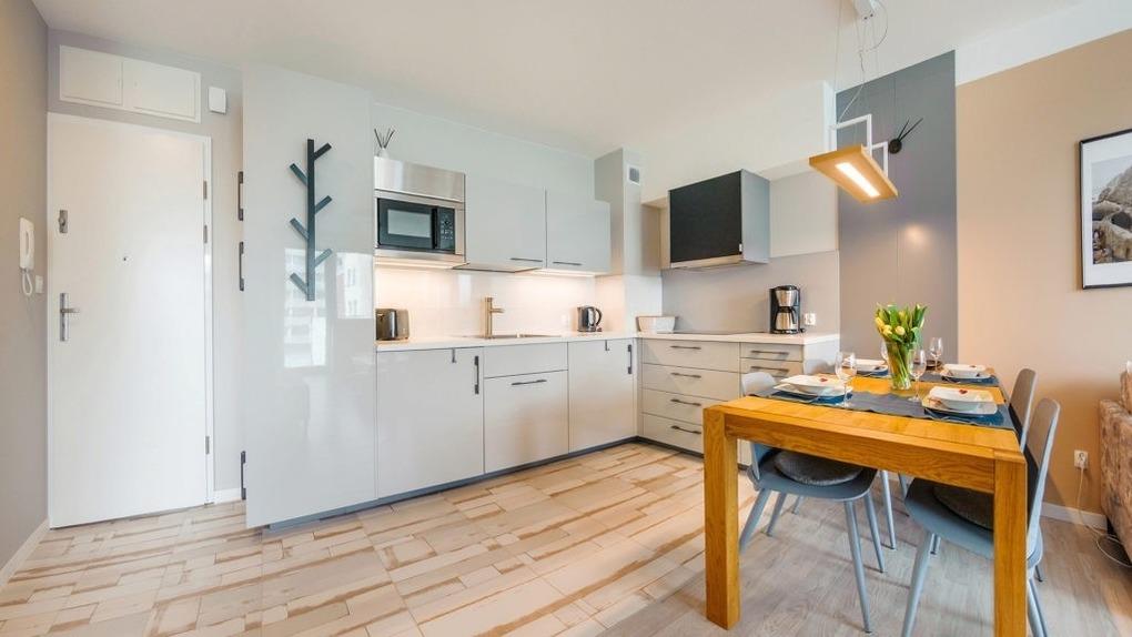 Blizej Morza ist ein moderner Apartmentkomplex im zentralen Kurviertel von Kolobrzeg, nur wenige Schritte vom Küstenpark, der Promenade, dem Strand und dem Meer entfernt. Das Gebäude verfügt über einen Aufzug mit Zugang zur Tiefgarage, ein voll ausgestattetes Fitnessstudio, einen Fahrradraum, eine Lobby sowie eine Dachterrasse mit Liegestühlen zum Entspannen. Gegenüber befindet sich ein Hotel mit Restaurant und einem Wasser-Thermal-Komplex, der gegen Aufpreis genutzt werden kann. Die Apartments sind mit frischer Bettwäsche und Handtüchern ausgestattet, und Gäste erhalten 10 % Rabatt auf Massagen, die direkt im Apartment oder vor Ort angeboten werden. Ideal für Familien, Paare und alle, die Erholung in Meeresnähe suchen.