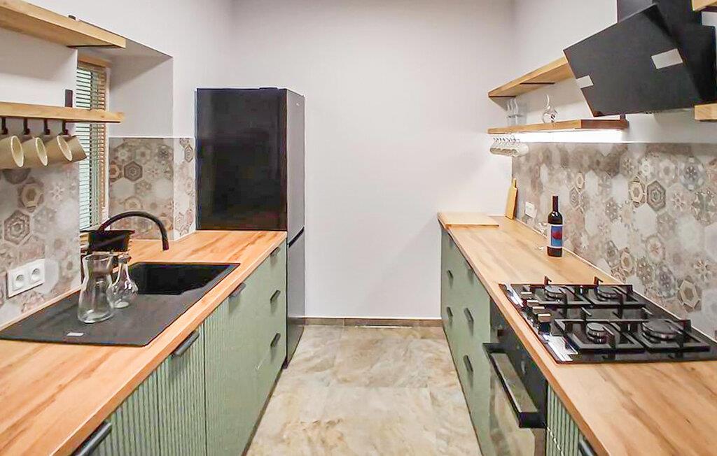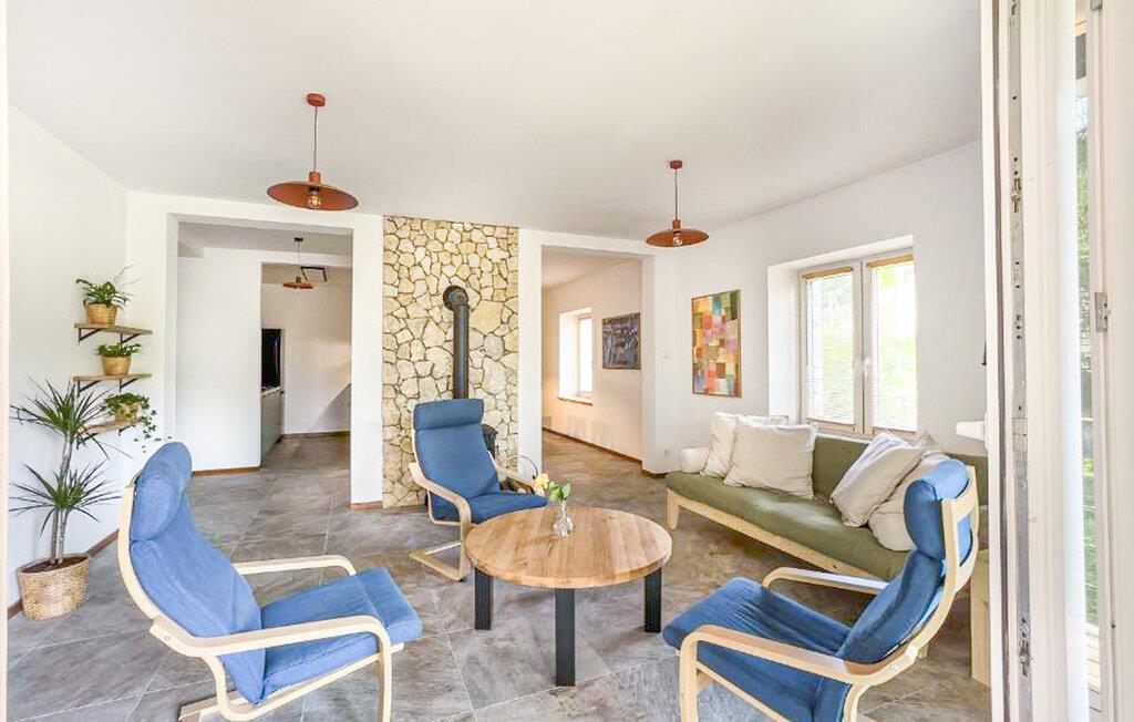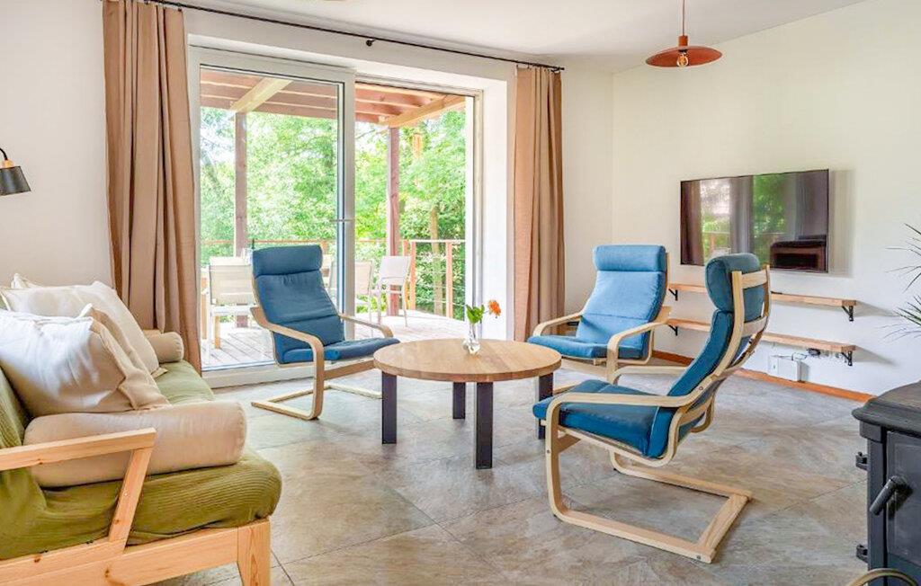 Lassen Sie sich vom hellen, offenen Wohnbereich empfangen und nehmen Sie in einem der bequemen Sessel Platz oder entspannen Sie auf dem Sofa mit Blick ins Grüne. Große Fensterflächen sorgen für viel Tageslicht und schaffen eine freundliche Atmosphäre. Bereiten Sie in der separaten Küche frische Gerichte zu und nutzen Sie die großzügigen Arbeitsflächen für Ihre kulinarischen Ideen. Versammeln Sie sich am Esstisch vor der Natursteinwand und genießen Sie Ihre gemeinsamen Mahlzeiten in modernem Ambiente. Ziehen Sie sich anschließend in die Sauna zurück und gönnen Sie sich wohltuende Wärme nach einem aktiven Tag.