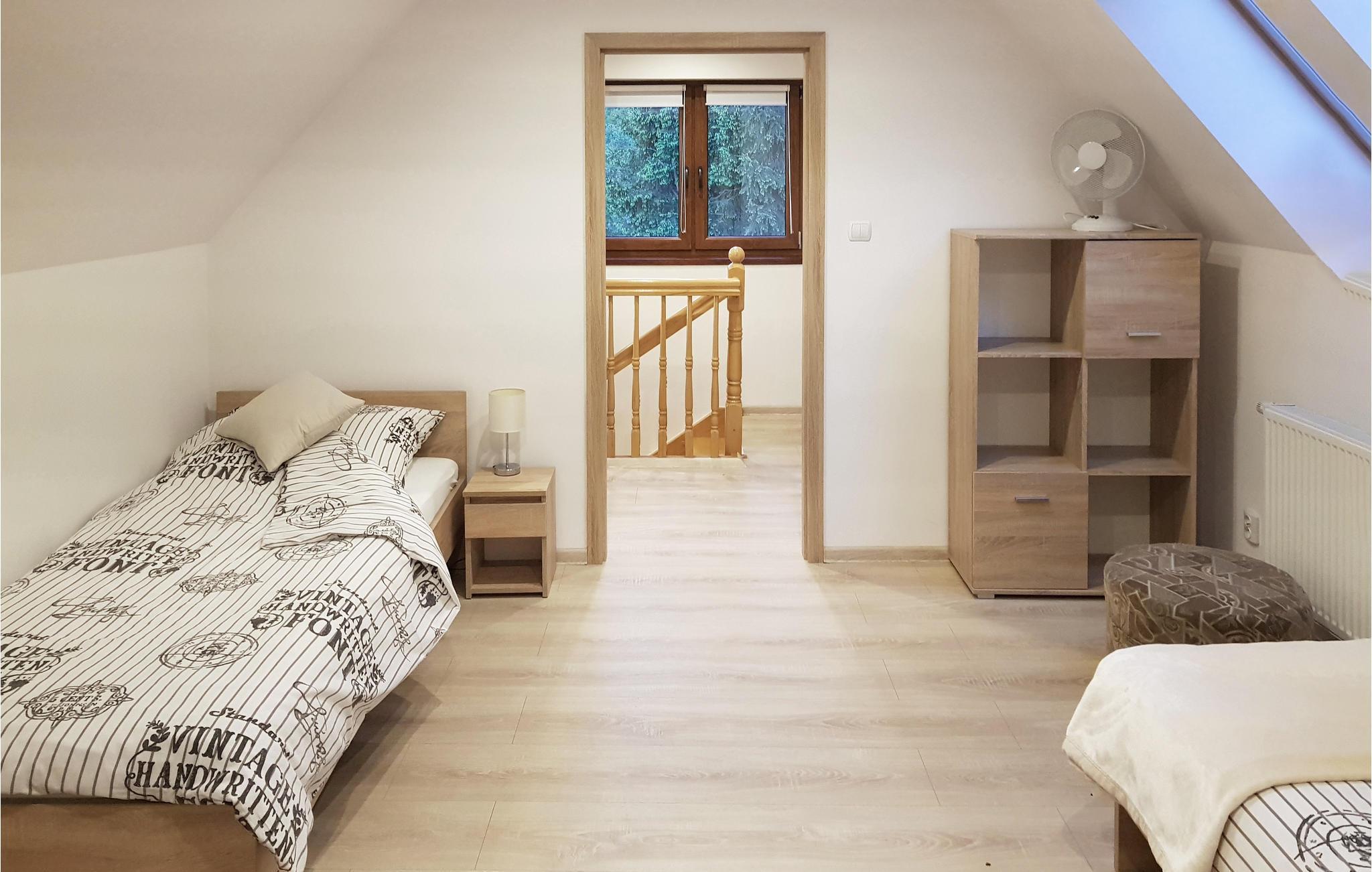 Dette hyggelige feriehus ligger i den rolige og ugenert beliggende by Krzynia, langt væk fra storbyens stress og mange køretøjer. Den lukkede grund er omgivet af træer og ligger kun 250 m fra søen. Omgivelserne er som skabt for jer, der vil fiske og cykle (fire cykler med i prisen). I huset er der en stue med en stor kamin, et køkken, en spiseplads og de to soveværelser (det ene gennemgangsrum) ligger på første sal. Fra vindue er der en skøn udsigt over den smukke sø og det kuperede landskab. I stueplan er der elektriske skodder for vinduerne. Parabolen kan tage både Astra og Hotbird.