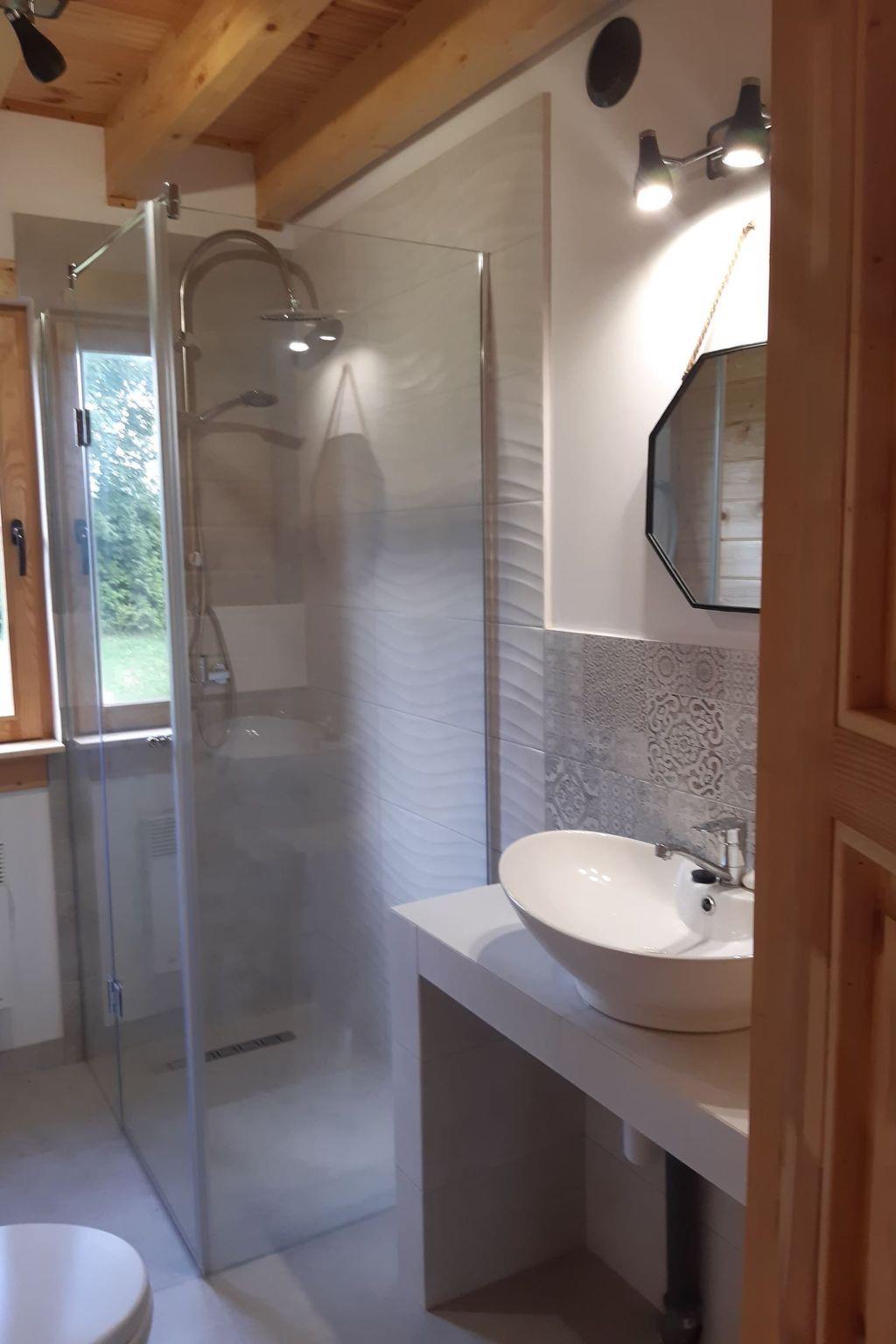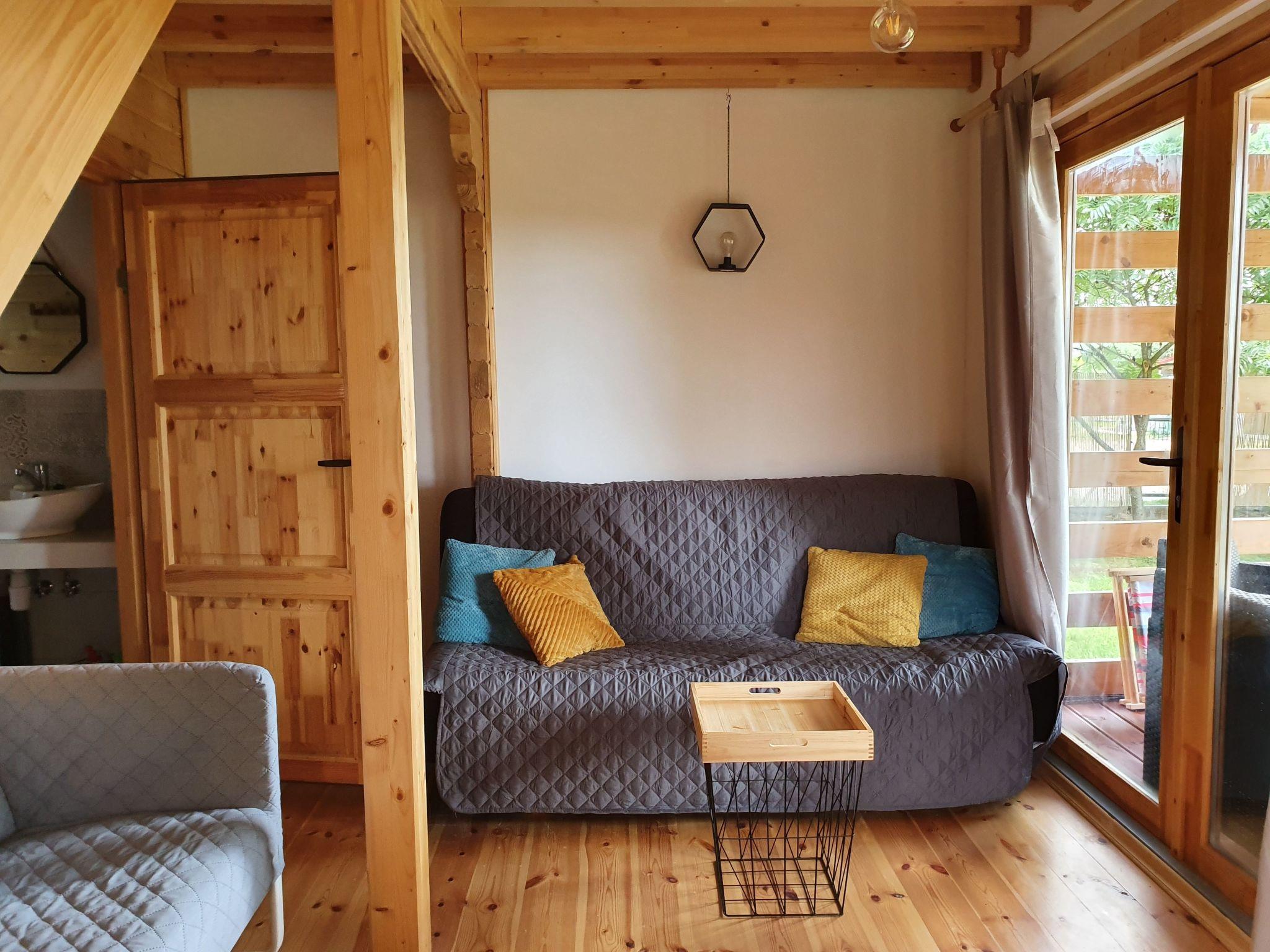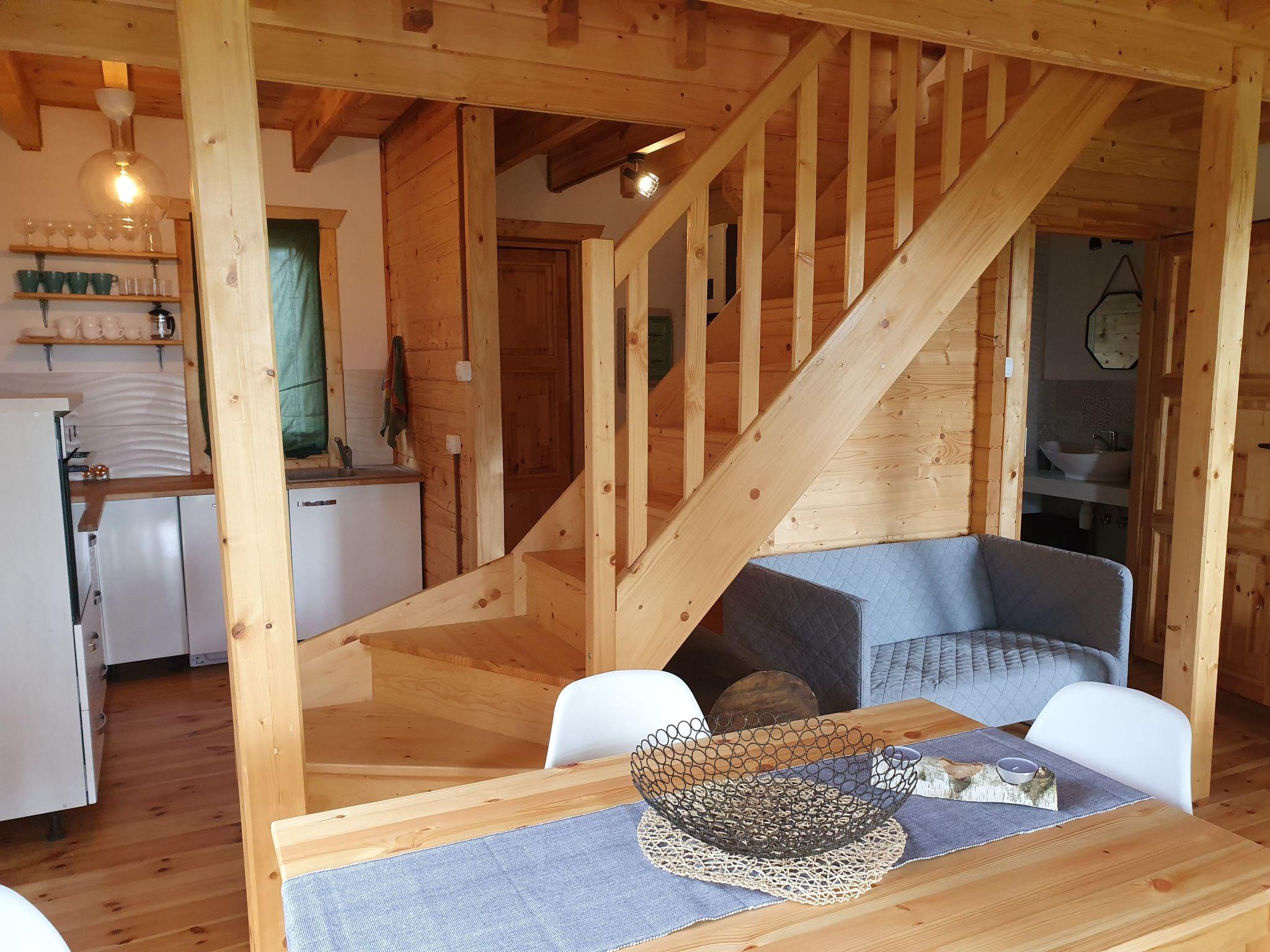There is a large land area of 3000 metres, shared with the other house (the owner lives in the area). There is garden furniture, deckchairs, barbecue, 2 bicycles for adults and 1 for a child, hammock, garden rocking chair, trampoline, frame pool in summer. In the area there is a place and a net for handball or badmington, a place for a bonfire and a large supply of brushwood in the price. On cloudy days you can play darts and ping-pong, table football in the house. In addition, it is possible to hire a pedal boat or ice-boat approx. 400 m (extra fee). From the living room you have access to the terrace, which offers a view of the surroundings, a wide panorama of forests and fields. The terrace is located on the south side so it is sunny all day long. The house has its own solar panels for heating water and a second source of water heating in case of a lack of sunshine on cloudy days.