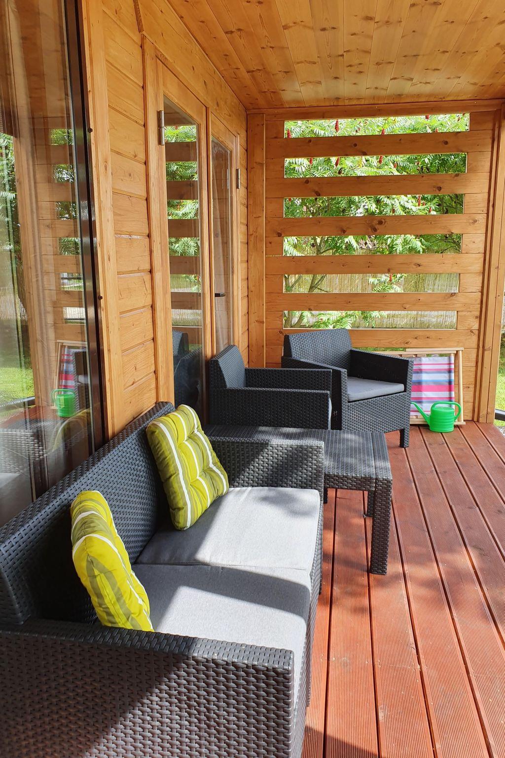 The house is wooden, has 80 metres, is single-storey with a usable attic. On the ground floor is the living area, which consists of a living room with dining area and kitchen. The kitchen is equipped with all necessary appliances such as dishwasher, oven, ceramic hob, coffee maker, all dishes and utensils necessary for preparing meals. The sofa in the living room has a fold-out bed for 2 persons. But in principle it is an alternative, because the night area is on the floor. From the living room there is an exit to the terrace. In addition, on the ground floor there is a hall and a bathroom with shower. On the first floor there are two bedrooms, one of which has a double bed (master bedroom) measuring 160 by 200 cm. The second bedroom is a 3-bedded room with 3 single beds, measuring 90 by 200 cm. We also have a baby cot. WIFI in the house and garden.