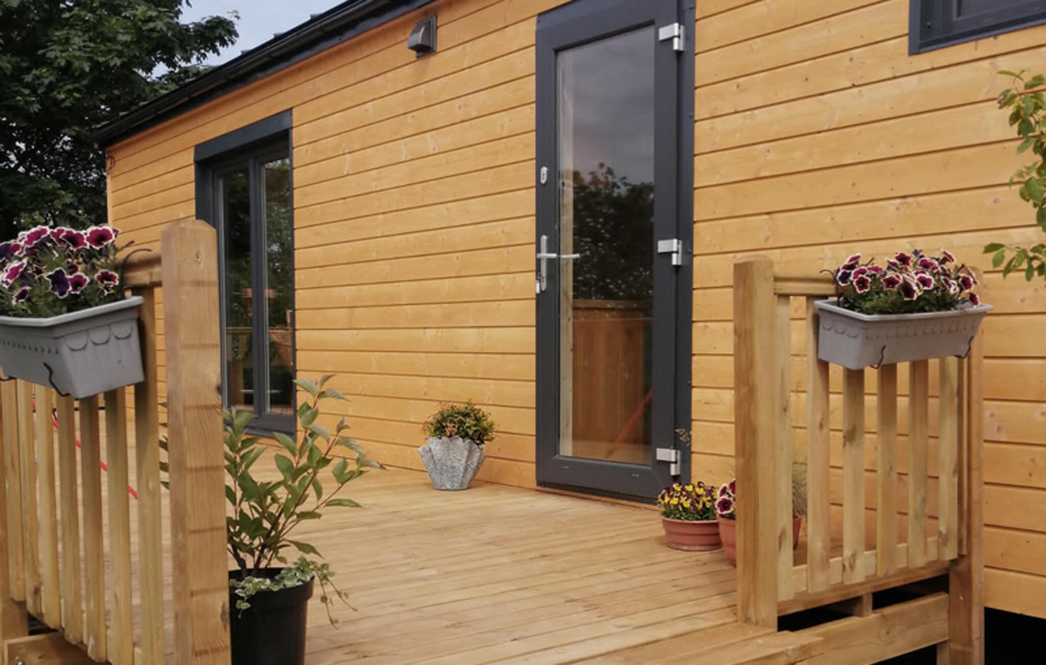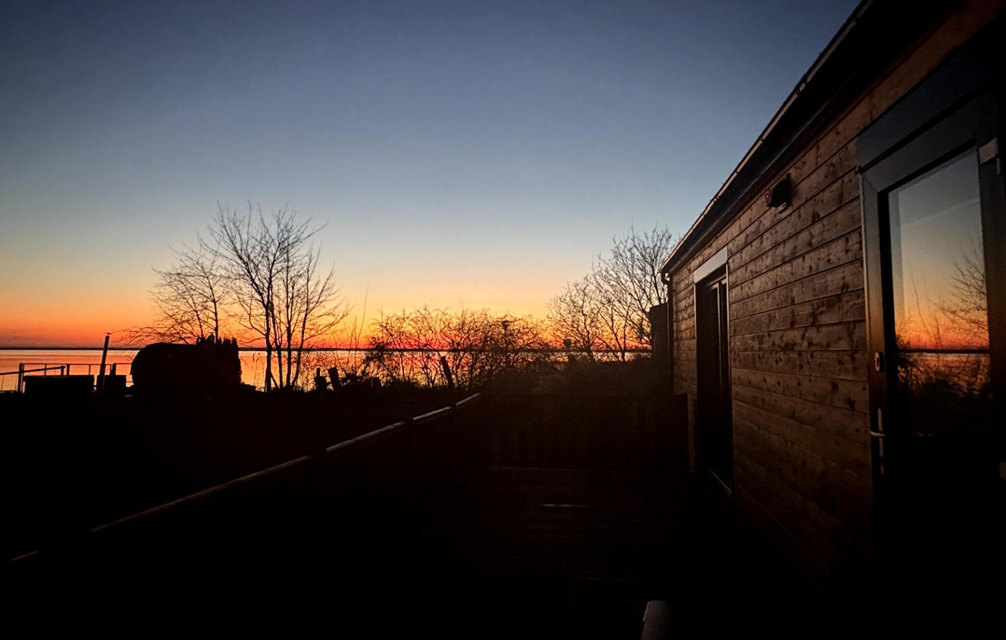 Udenfor venter en stor terrasse, hvor I kan nyde den friske luft eller afslutte dagen i vildmarksbadet og den fælles sauna med udsigt over søen. Den smukt anlagte have lover ren afslapning.