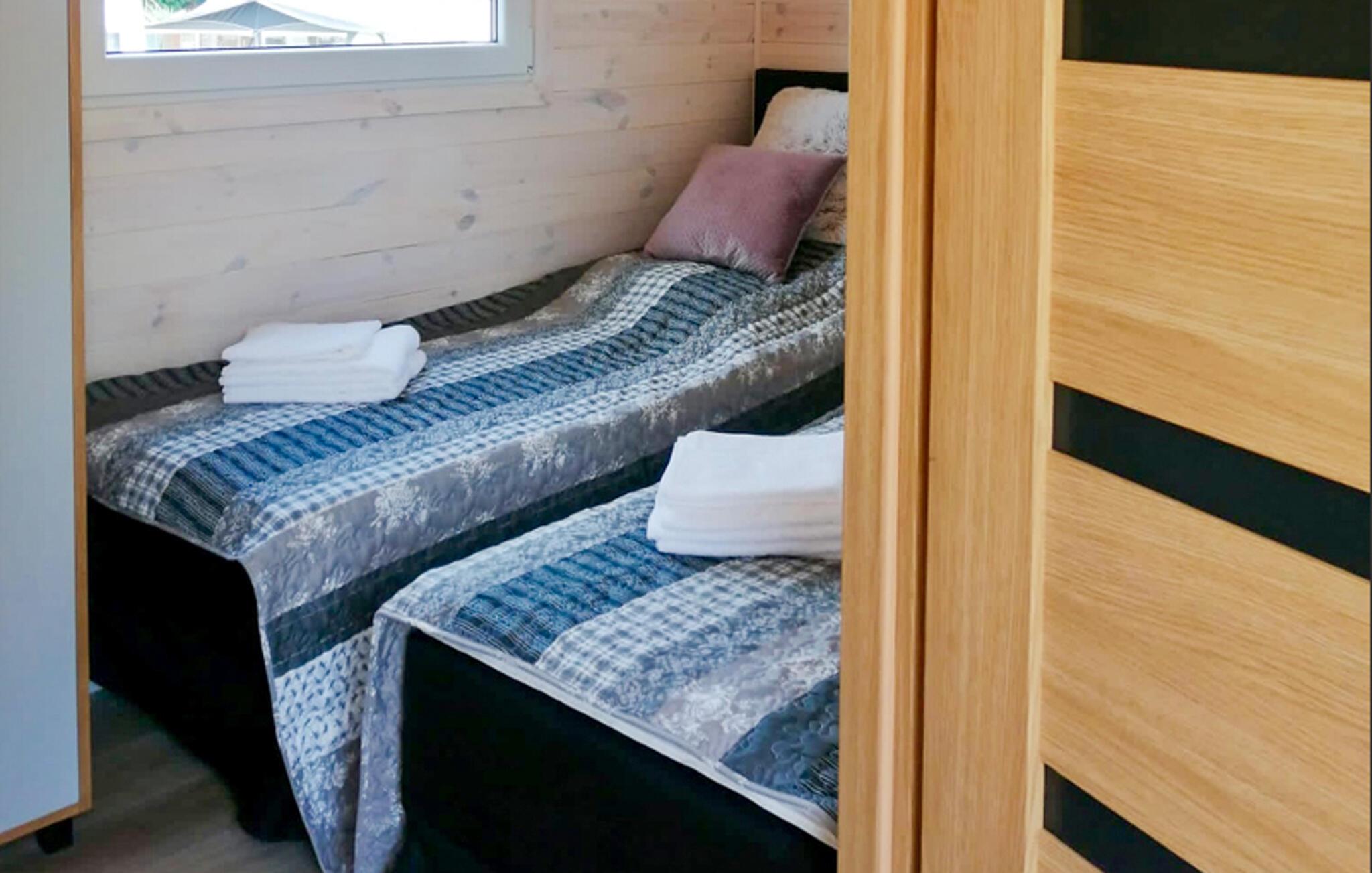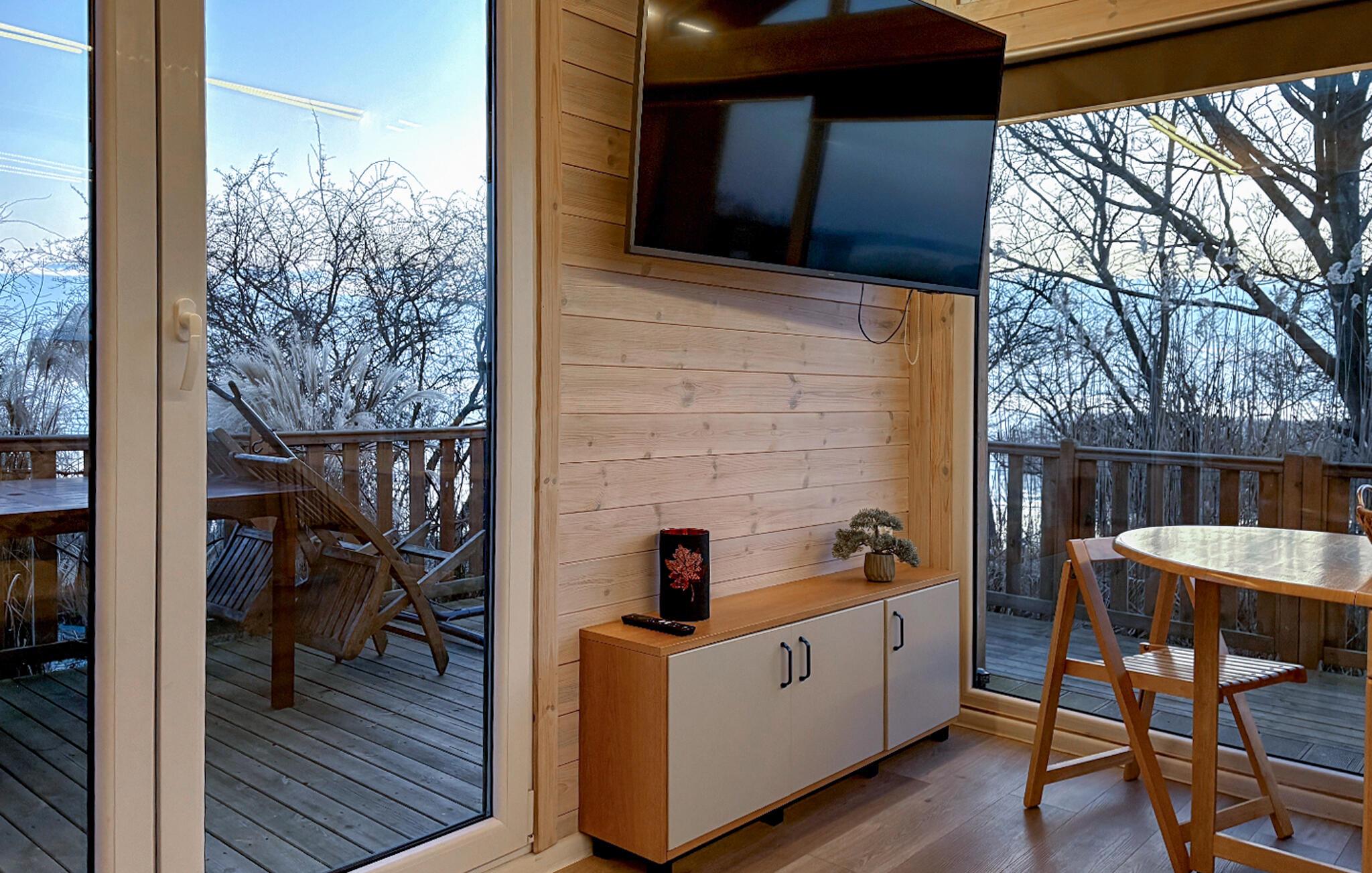 Nyd den unikke atmosfære i dette moderne tiny house med en rummelig terrasse og udsigt over Wicko Wielkie-søen. Den stilfulde indretning sikrer både komfort og hygge, og takket være den smarte rumopdeling udnyttes pladsen i den kompakte bolig optimalt. Et veludstyret tekøkken gør det nemt at tilberede lækre måltider, og den lille opholdsstue giver plads til afslappende stunder med familien.