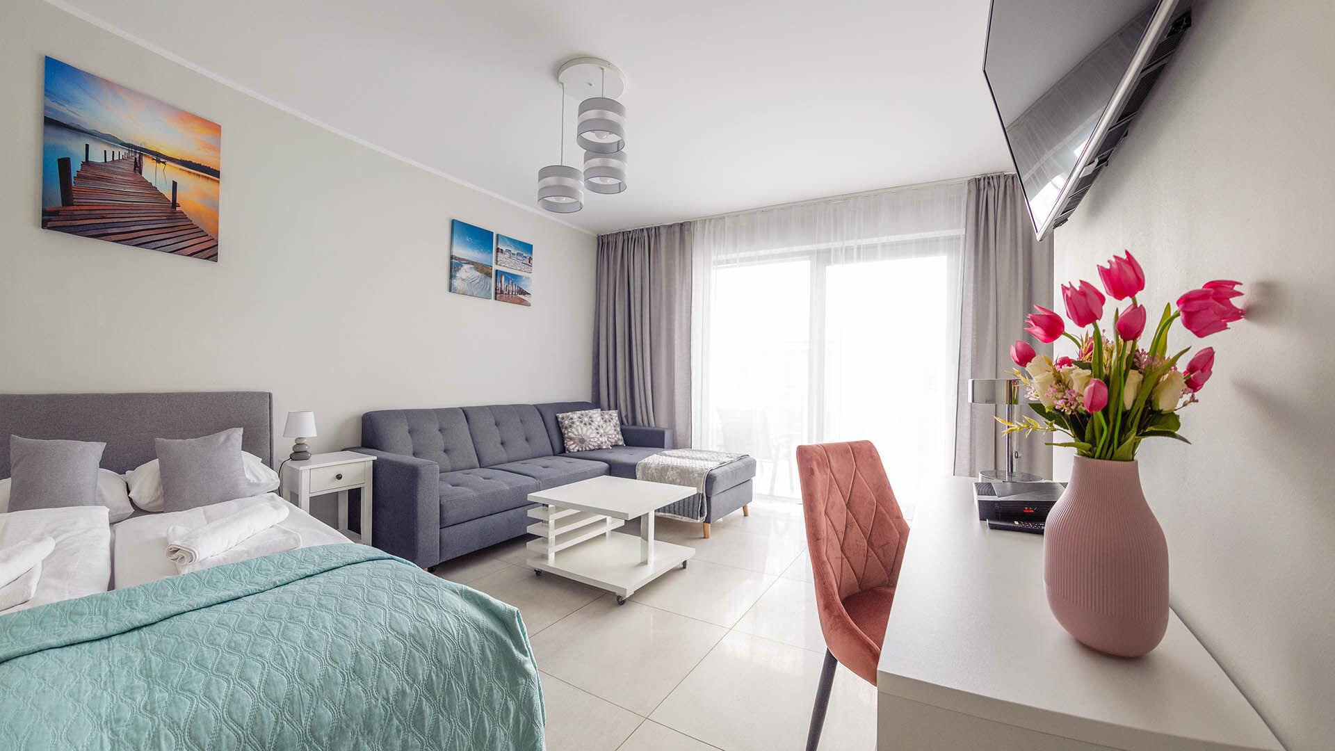 • Haustiere sind in der ausgewählten Wohnung erlaubt. Die Kosten für den Aufenthalt mit einem Haustier betragen 40 PLN pro Tag.
