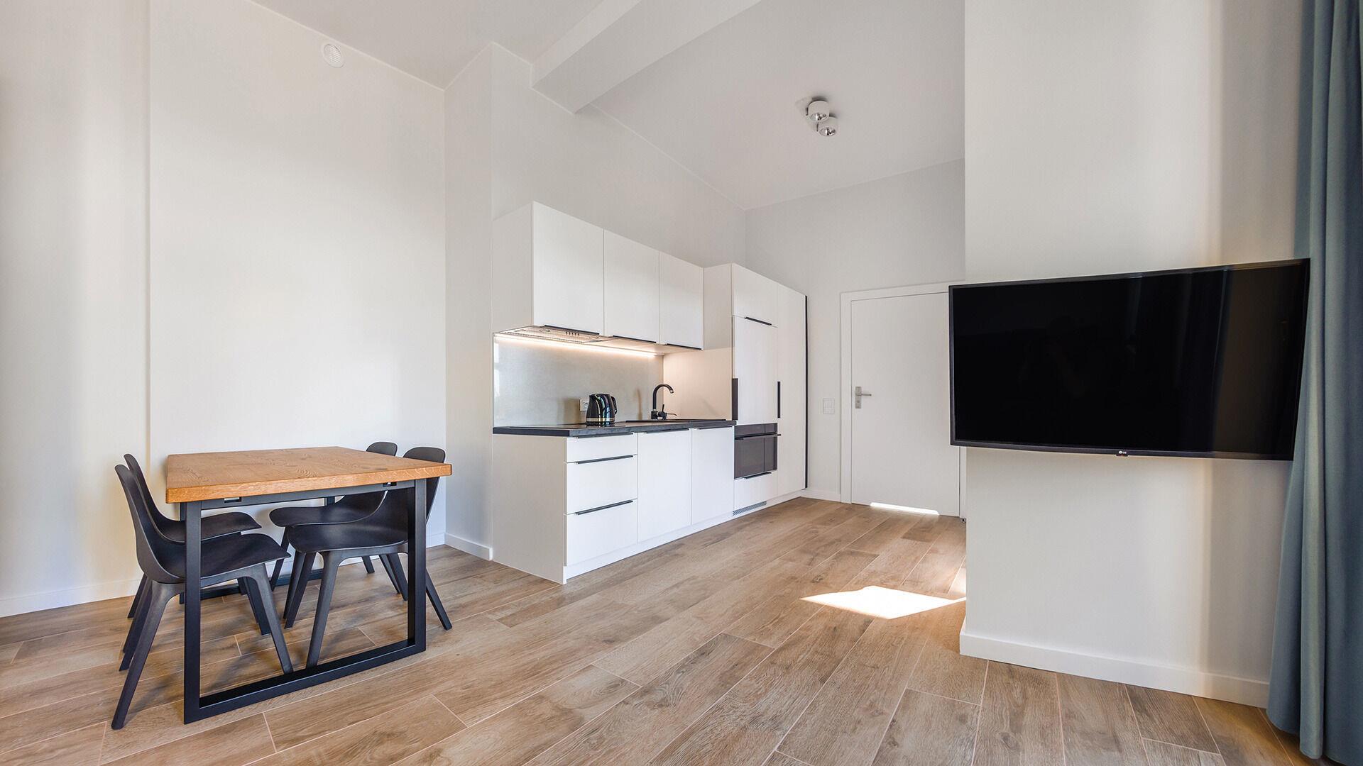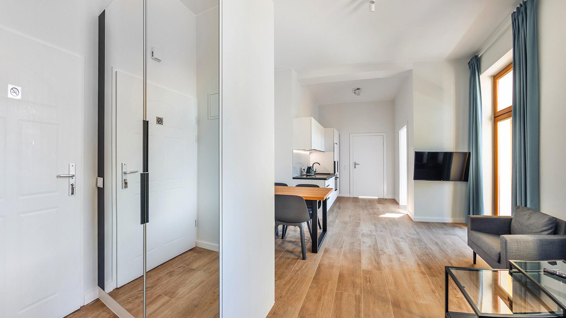 • Haustiere sind in der ausgewählten Wohnung erlaubt. Die Kosten für den Aufenthalt mit einem Haustier betragen 40 PLN pro Tag.