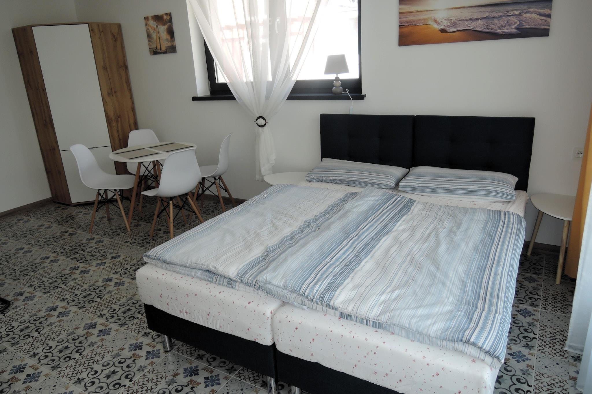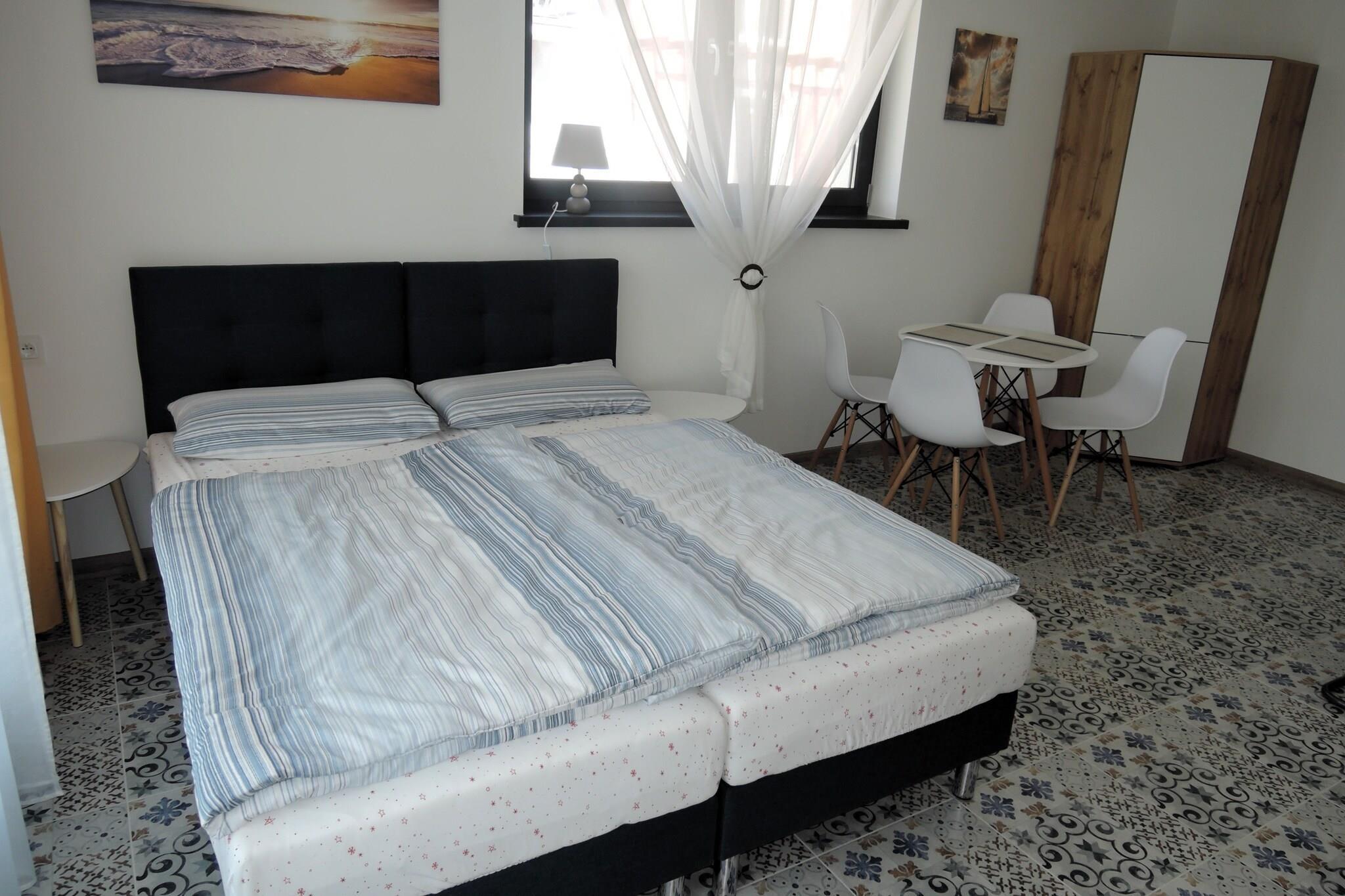 På 1. etage: (tekøkken(spisebord, elkedel, cooker, komfur(Komfur med to kogeplader, elektrisk), kaffemaskine, køle-fryseskab), Stue/soveværelse(dobbeltseng eller 2 enkeltsenge Senge, Fjernsyn(Tyske TV-kanaler)), badeværelse(bruser, håndvask, toilet)) Internetadgang, Parkering, terrasse(deles med andre gæster, 40 m2)