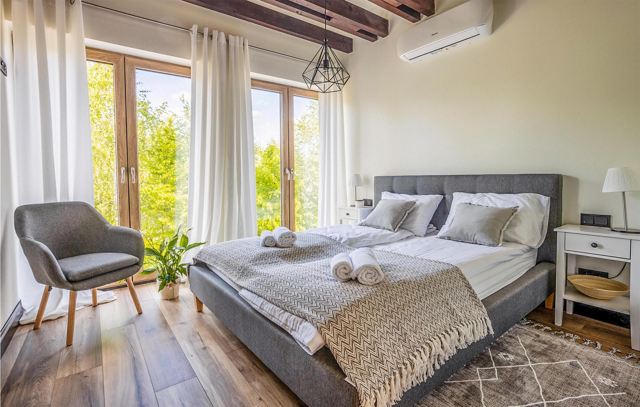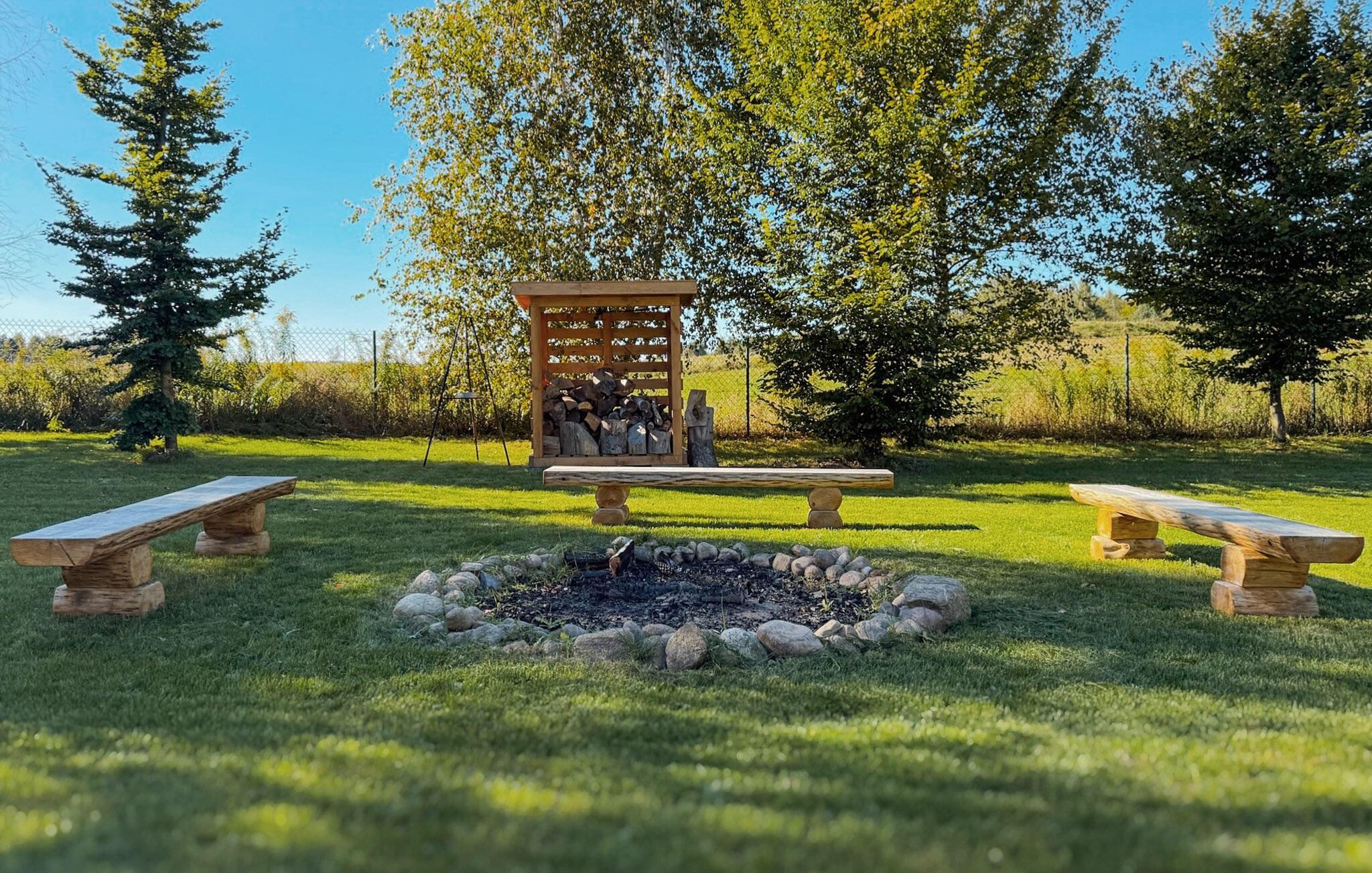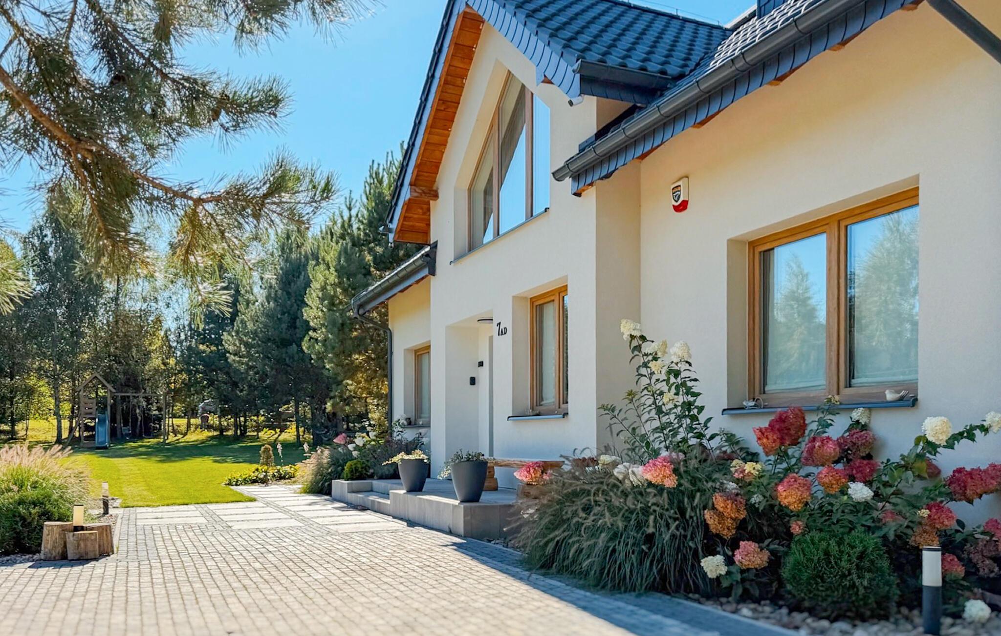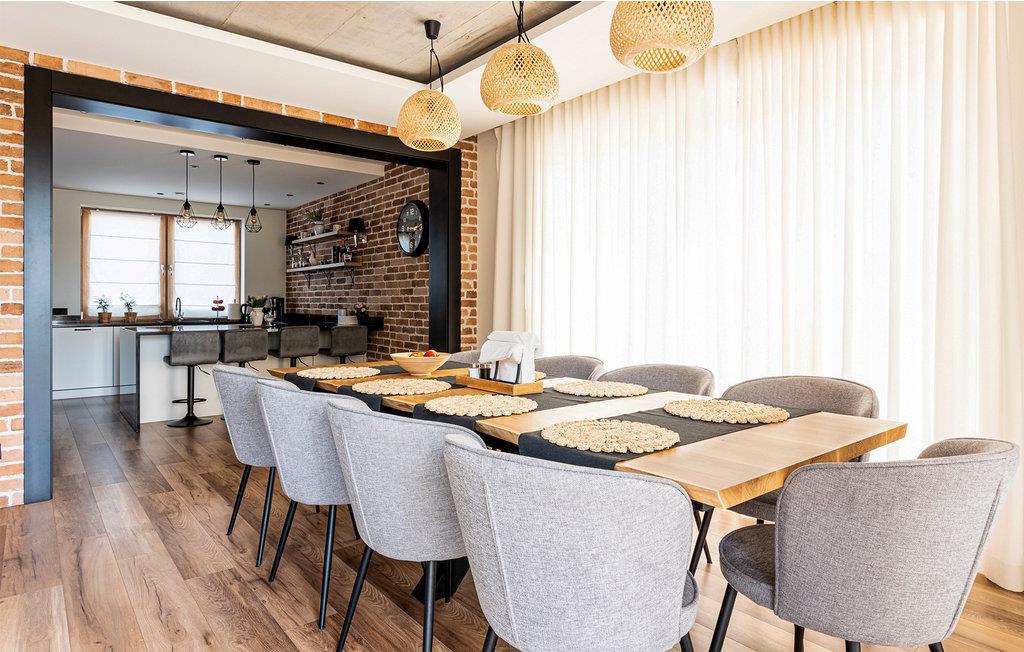 Velkommen til et stort, dejligt feriehus i Masurien. Her kan I nyde en skøn pause fra hverdagen og glæd jer til design, kvalitetsmøbler og hyggelige værelser at trække jer tilbage til. Nyd en kop te foran pejsen eller sammensæt lækre retter i det moderne køkken. Der er god plads til fællesspisning rundt om det lange spisebord eller på den delvist overdækkede terrasse. Her kan I også slappe af og læne jer tilbage i vildmarksbadet, mens børnene leger i haven.