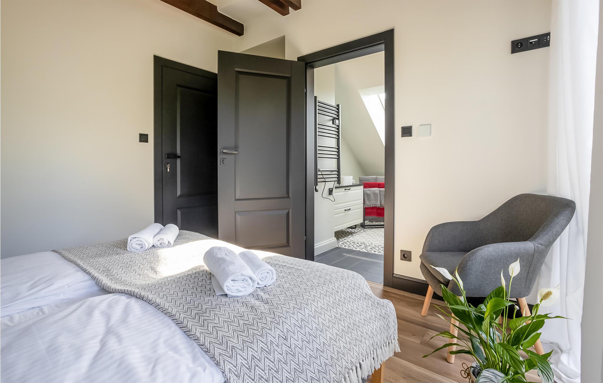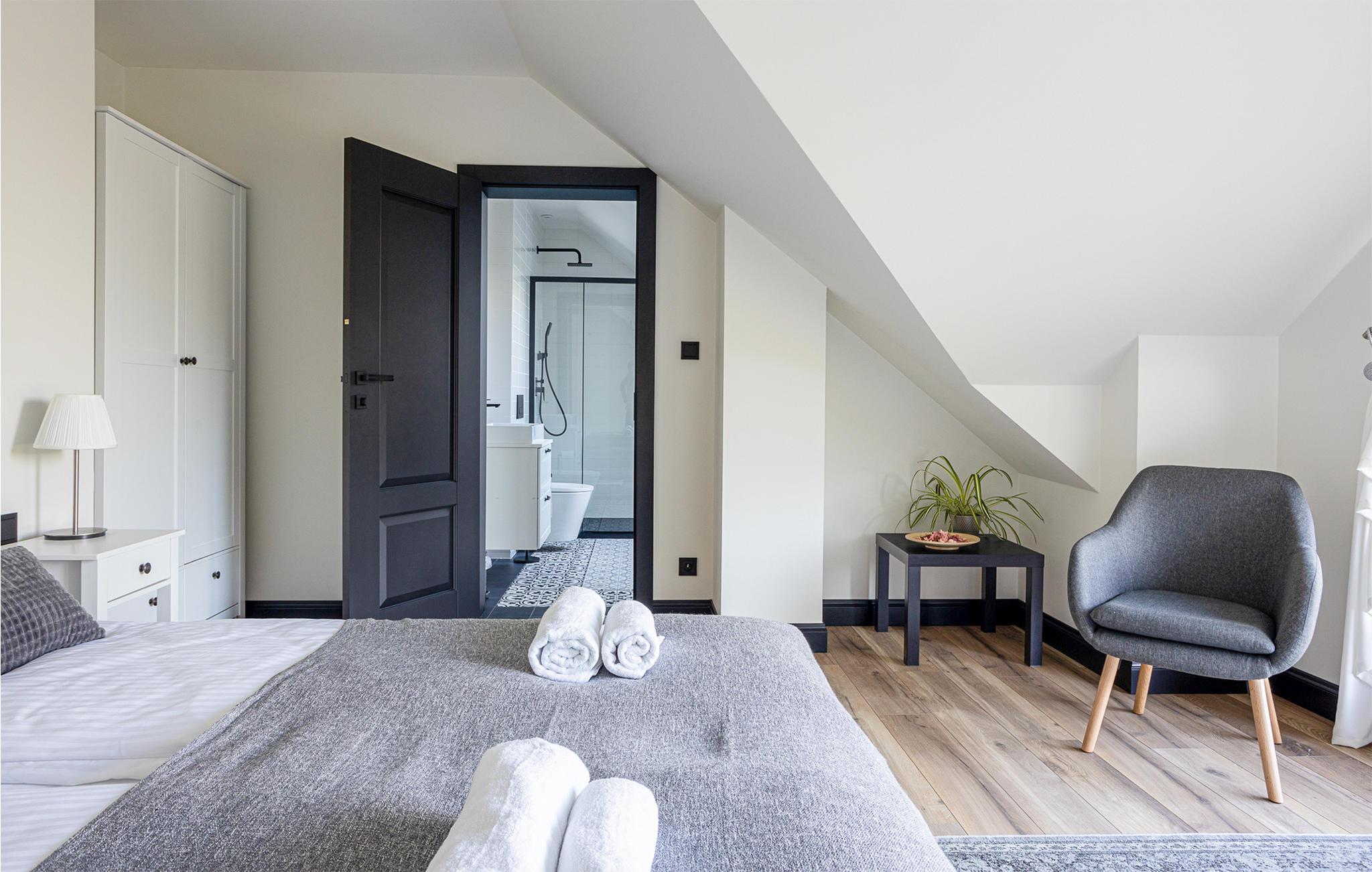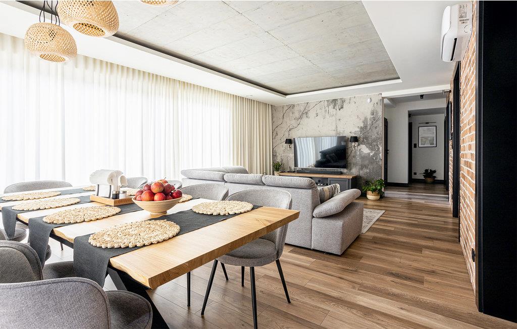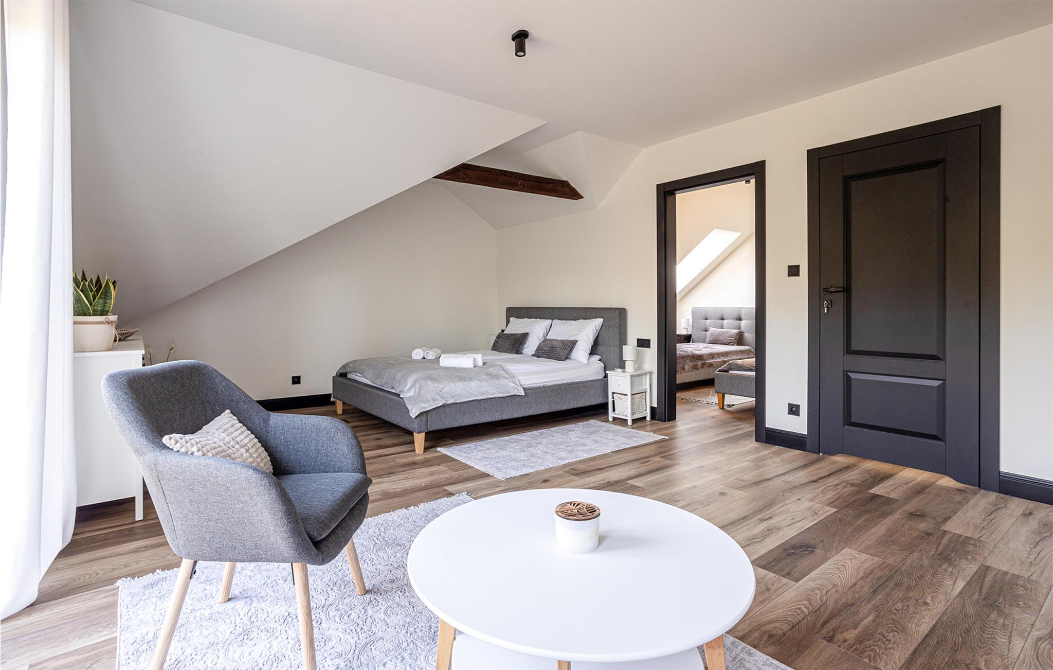 Velkommen til et stort, dejligt feriehus i Masurien. Her kan I nyde en skøn pause fra hverdagen og glæd jer til design, kvalitetsmøbler og hyggelige værelser at trække jer tilbage til. Nyd en kop te foran pejsen eller sammensæt lækre retter i det moderne køkken. Der er god plads til fællesspisning rundt om det lange spisebord eller på den delvist overdækkede terrasse. Her kan I også slappe af og læne jer tilbage i vildmarksbadet, mens børnene leger i haven.
