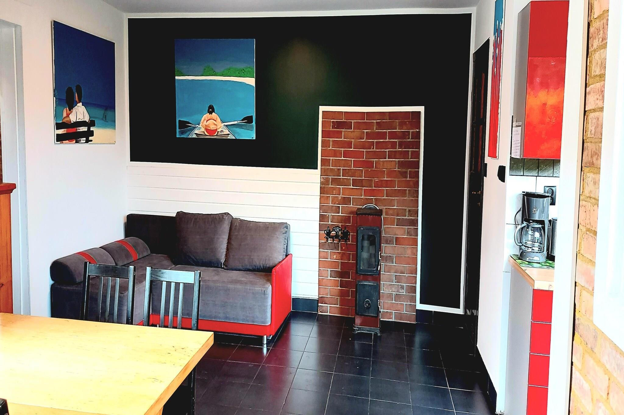 Stueetage: (tekøkken(kakkelovn, elkedel, kaffemaskine, ovn, køle-fryseskab), Stue/soveværelse(dobbeltsovesofa, Fjernsyn(parabol, Tyske TV-kanaler)), soveværelse(dobbeltseng), badeværelse(bruser, håndvask, toilet)) grill, terrasse, have, havemøbler, parkering, barnestol, havepejs, Haveskur, baby crib(free)