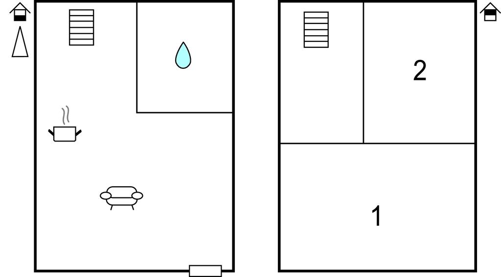 Huset ligger i et kompleks med 6 feriehuse. I stueetagen er der en stue med TV, tekøkken og badeværelse med brusekabine. En brændeovn skaber en hyggelig atmosfære. På 1. sal er der 2 separate soveværelser, og trappen er sikret med et gelænder.
