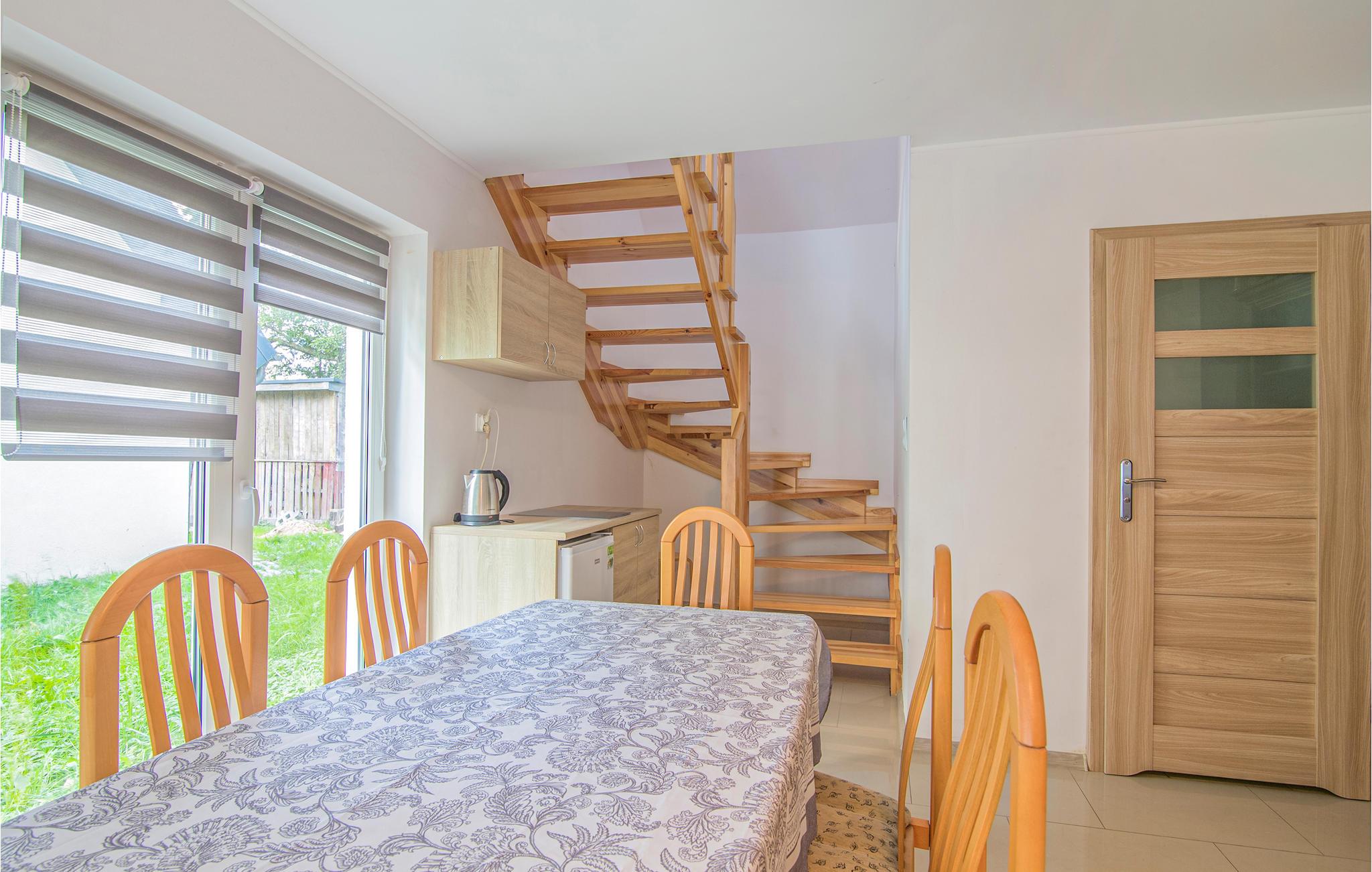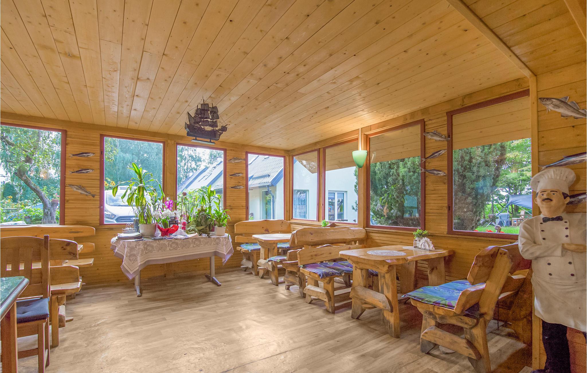 Feriekomplekset har en restaurant, hvor I kan spise eller få en dejlig drink. Det er også muligt at benytte røgeriet i komplekset. En båd eller kano er tilgængelig for gæsterne helt gratis; motor til båd kan lejes. Feriestedet tilbyder også sejlture på Vistula-lagunen. Det er et ideelt sted for lystfiskere.
