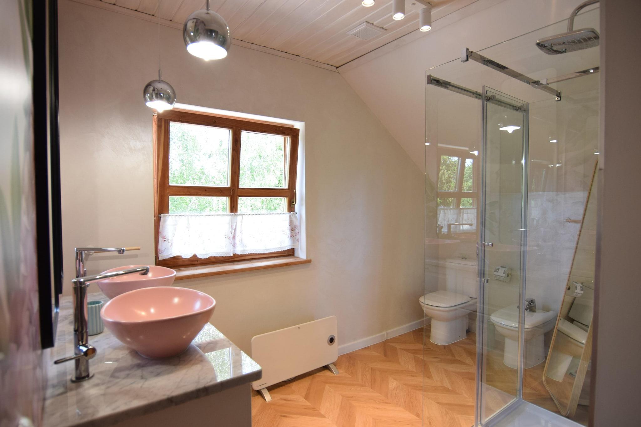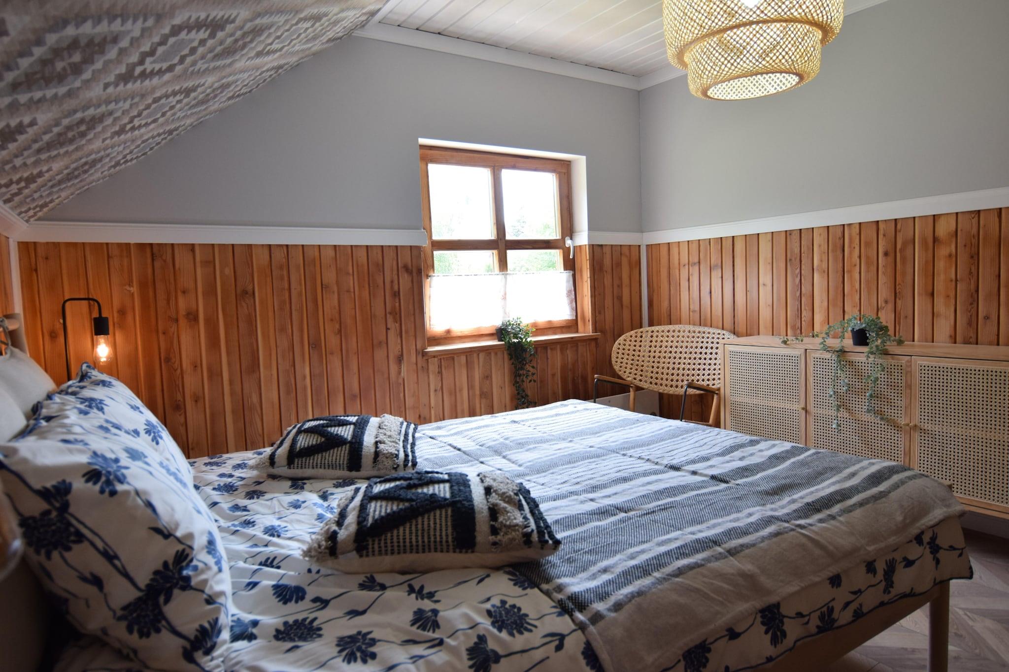 En unik ferievilla med exceptionelle fritidsfaciliteter (sauna, spabad med jacuzzi, sommerpool) i en smuk beliggenhed – en lille ferielandsby ved havet, direkte ved Choczewskie-søen (450 meter fra huset). Denne store toetagers ferievilla venter på dig på en privat, indhegnet grund. I stueetagen finder du en stue (TV, pejs) forbundet med en spiseplads og et veludstyret køkken (inklusive ovn, opvaskemaskine, komfur med 6 blus, kaffemaskine og vaskemaskine). Der er også et soveværelse og et toilet i stueetagen. Ovenpå er der tre separate soveværelser og et stort badeværelse med bruser. Ejendommen indeholder også et hyggeligt gæstehus med TV, badeværelse med bruser, tekøkken og soveplads til tre personer. Begge huse har elvarme og pejs i hovedbygningen. Grunden omfatter en charmerende vinterhave med havemøbler og en overdækket terrasse med en stor pejs og grill. Trådløst internet er tilgængeligt. På den velholdte ejendom (til eksklusiv brug for gæster) er der en sommerpool (åben fra 1. maj til 15. september), en sauna og et spabad med jacuzzi. Der er sikker parkering til rådighed. Prisen inkluderer: sengelinned, håndklæder, el, vand, gas, varme, brænde, sauna, jacuzzi, sommerpool (1. maj til 15. september), internet, parkering og slutrengøring. Barneseng og højstol er tilgængelige efter anmodning. Nærområdet byder på uforstyrret afslapning i kontakt med naturen. Den nærliggende sø er værd at cykle (eller endda gå) og besøge flere charmerende sandstrande. Søen er meget ren og indbydende til svømning og fiskeri (gedde, ål, suder). Du kan også besøge Zarnowieckie-søen, et større vandområde, hvor du kan leje vandsportsudstyr. Stranden ved havet ligger 13 km væk. Lykkelig afslapning er garanteret, da der selv i højsæsonen ikke er nogen folkemængder. Og udsigten er ekstraordinær, især i området omkring Lubiatowskie-klitterne.