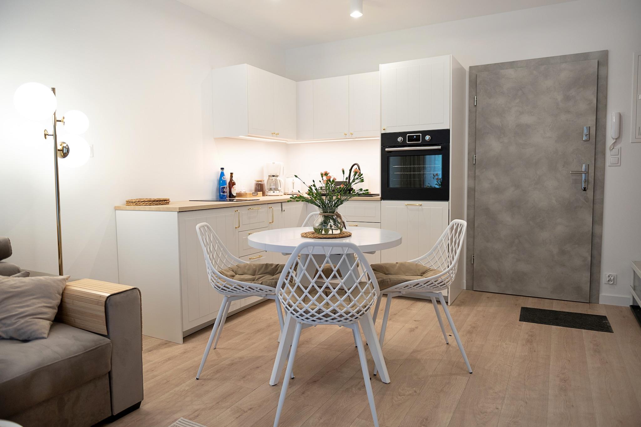 Beliggenhed i roligt område, 450 m fra havet. Ca. 500 m til centrum Det moderne lejlighedskompleks er et ideelt sted for en ferie. Komfortabel ferielejlighed i stueetagen. Det har en stor terrasse med et sæt havemøbler. Lejligheden består af en stue i forbindelse med køkkenet, et soveværelse og et badeværelse med bruser. I stuen er der en dobbelt sovesofa, et bord med stole og et tv. Køkkenet er perfekt udstyret (inklusive ovn, komfur, mikroovn, opvaskemaskine, kaffemaskine). Soveværelset har en komfortabel dobbeltseng. Lejligheden er udstyret med vaskemaskine, strygejern og hårtørrer. Der er en stor altan. Centralvarme. Trådløst internet tilgængeligt. Komplekset har en indendørs swimmingpool. Gæsterne kan bruge det gratis. Prisen for opholdet inkluderer: el- og vandforbrug, swimmingpool, internet, parkering, barneseng og høj stol (forudgående reservation nødvendig). Pobierowo er en badeby med en ren strand og et bevogtet svømmeområde. Her er også en fiskebase, perfekt som baggrund for souvenirbilleder. Pobierowo er et perfekt sted for børn, atleter og elskere. Der er mange romantiske steder for to her. Der er et papegøjehus, et oceanarium og kæmpe oppustelige legepladser. Børn vil blive glade for et besøg i Whale Park i den nærliggende Rewal (ca. 7 km). Byens og hele regionens stolthed er den renoverede smalsporede jernbane, som giver dig mulighed for at tage på en charmerende tur til nærliggende feriesteder.