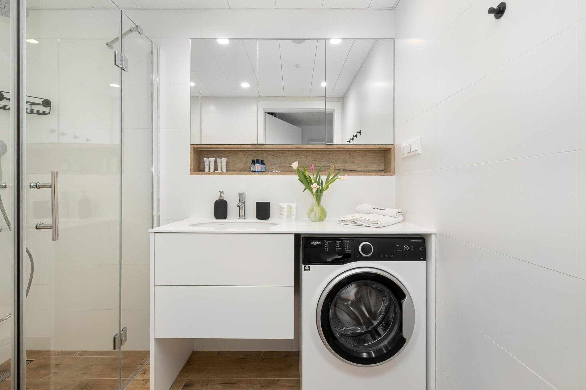 På 2. etage: (åbent køkken(kogeplade(Komfur med to kogeplader, induktion), elkedel, emhætte, kaffemaskine, opvaskemaskine , køle-fryseskab), stue / spisestue(dobbeltsovesofa, Fjernsyn(fladskærm), spisebord), soveværelse(dobbeltseng), badeværelse(bruser, håndvask, toilet, vaskemaskine, føntørrer)) Internetadgang, Parkering, Legeområde, Bubble bath(deles med andre gæster, indendørs, varmelegeme, 7 personer), sauna(deles med andre gæster, indendørs), balkon, varme(gennem aircondition), klimaanlæg, havemøbler, swimmingpool(deles med andre gæster, opvarmes, indendørs, inkl. separat børne swimmingpool (maks. dybde 50 cm), 20 x 6 m., opened from Jan upto and including Dec), elevator, barnestol, strygebræt, strygejern, baby crib(free)