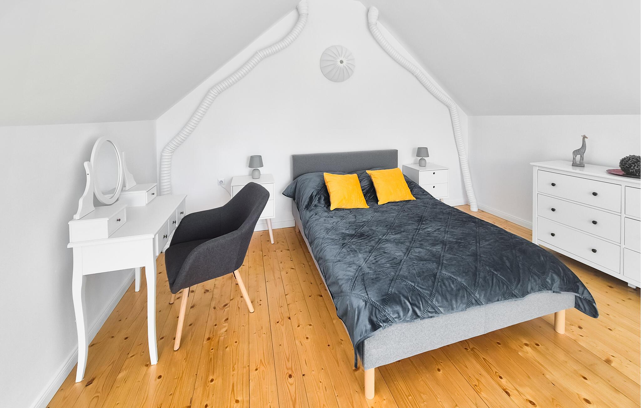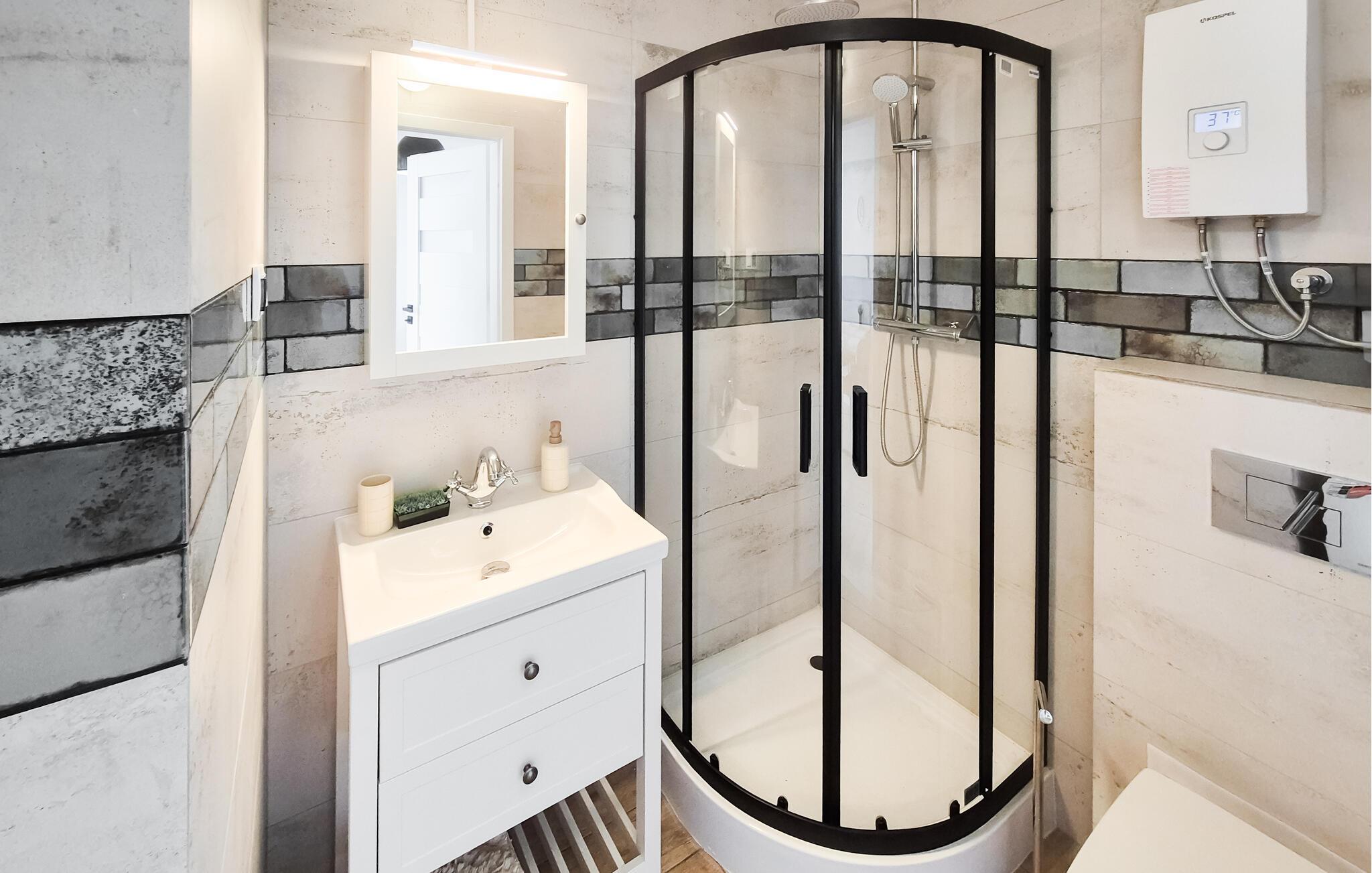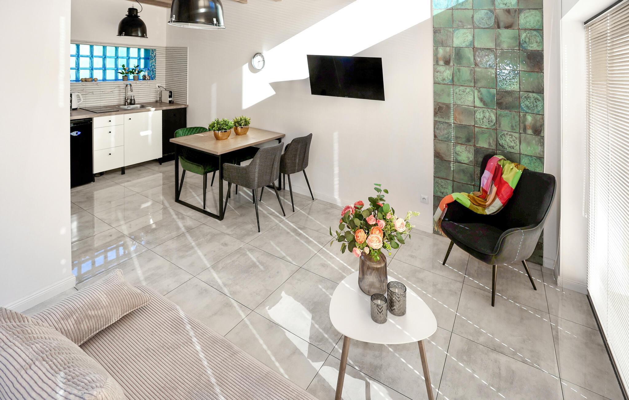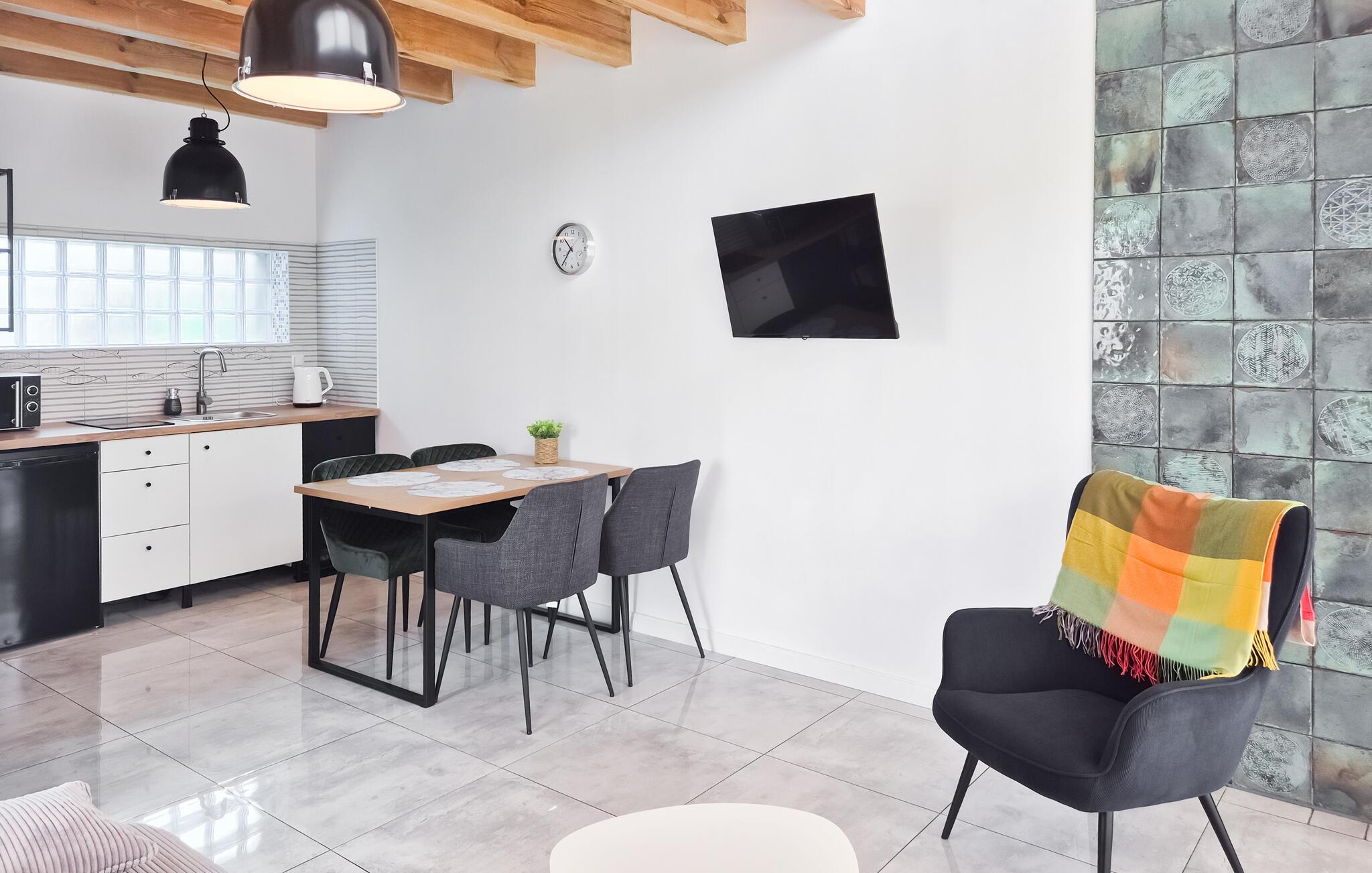 I Podamirowo venter jeres moderne feriehus, som er ideelt til afslappende dage i naturen. I den lyse, moderne stue- og spisestue indbyder komfortable siddepladser til afslapning, mens træbjælkerne i loftet skaber en rustik stemning. Nyd hyggelige aftener med brætspil eller slap af med en god bog.