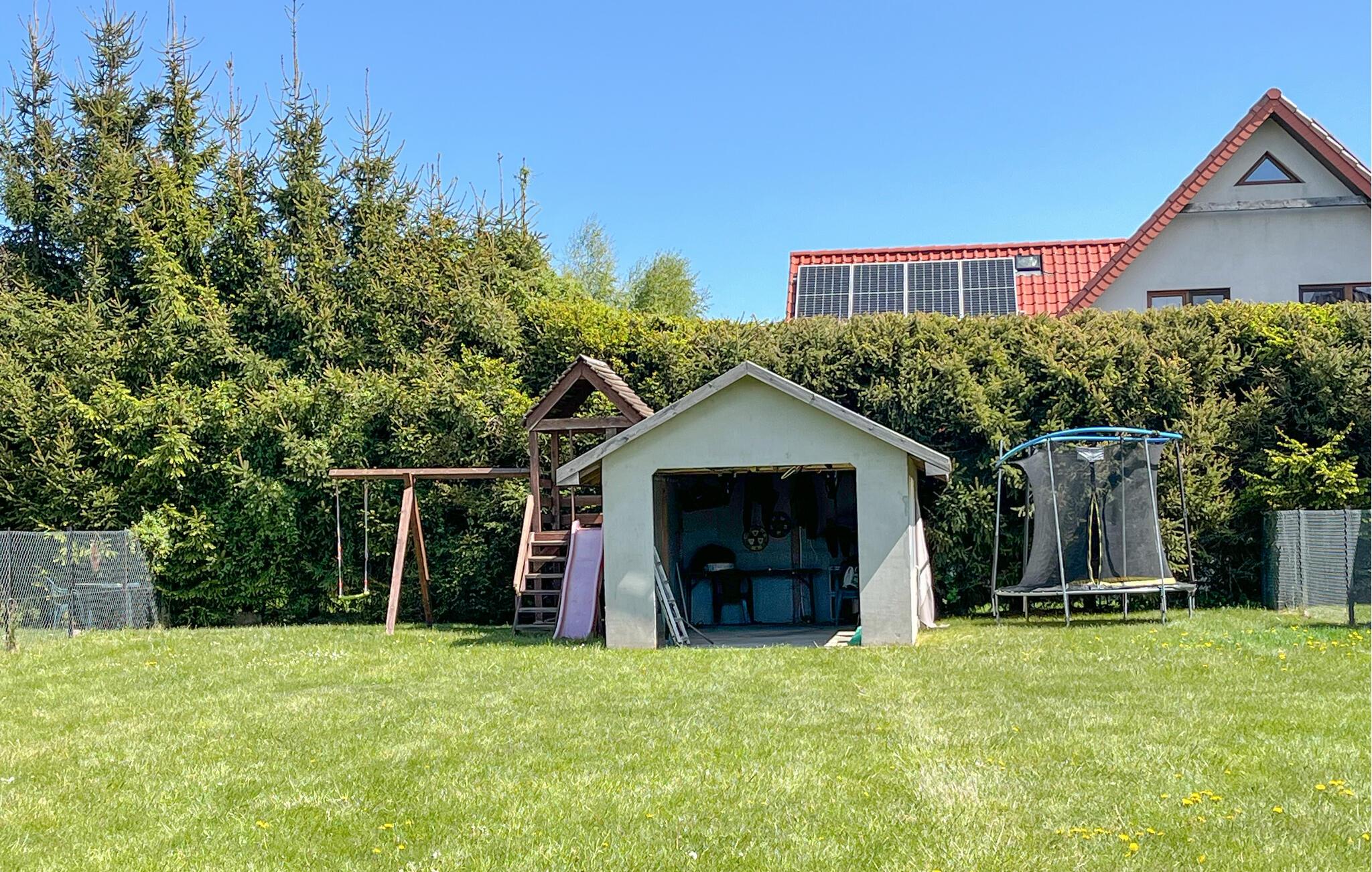 Tag plads på terrassen og start jeres morgen med morgenmad udendørs. Se børnene lege i den indhegnede have eller vær med til en fodboldkamp på græsplænen. En trampolin, en gynge og et legehus giver variation og motion. Her har både unge og gamle masser af plads til at boltre sig.
