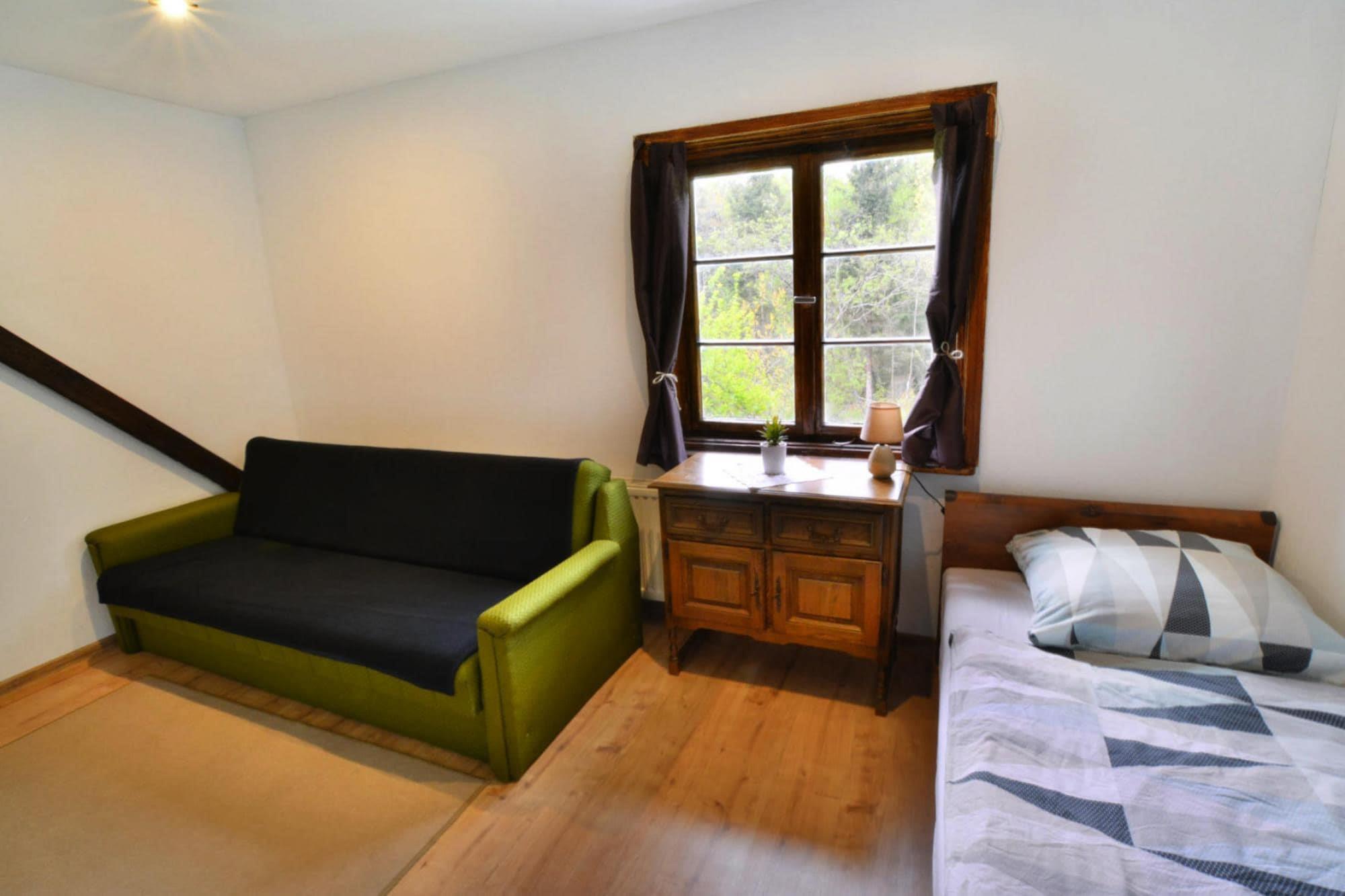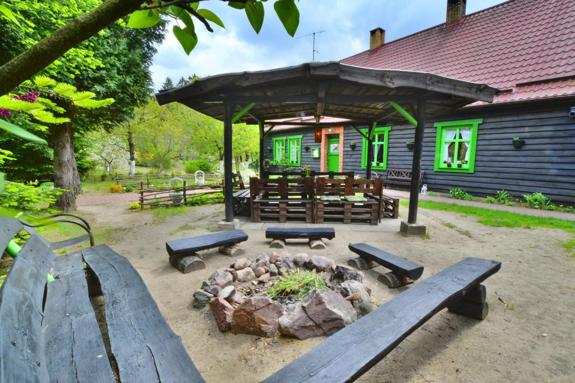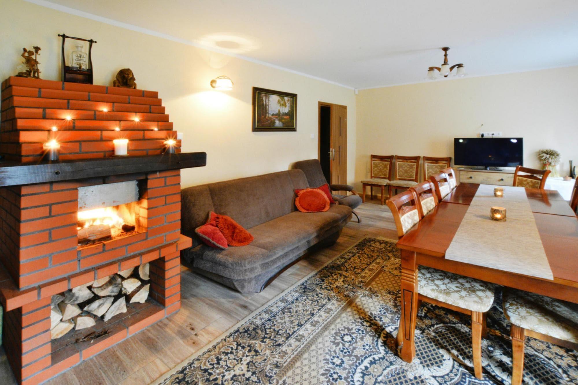 Midt i skoven, i en oase af fred og ro, ligger et komfortabelt feriehus i en restaureret skovfogedhytte. Gæsterne råder over hele 10.000 m2 privat areal - en ideel ramme for alle former for familiespil og underholdning. Feriehuset er i 2 etager. I stueetagen er der en rummelig stue med stort bord, pejs og TV. Fra stuen er der direkte udgang til terrassen med udsigt over den private dam. I stueetagen er der 3 separate soveværelser, 4 badeværelser (3 med bruser, 1 med badekar) og et veludstyret køkken (inklusive komfur, ovn, kaffemaskine, mikroovn, opvaskemaskine). På første sal er der yderligere 5 soveværelser og 3 badeværelser (2 med badekar, 1 med bruser). Der er også et ekstra tekøkken ovenpå. Centralvarme. Huset er udstyret med vaskemaskine. Trådløst internet er tilgængeligt. I det velholdte område kan gæsterne nyde en sommer swimmingpool (vandet er ikke opvarmet, åbent fra 15. juni til 15. september), en parkeringsplads, en legeplads, haven shelters, bålplads og grilludstyr. Der er også en charmerende dam med en romantisk bro. Ejeren af ??anlægget tilbyder lokale produkter, som hun personligt tilbereder: hjemmebagt brød, syltetøj og andre konserves. Prisen for opholdet inkluderer: sengelinned, håndklæder, el- og vandforbrug, ophold med hund (max 1), slutrengøring, parkering, internet. Attraktioner i området: Denne placering er ikke kun hvile og afslapning, men også svampeplukning, skovvandring, cykling og bærplukning. Den fred og ro, der hersker her, giver dig mulighed for at bryde væk fra hverdagen, fra livets høje tempo og nyde fuglesangen, frøernes kvækken og frem for alt ren luft. Der er cirka 20 km til den store provinsby (Koszalin), hvor der er talrige restauranter, caféer, butikker og store indkøbscentre. Der er også et stort, attraktivt vandland i Koszalin. Den nærmeste strand ved havet er i Lazy (også Mielno og Dabki i nærheden).