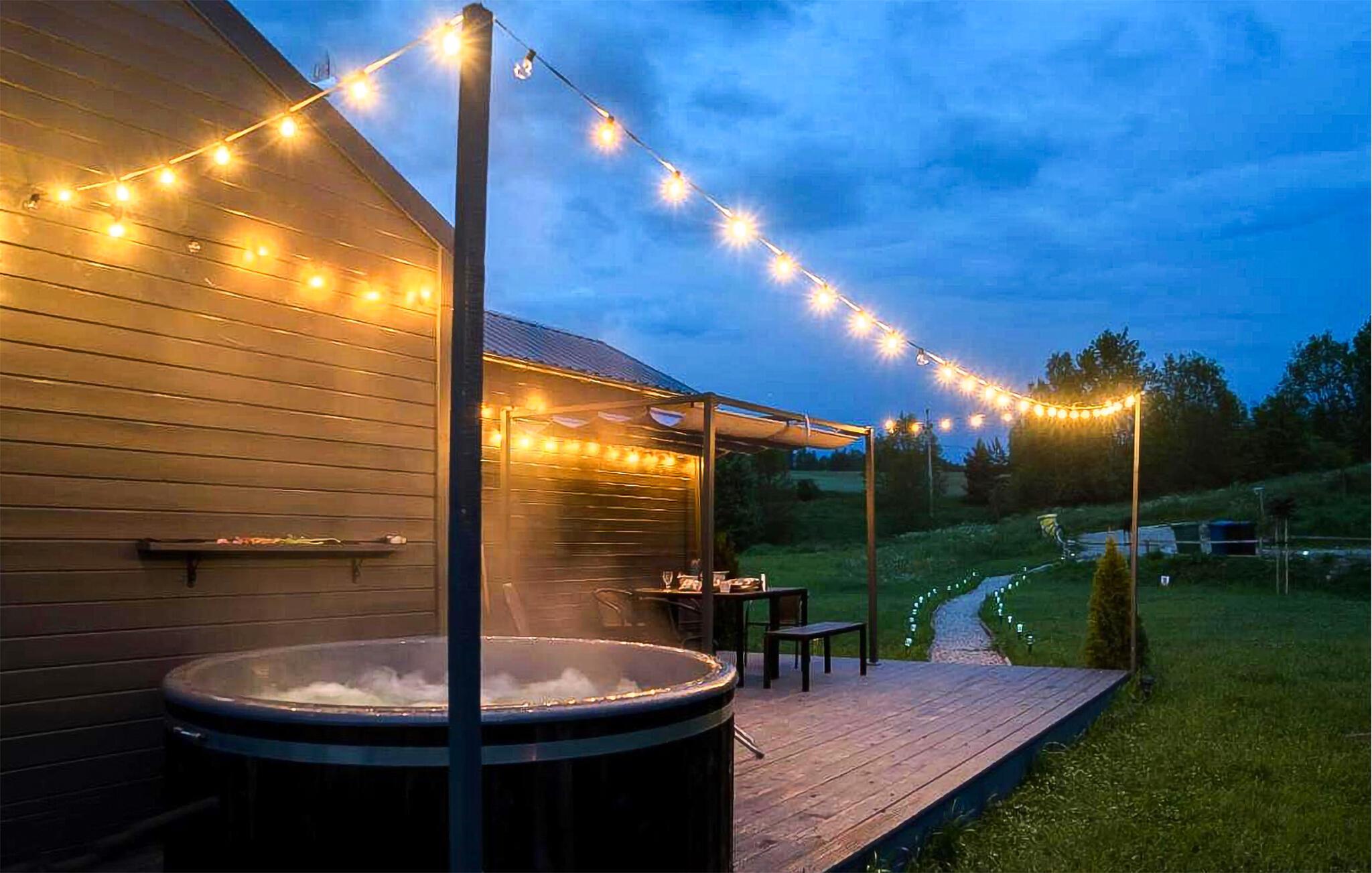 Murstensvægge, rustikke trædøre og en hyggelig brændeovn skaber en indbydende atmosfære for hele jeres familie. Udstyret med moderne møbler og med sans for detaljer er huset et perfekt tilflugtssted. Nyd jeres morgenkaffe på terrassen, mens børnene leger på de omkringliggende marker, og afslut aftenen afslappet foran brændeovnen. Derudover kan I slappe af i udendørs spabadet og nyde den stjerneklare nattehimmel.