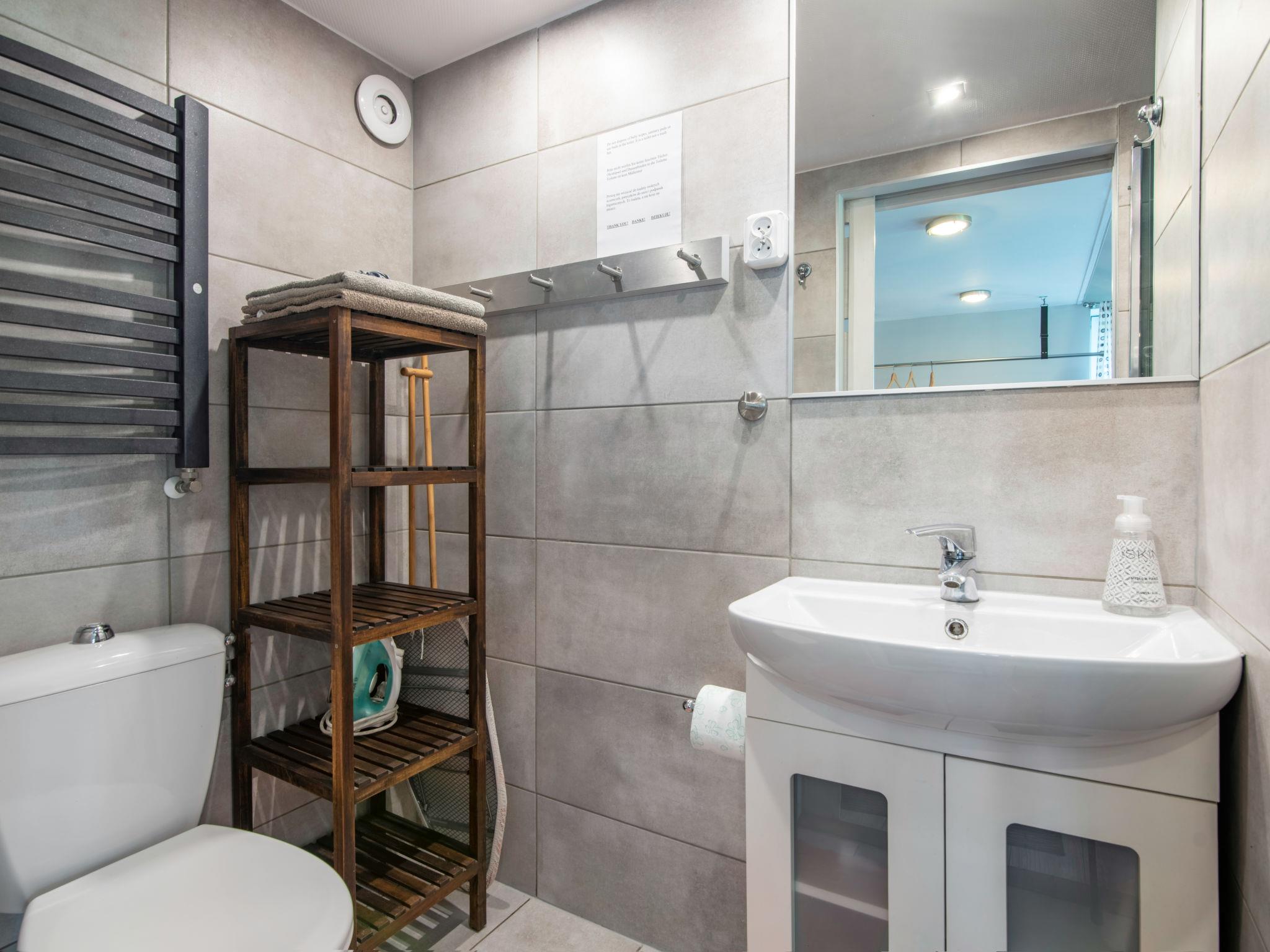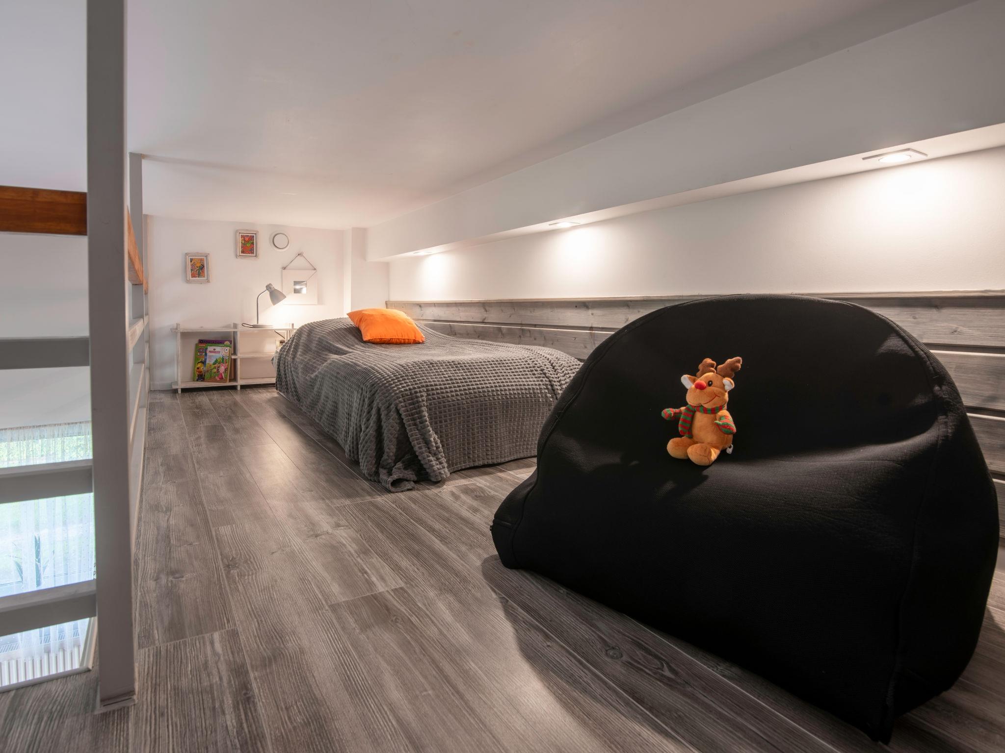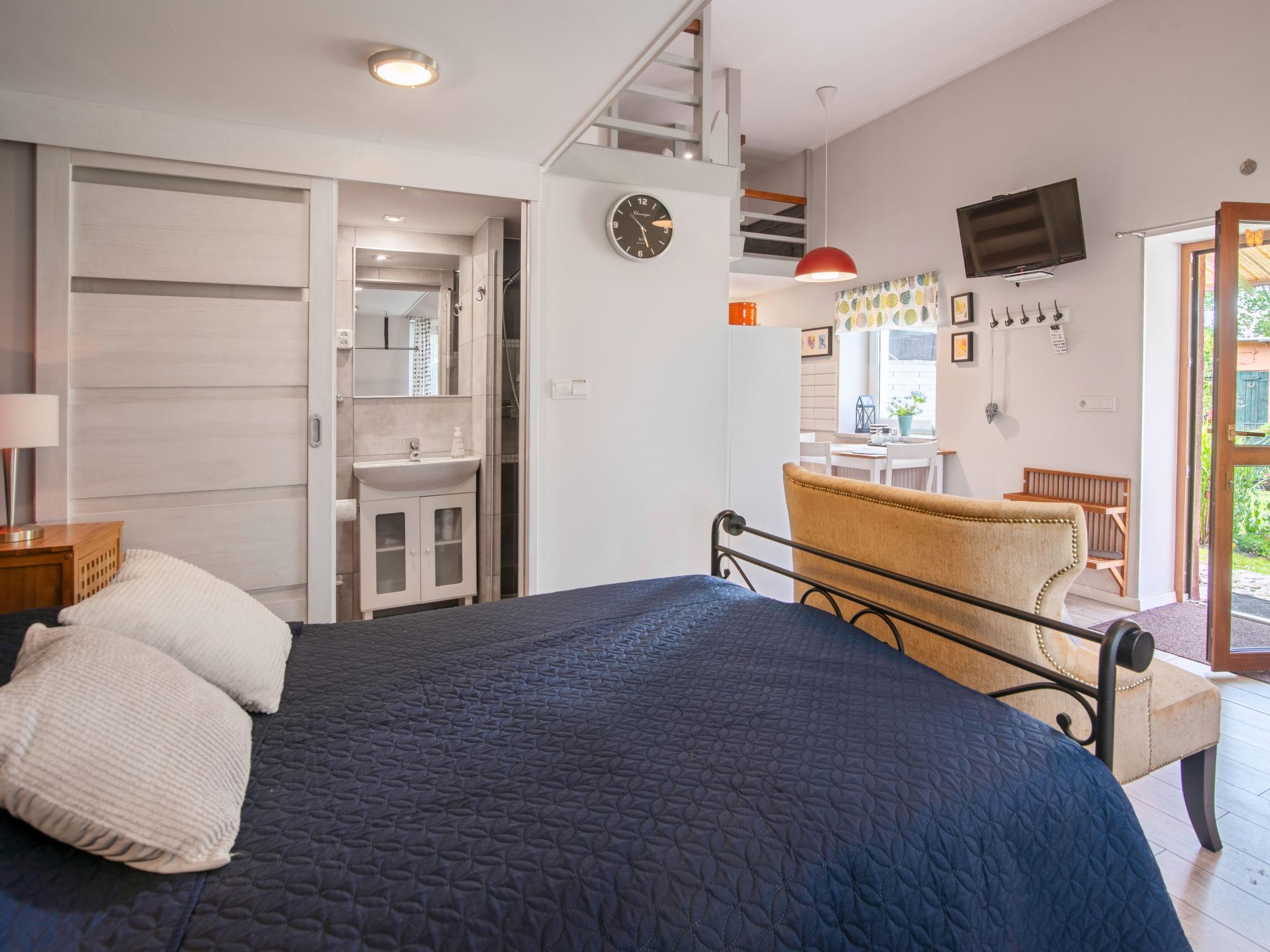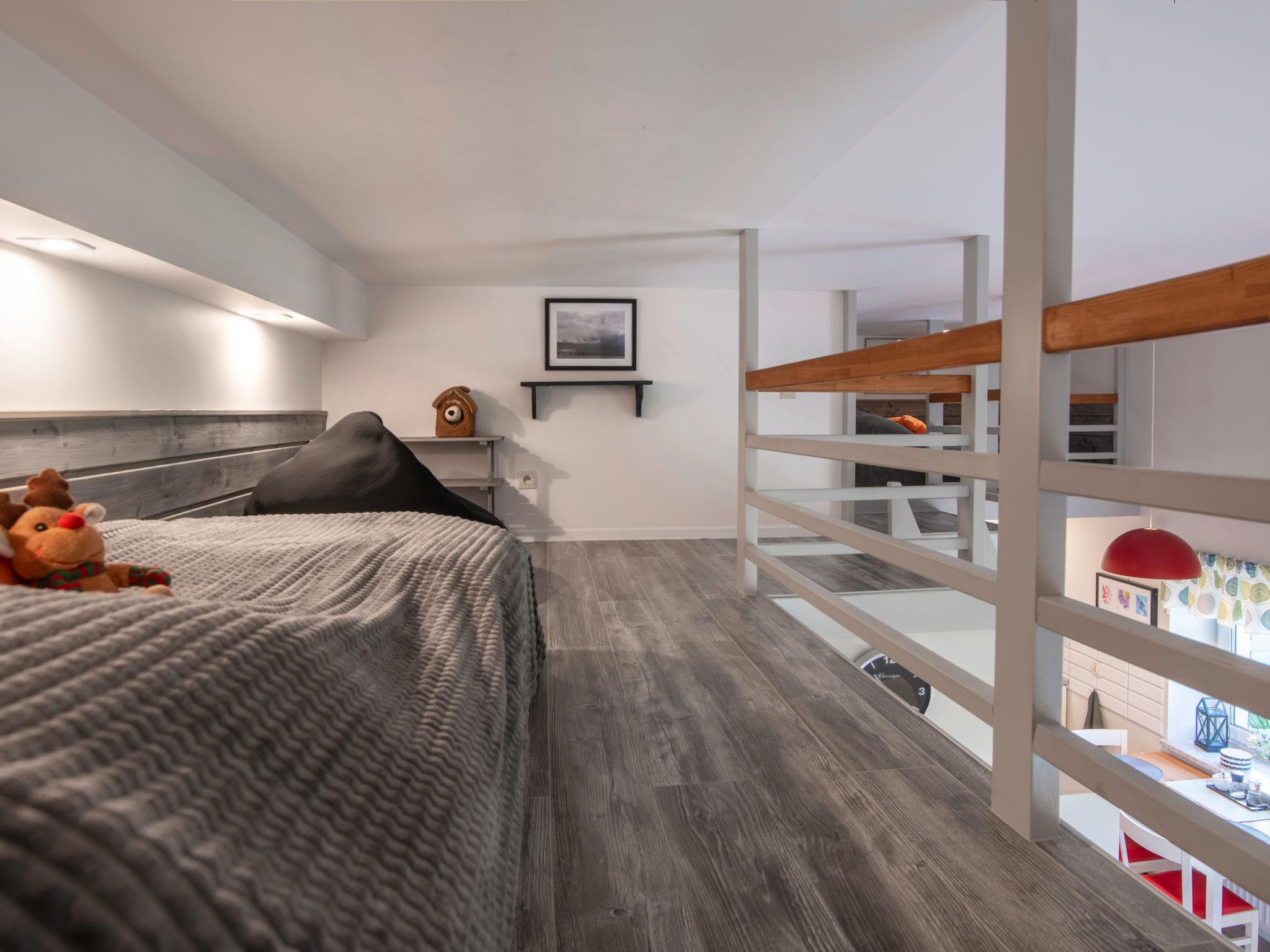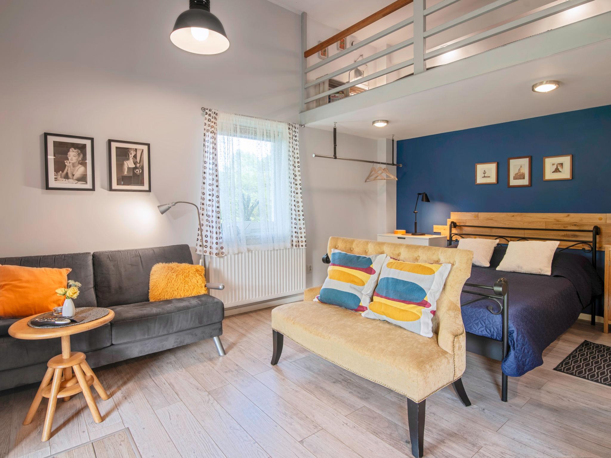 1-room apartment 44 m2 on 2 levels, on the ground floor. Open living/sleeping room with 1 double bed (140 cm, length 200 cm), TV. Gallery with 2 sleeping facilities (80 cm, length 200 cm). Open kitchen (2 hot plates, microwave, freezer). Shower/WC. Heating, electric heating, boiler (50 litres). Balcony furniture, deck chairs (2). Facilities: Internet (WiFi). Please note: private entrance, smoke alarm. Instead of an enclosed bedroom, some sleeping areas are located in an open-plan area (gallery, alcove, etc.).