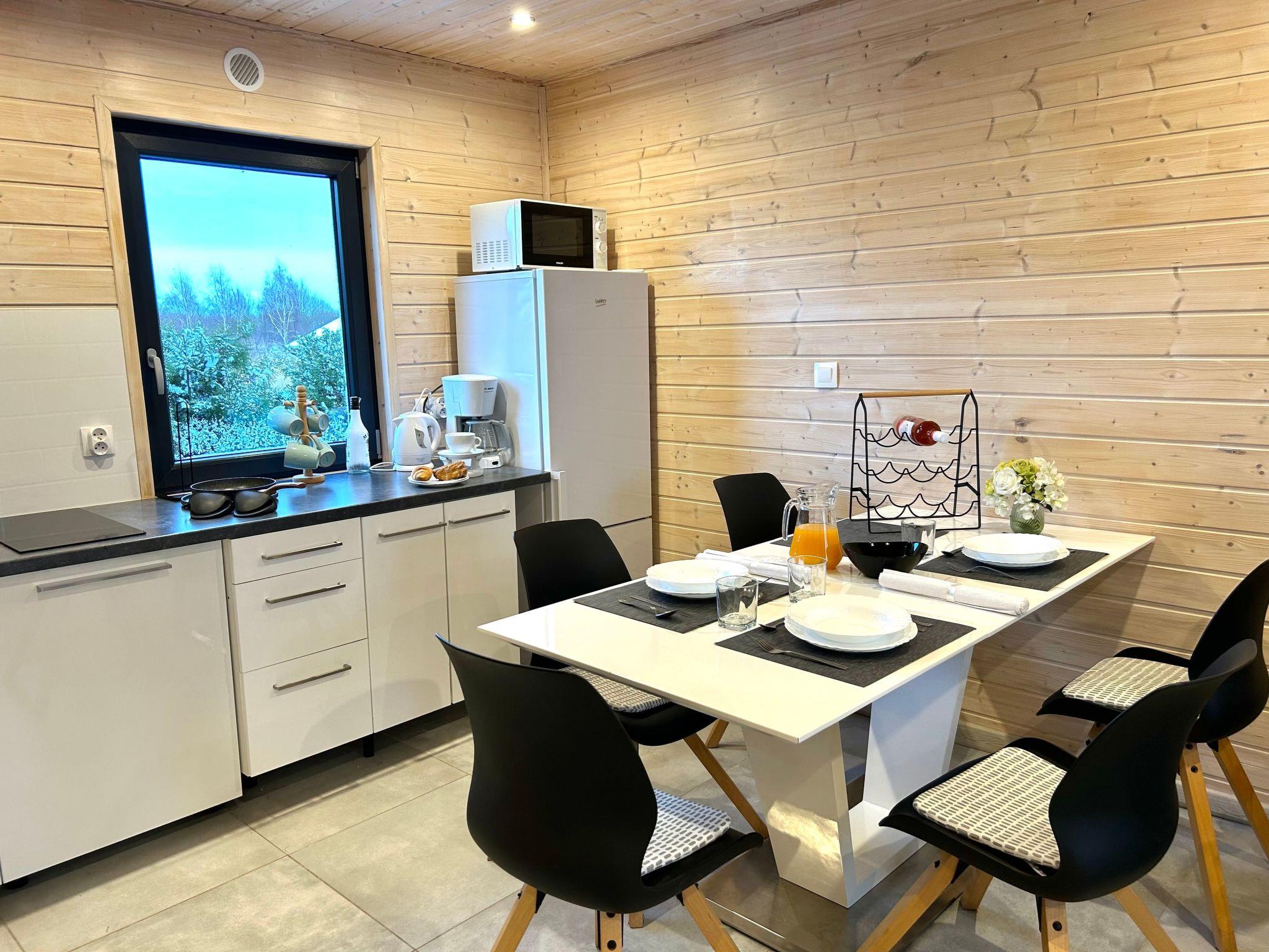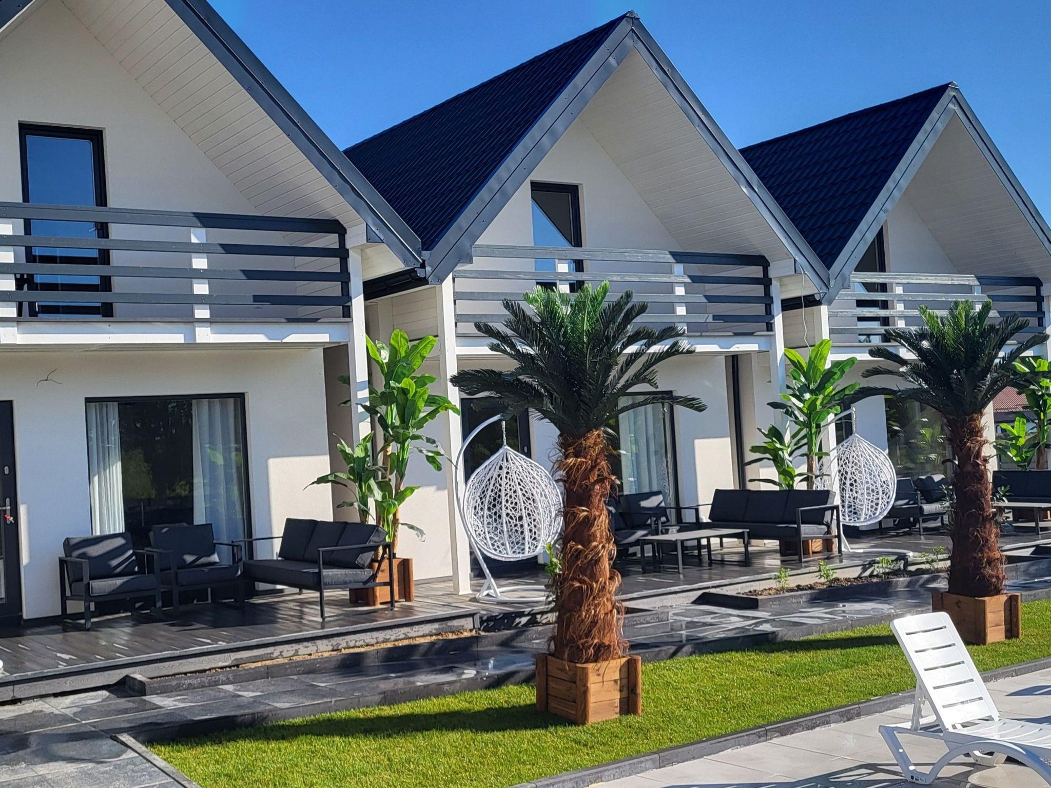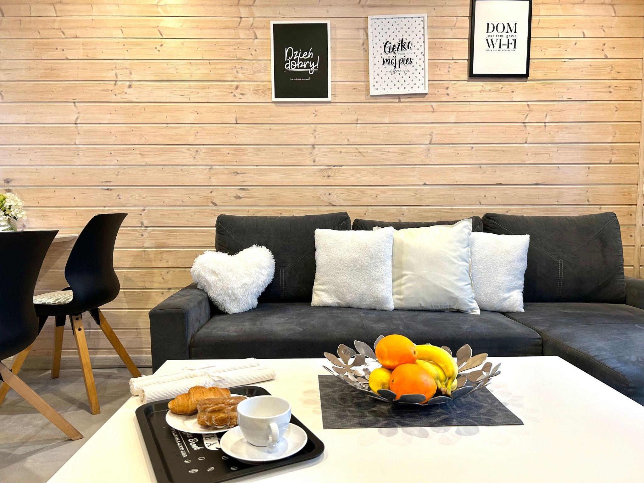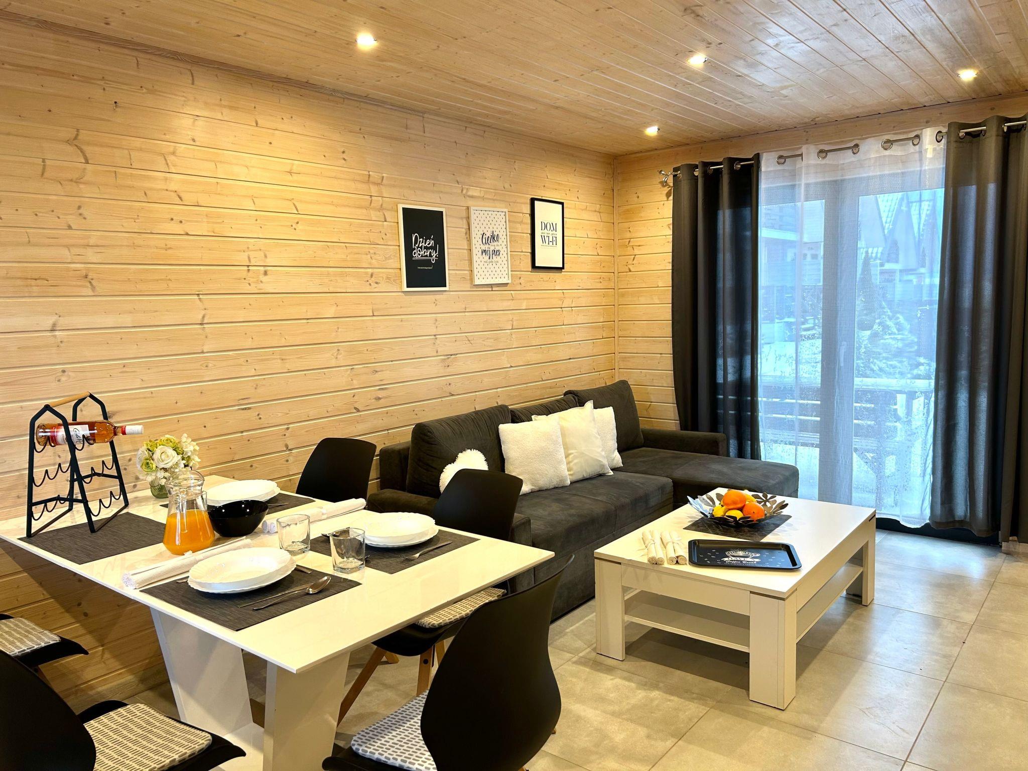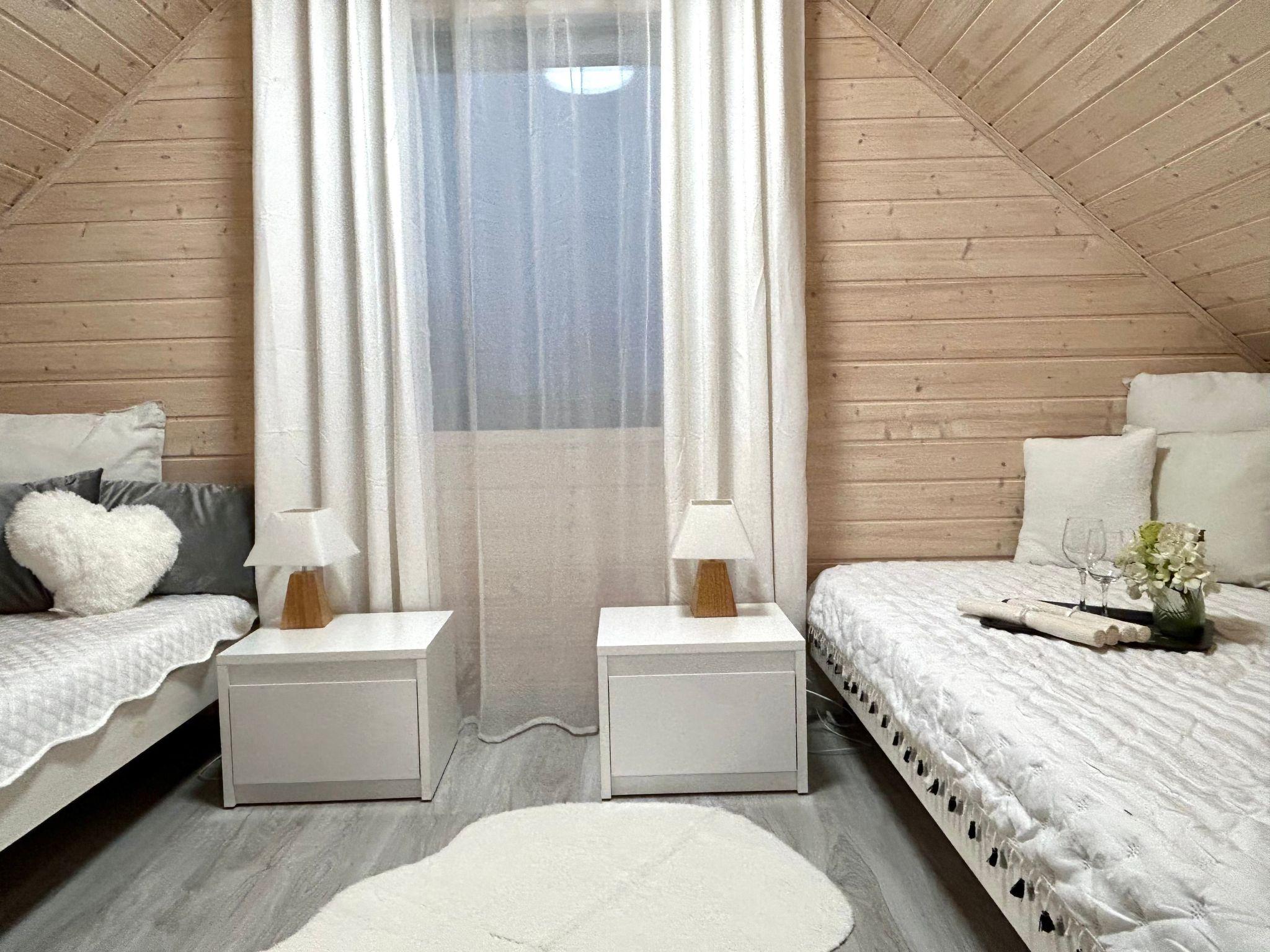 We offer a comfortable cottage with 2 bedrooms. In one bedroom there are 2 double beds. They are large and very comfortable. In the second bedroom there is a double bed and a single bed. From the bedroom there is an exit to the balcony. On the ground floor there is a living room with a kitchenette with access to the terrace. The living room has a corner sofa with a sleeping function for 2 persons, a bench, a single wardrobe and a chest of drawers. The kitchenette is equipped with a cooker, fridge-freezer, kettle, coffee maker, microwave and all other necessary utensils such as glasses, cups, plates, cutlery, pots. In this area there is a table with chairs where you can dine comfortably and conveniently. The bathroom has a shower, toilet and washbasin. A hairdryer is provided. The bathroom has underfloor heating. The cottages are heated and cooled with air conditioning . In autumn and spring they are additionally heated with radiators as required.