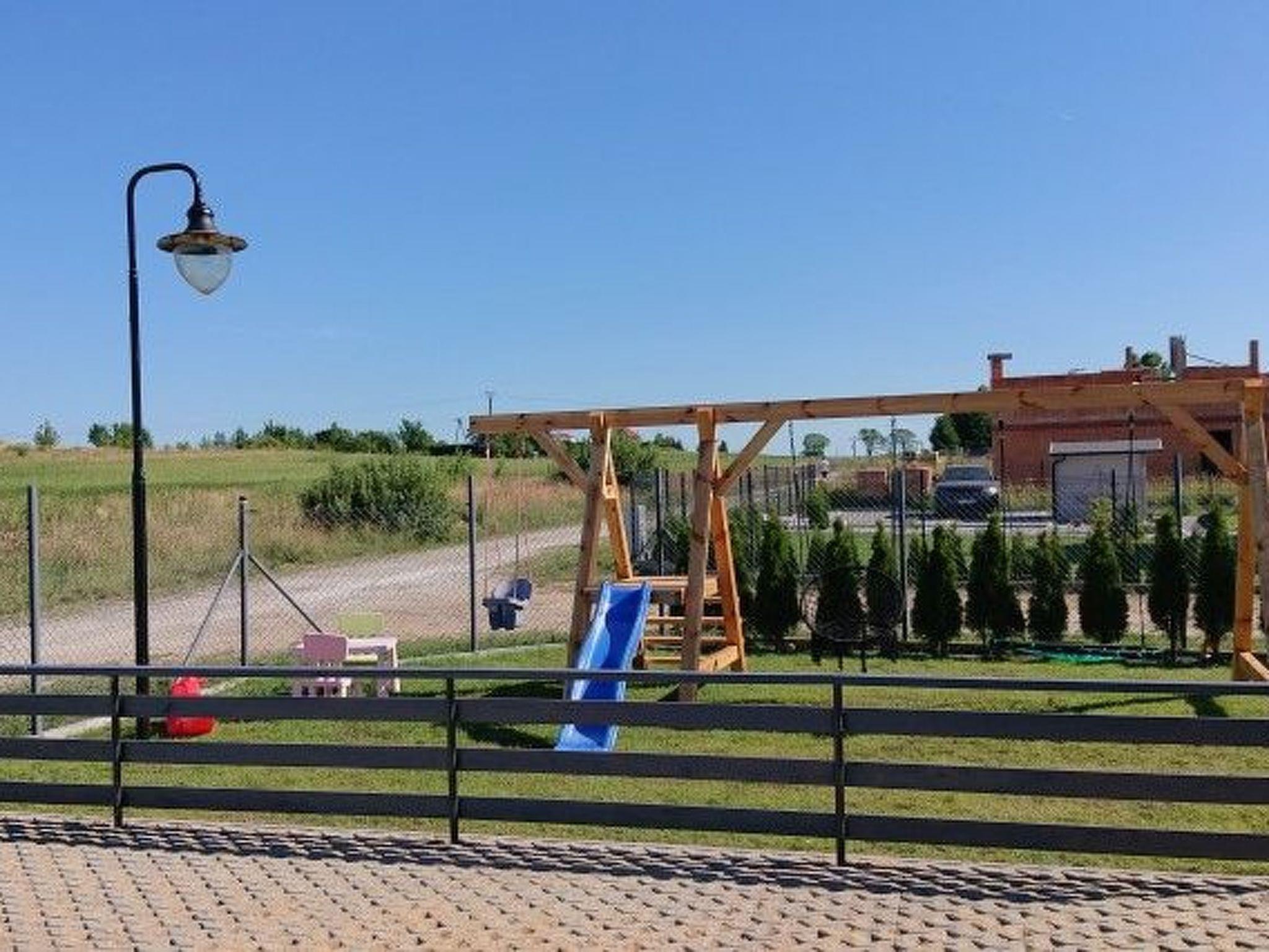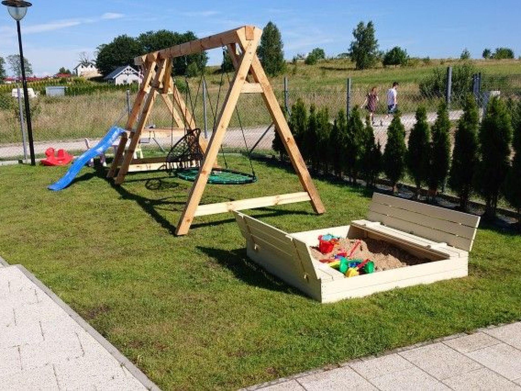 The area is fenced. We provide 1 parking space per house on the enclosed property. In the common area a children's playground, a sandpit with toys, children's rides and a barbecue area. Individual furnishing of the terrace: garden furniture ( table + 6 chairs), awning.