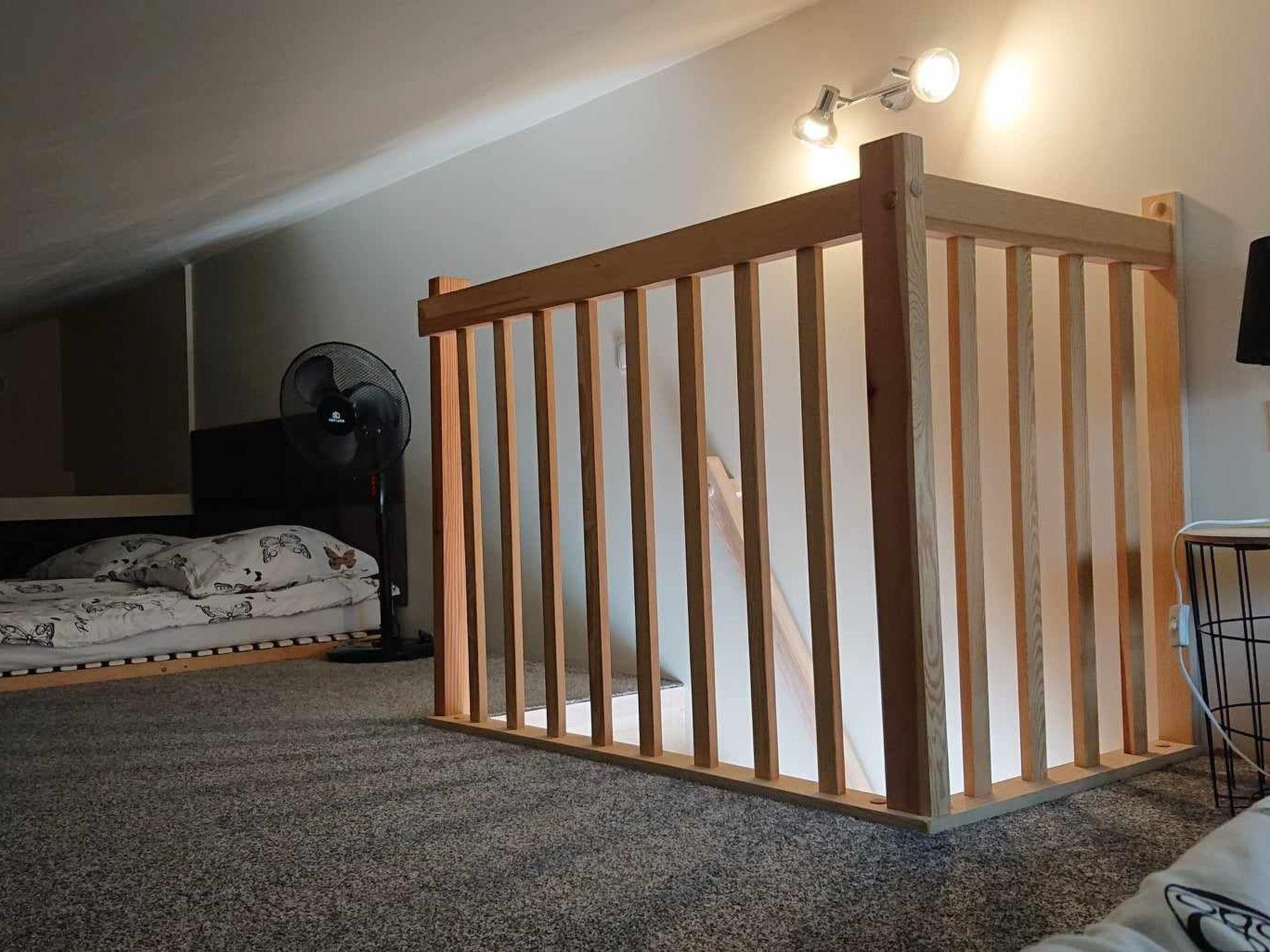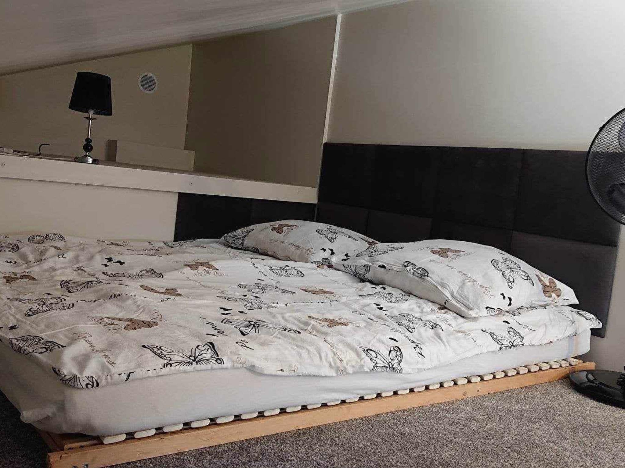 On the ground floor (room height 220 cm.) living room in which there is a LED TV, sofa-bed, armchair, coffee table and wardrobe. A kitchenette in which there is a large fridge, pots, dishes, kettle, transfer coffee maker, four-point induction hob, microwave ovens, and a table with 4 chairs. Bathroom with shower, sink, w-c, hairdryer, liquid soap. On the mezzanine a bedroom ( 150 cm high at the highest point), there a mattress on a frame from a double bed (160x200) and a mattress on a frame from a single bed (90x200) as well as bedside tables and a chest of drawers. Beach accessories ( 2 deck chairs and a screen) are available in the house.