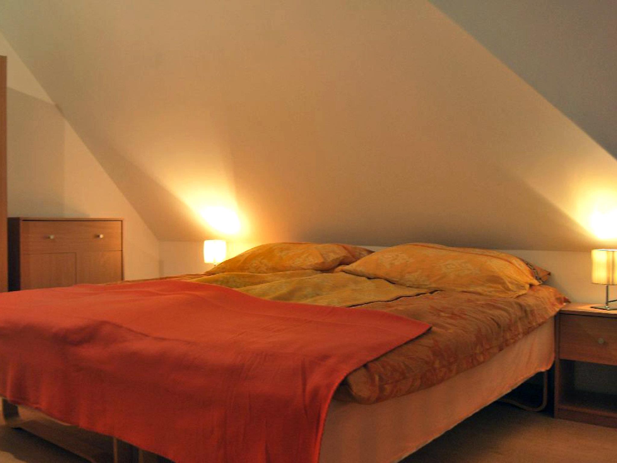 4-room house 150 m2 on 2 levels. Partly with sloping ceilings, comfortable and beautiful furnishings: open living/dining room with Scandinavian wood stove and satellite TV. Exit to the garden, to the terrace. Open kitchen (2 hot plates, oven, dishwasher, microwave, electric coffee machine). Shower/bidet/WC. Top floor: 2 rooms with sloping ceilings, each room with 1 double bed. 1 room with sloping ceilings with 2 beds. Bath/WC. Wood heating. Terrace 16 m2. Terrace furniture, deck chairs (2). View of the countryside. Please note: smoke alarm.
