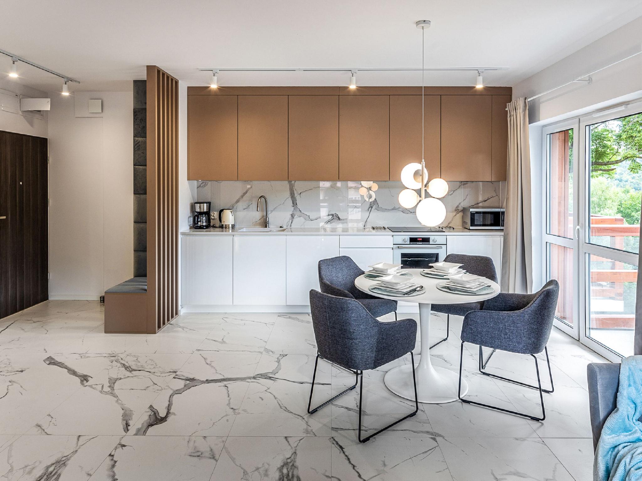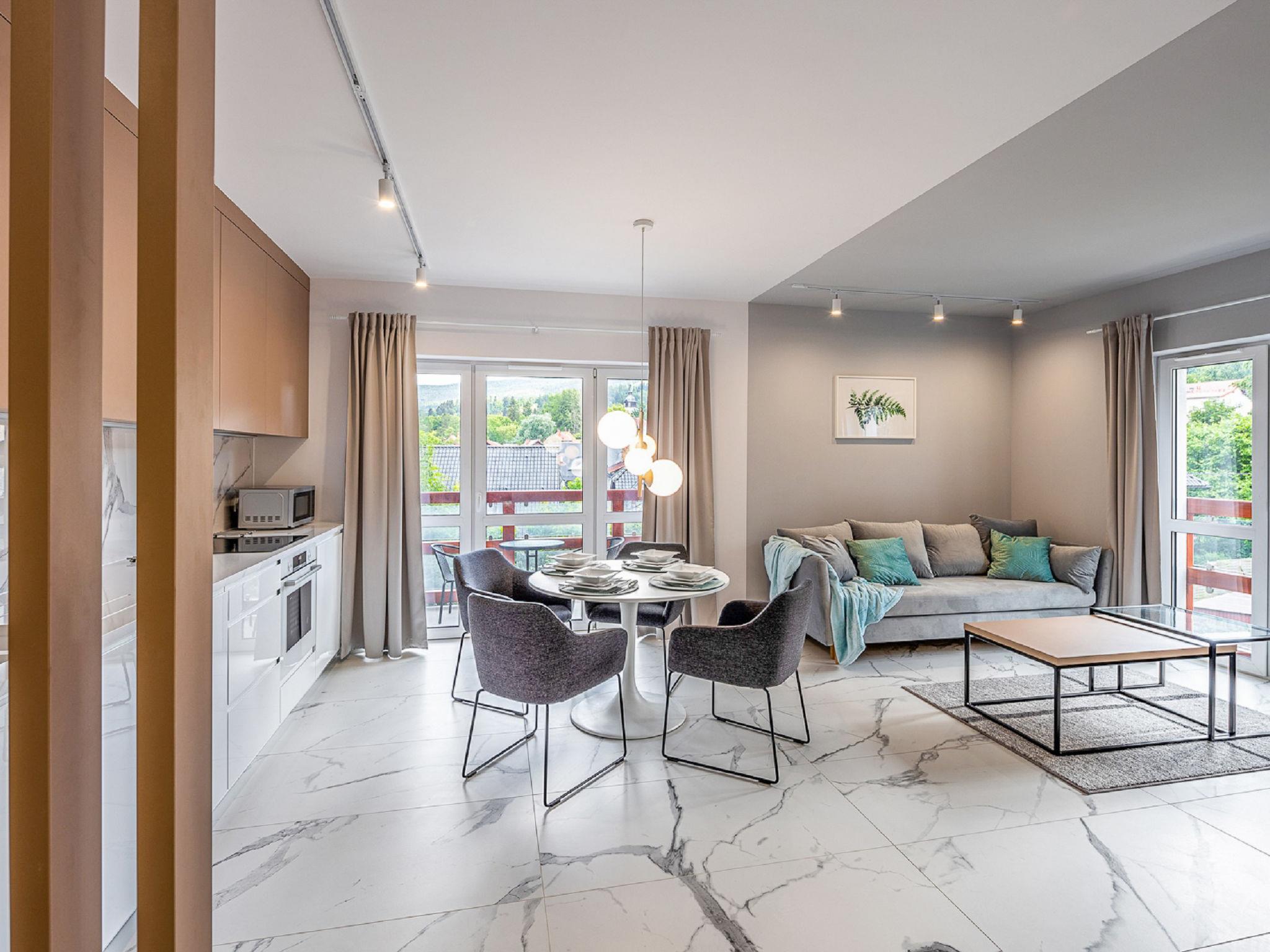 Swieradów Zdrój: Modern, cosy apartment block "Holiday Mountain Residence". In a quiet, sunny, elevated position. In the house: WiFi, central heating system. Parking (extra) at the house on the premises. Bus stop 15 km, railway station 1.2 km. Nearby attractions: Dom Zdrojowy w Swieradowie-Zdroju 500 m, Zamek Czocha 1.4 km, Muzeum Szkla 1.6 km. Well-known ski regions can easily be reached: Skocznie narciarskie w Harrachovie 17 km. Please note: the photograph shows a typical example. Additional accommodations can be booked. The apartment may be on the ground floor, first floor or second floor. Some apartments with mountain views / partial views. There may be an additional parking fee paid on spot. Infant accepted over the maximum number of people - up to 3 years of age. Mobile office working hours depending on the occupancy.