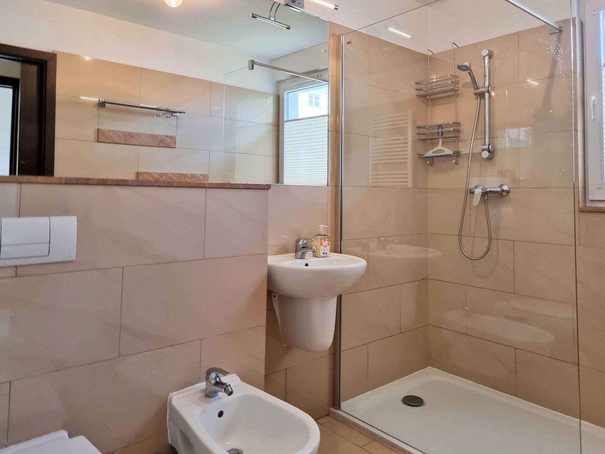 Wohnung mit Wohnzimmer mit Anhang und Schlafzimmer von 47m2 befindet sich im Erdgeschoss eines Gebäudes mit Aufzug. Das Schlafzimmer ist mit einem Doppelbett (140cmx 200cm), Nachttischen und Lampen ausgestattet. Das Wohnzimmer hat ein Schlafsofa, einen Couchtisch, einen LCD-Fernseher und eine Essecke mit Hockern. Vom Wohnzimmer aus gelangt man auf eine Terrasse mit einem Tisch und vier Korbstühlen. Die Küchenzeile ist mit den wichtigsten Utensilien für die Zubereitung und den Verzehr von Mahlzeiten ausgestattet und verfügt über einen 4-Flammen-Elektroherd, einen Backofen, einen Kühlschrank, einen Wasserkocher, eine Kaffeemaschine, einen Toaster, Teller und Besteck. In der Diele befindet sich ein großer Kleiderschrank. Badezimmer mit WC, Waschbecken, Bidet und bodengleicher Dusche.