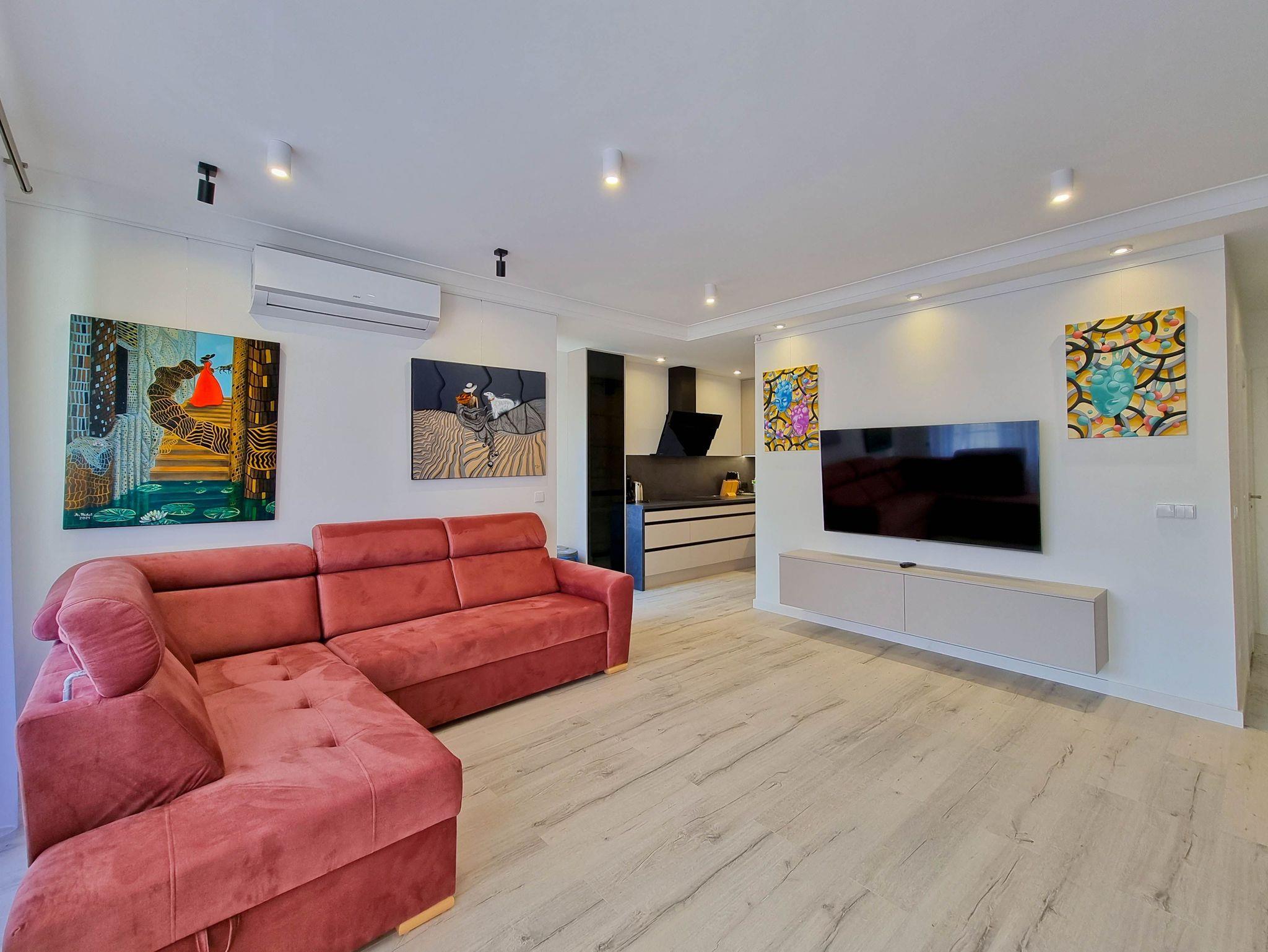 Das Wohnzimmer ist als Lounge-Bereich eingerichtet. Es gibt ein ausklappbares Ecksofa mit Schlaffunktion (Fläche nach dem Ausklappen 140x200cm), einen Couchtisch und ein Fernsehgerät, das den Empfang von polnischen und deutschen terrestrischen Sendungen ermöglicht. Das Zimmer hat auch einen Esstisch mit 6 Stühlen. Die Küchenzeile ist mit den notwendigen Küchenutensilien, Wasserkocher, Backofen, Geschirrspüler, Toaster, Mikrowelle und Dunstabzugshaube ausgestattet. Die Fenster des Wohnzimmers und des Balkons blicken auf die Südseite, von wo aus man einen Blick auf die grüne Wand des an die Sienkiewicz-Residenz angrenzenden Waldes hat.
