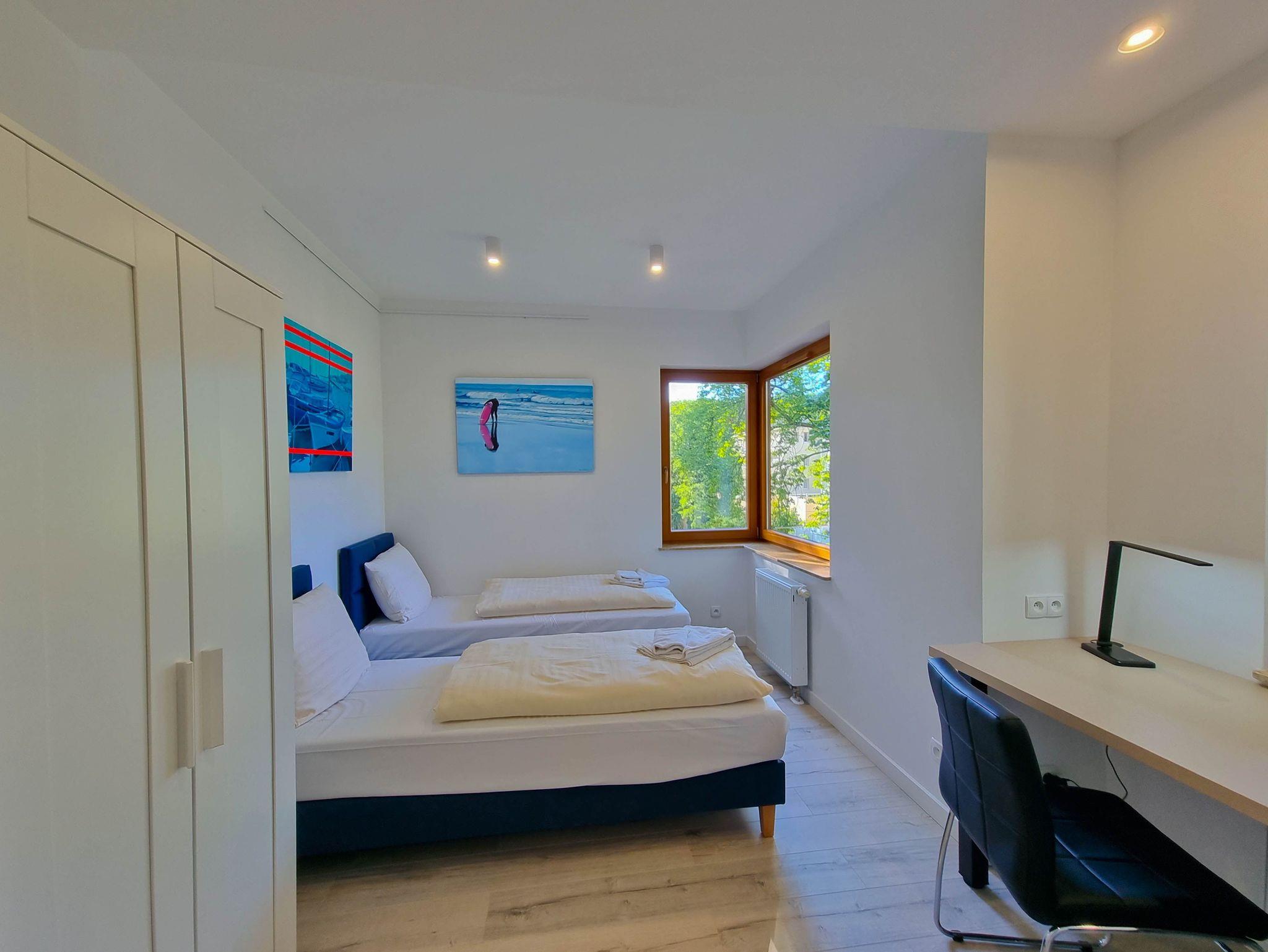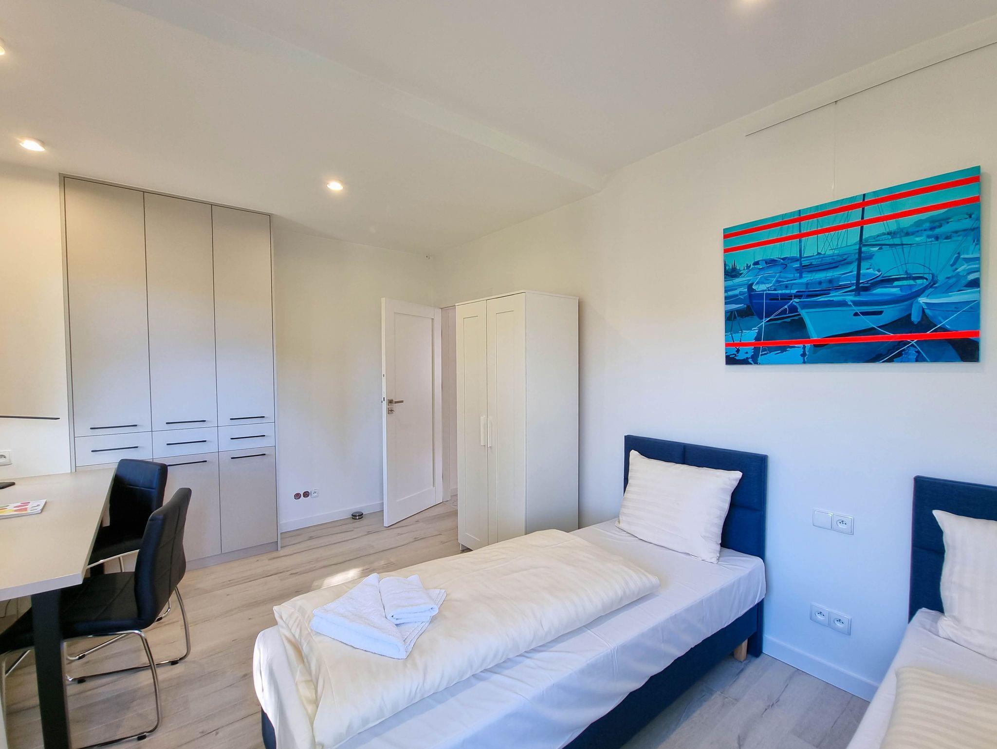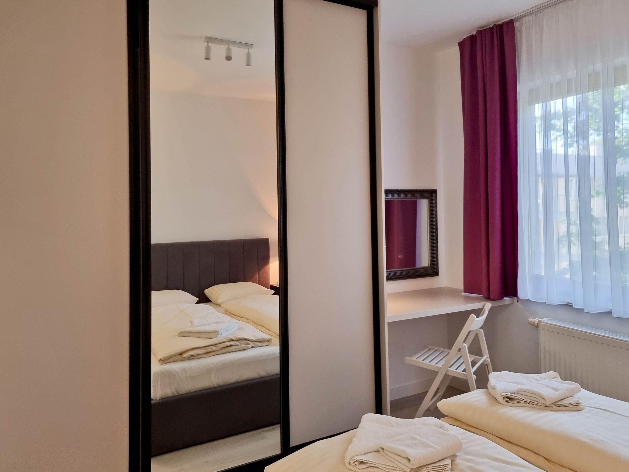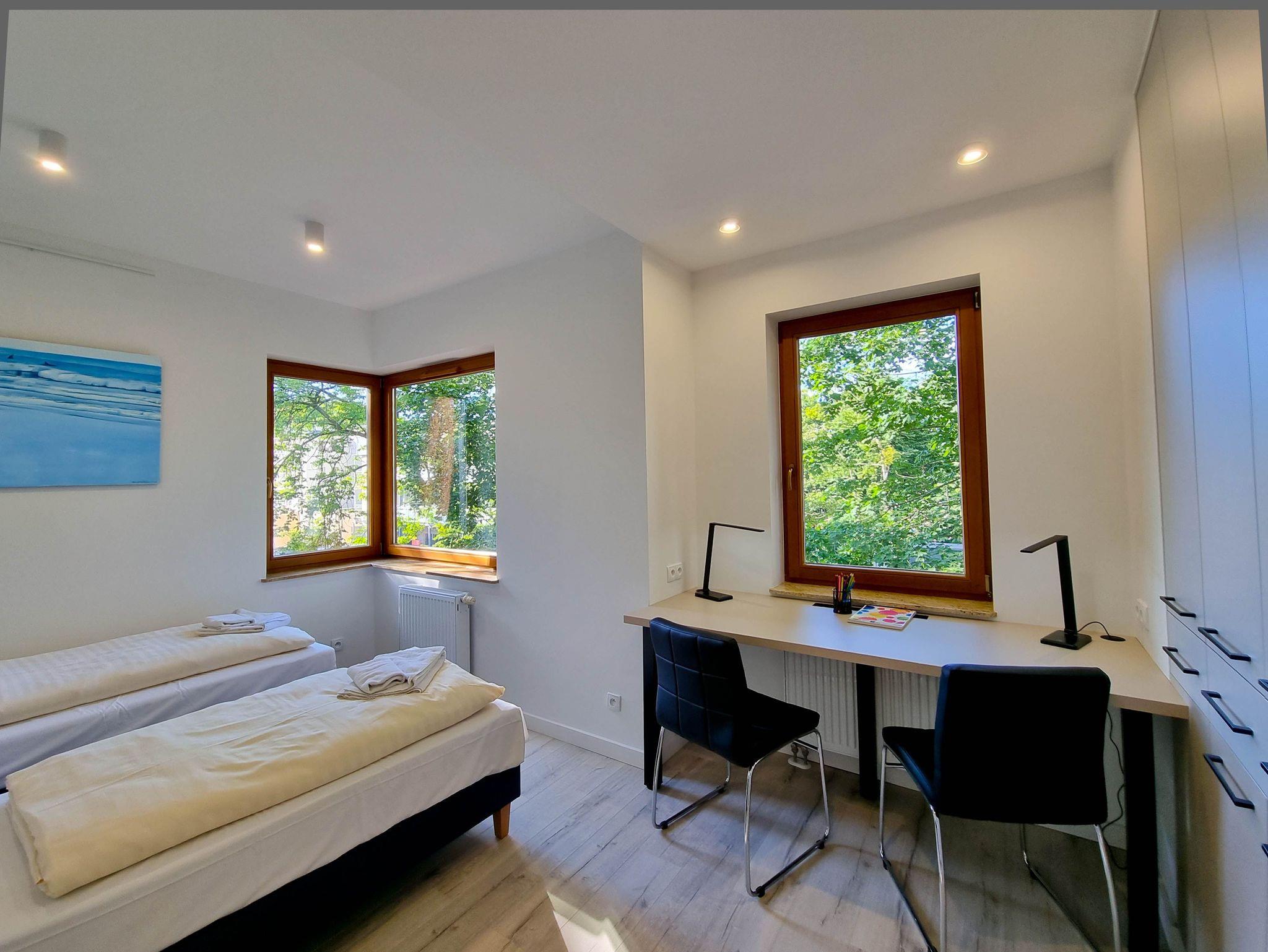 Eine komfortable 4-Zimmer-Wohnung, bestehend aus drei Schlafzimmern und einem großzügigen Wohnzimmer. Die Wohnung verfügt über zwei Balkone mit Südausrichtung. Das Schlafzimmer mit Balkon und Kleiderschrank ist mit einem Queen-Size-Bett (160cm x 200cm), einem TV-Gerät und einer Wohnwand ausgestattet. Das zweite Schlafzimmer mit einem Queensize-Bett (160 x 200 cm), einem großen Kleiderschrank, einem Schminktisch. Drittes Schlafzimmer mit zwei Einzelbetten (80 x 200 cm), Kleiderschrank und Schreibtisch. Diese Schlafzimmer sind nach Norden ausgerichtet.