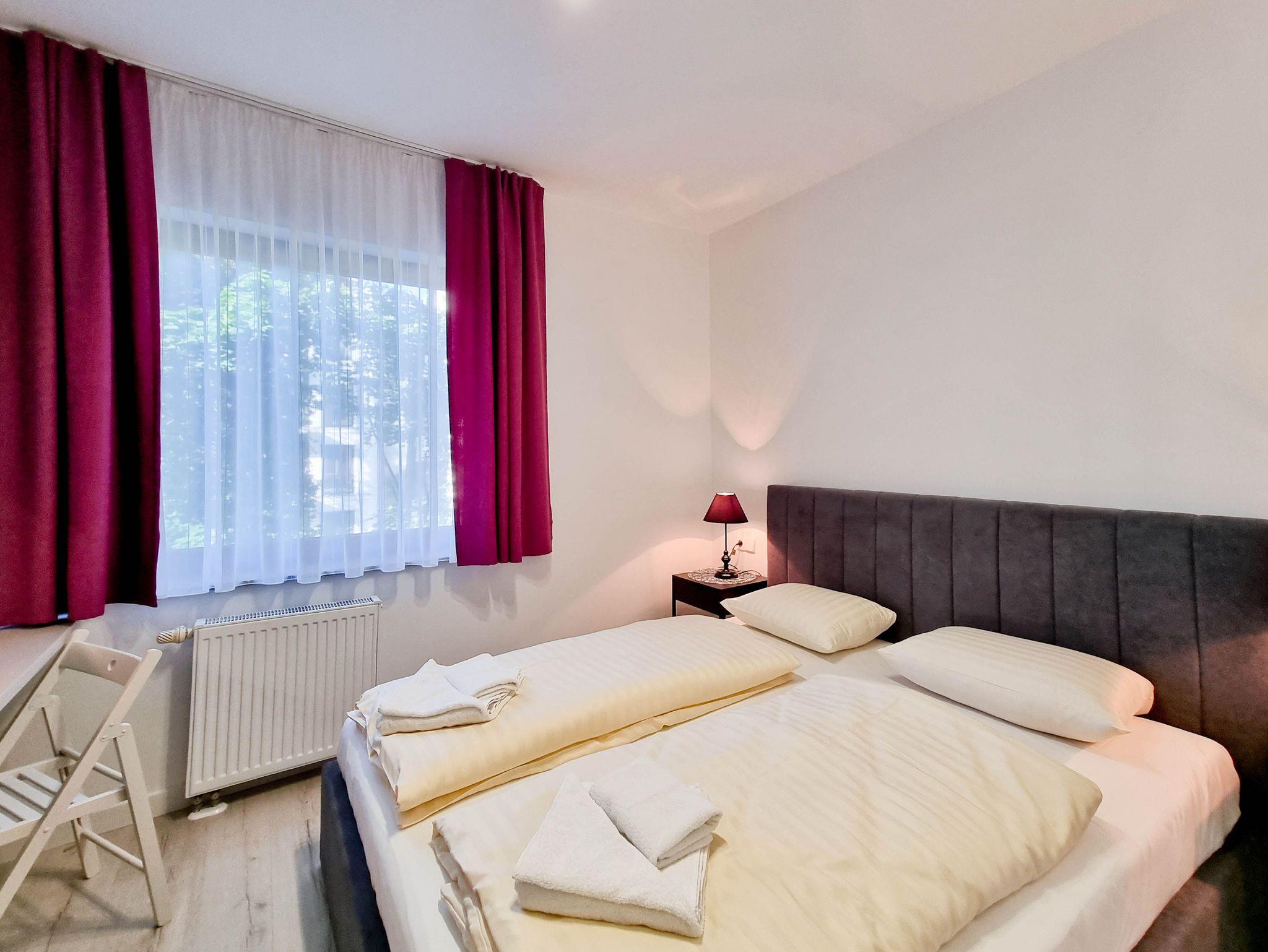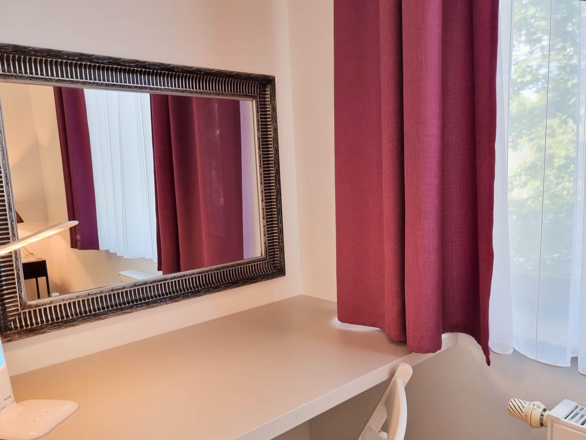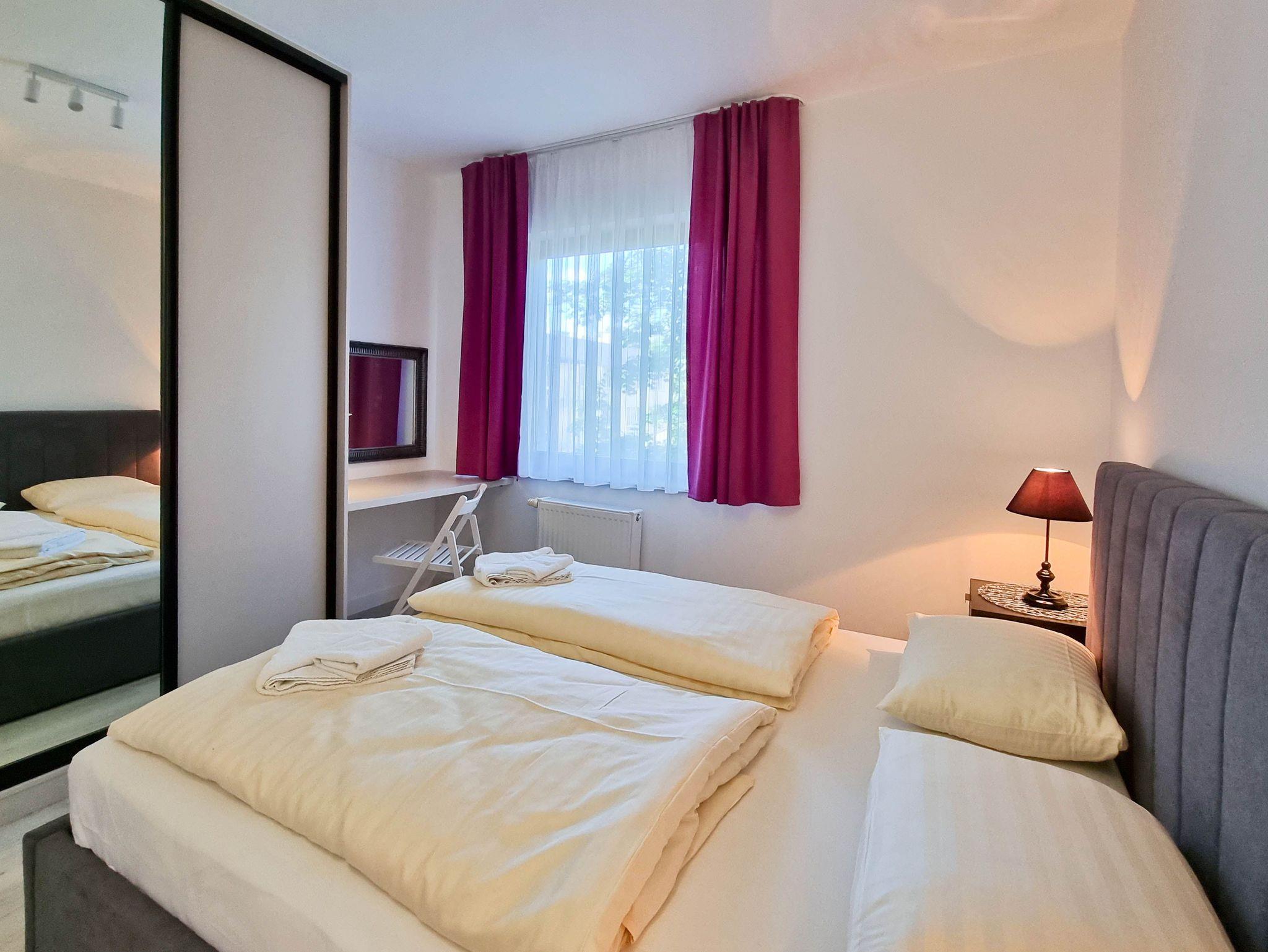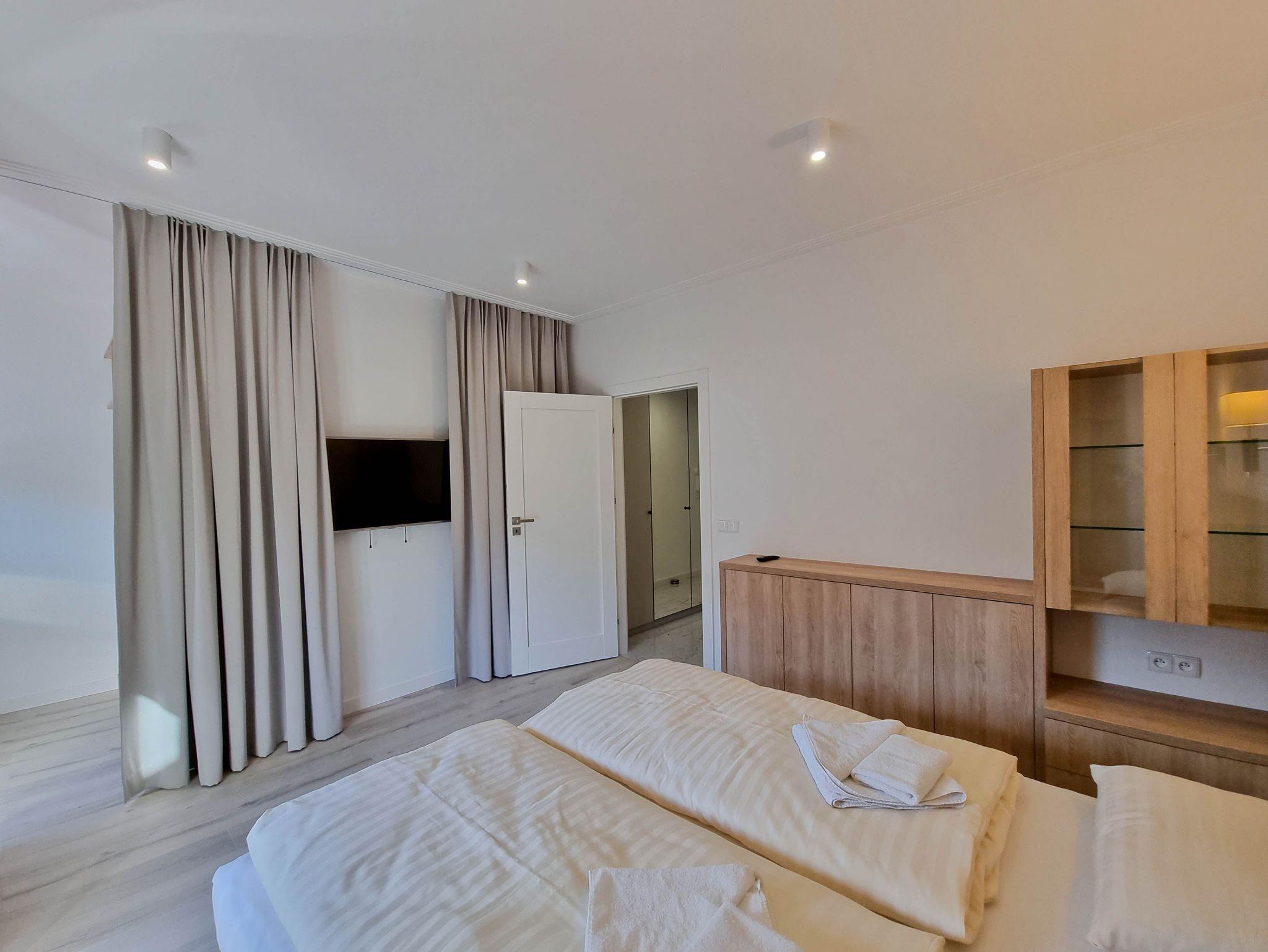 Eine komfortable 4-Zimmer-Wohnung, bestehend aus drei Schlafzimmern und einem großzügigen Wohnzimmer. Die Wohnung verfügt über zwei Balkone mit Südausrichtung. Das Schlafzimmer mit Balkon und Kleiderschrank ist mit einem Queen-Size-Bett (160cm x 200cm), einem TV-Gerät und einer Wohnwand ausgestattet. Das zweite Schlafzimmer mit einem Queensize-Bett (160 x 200 cm), einem großen Kleiderschrank, einem Schminktisch. Drittes Schlafzimmer mit zwei Einzelbetten (80 x 200 cm), Kleiderschrank und Schreibtisch. Diese Schlafzimmer sind nach Norden ausgerichtet.