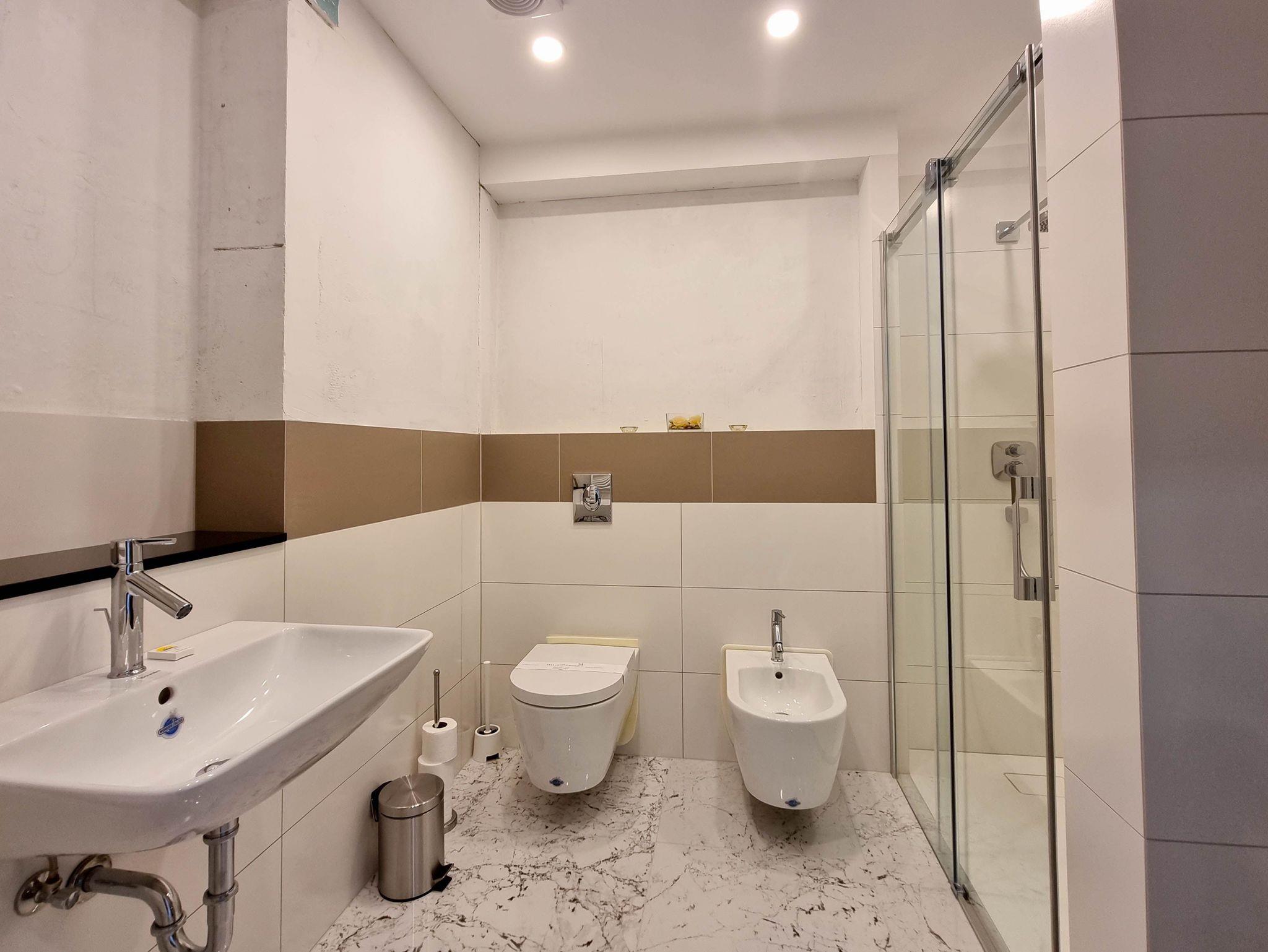 Die Wohnung verfügt über zwei Badezimmer mit Duschkabine, Waschbecken, Toilette, eines davon mit automatischer Waschmaschine.