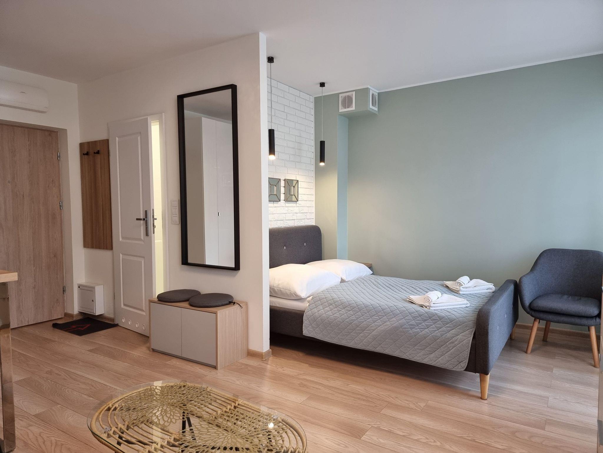 Die Studio-Ferienwohnung (26m2) befindet sich im zweiten Stock eines Gebäudes mit Aufzug. Es besteht aus einem Zimmer mit Kochnische, Bad und Balkon. Ausgestattet mit einem Doppelbett mit einer Matratze (140x200cm) und einem Schlafsofa (Fläche, wenn ausgeklappt 140x195cm), Sessel, Couchtisch. In der Küchenzeile befinden sich eine hohe Arbeitsplatte und 3 hohe Hocker sowie ein Induktionsherd mit 2 Kochstellen, ein Kühlschrank, ein Wasserkocher, eine Transferkaffeemaschine und ein Toaster. Badezimmer mit Toilette, Duschkabine, Waschbecken und Waschmaschine.
