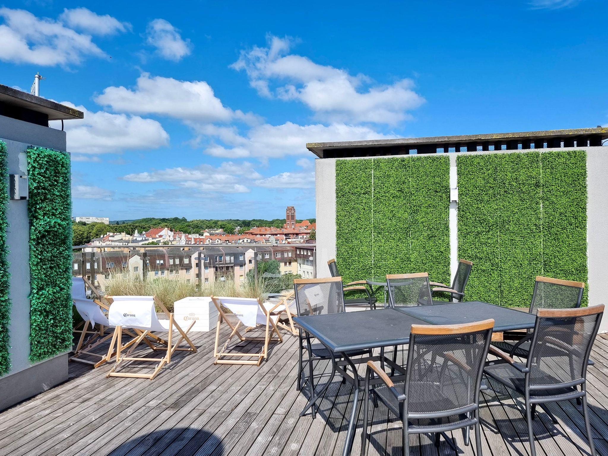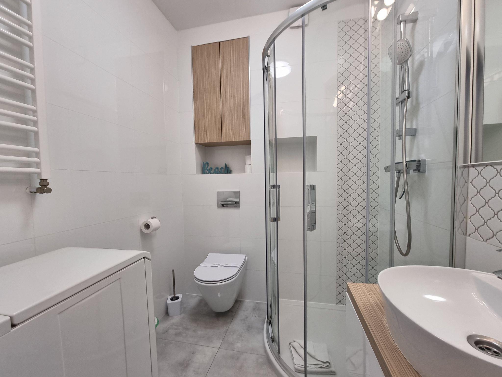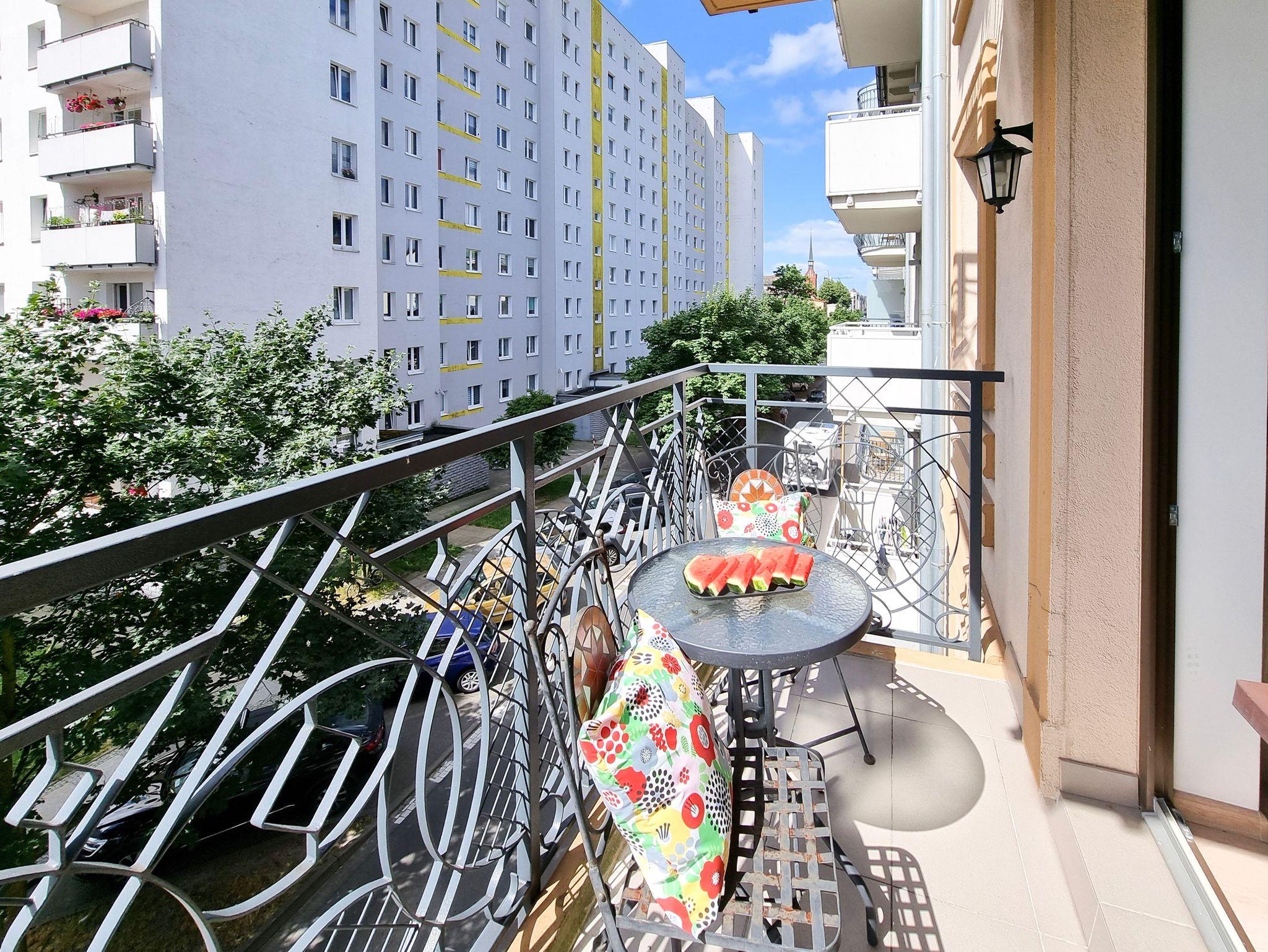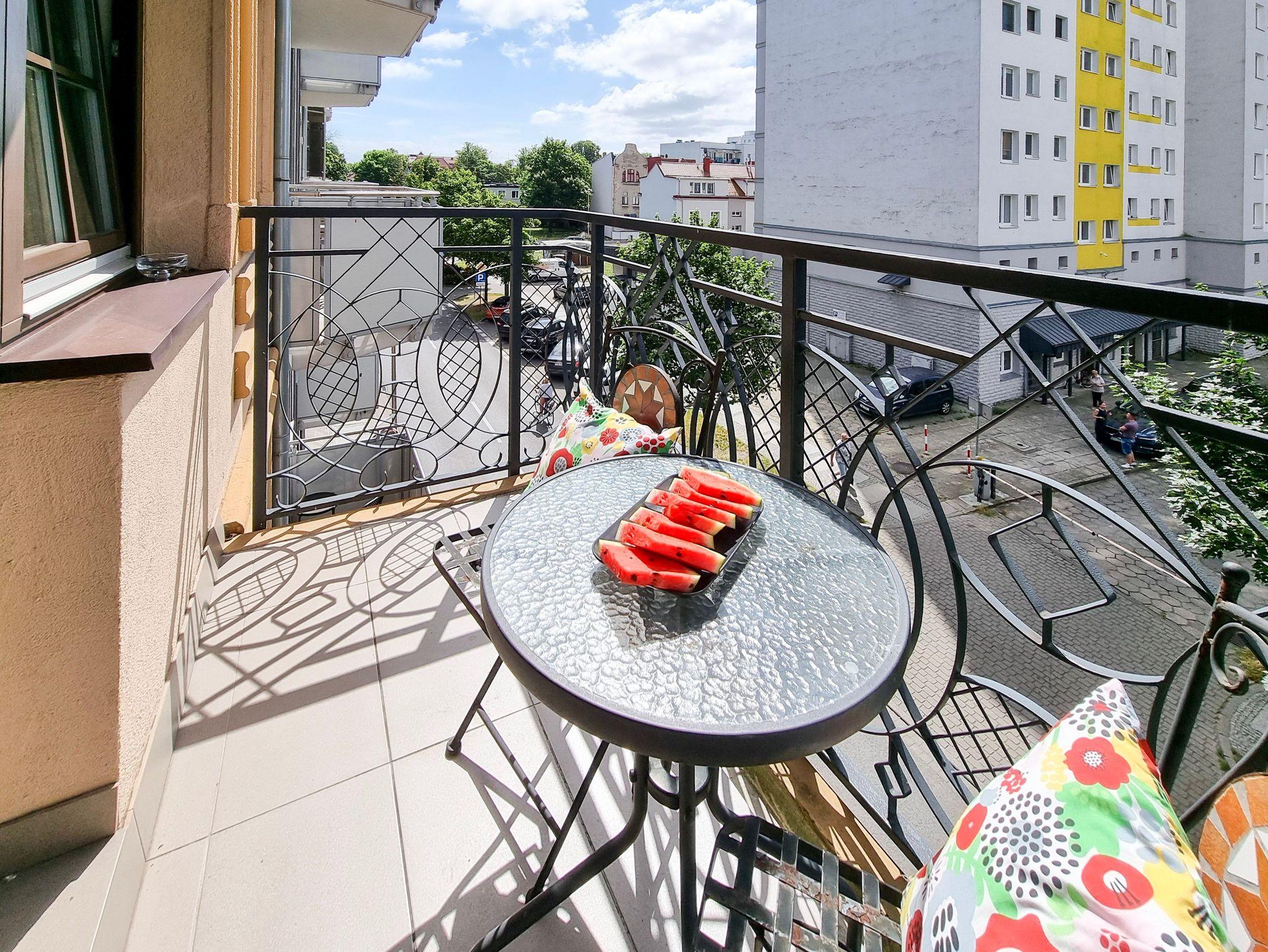 Die Ferienwohnung mit Balkon befindet sich auf der 2. Etage eines neugebauten Hauses (Baujahr 2016). Das Gebäude (Überwachung) befindet sich im Wohnviertel Windrose, am Eingang zum Kurpark. Von hieraus ist es nicht weit zur Fähranlegestelle „Bielik“, zum Stadtzentrum, Apotheke und ins Krankenhaus. Zum Strand führt ein Spazierweg durch den Kurpark. Von der I. Etage erreichen wir einen grünen Innenhof.