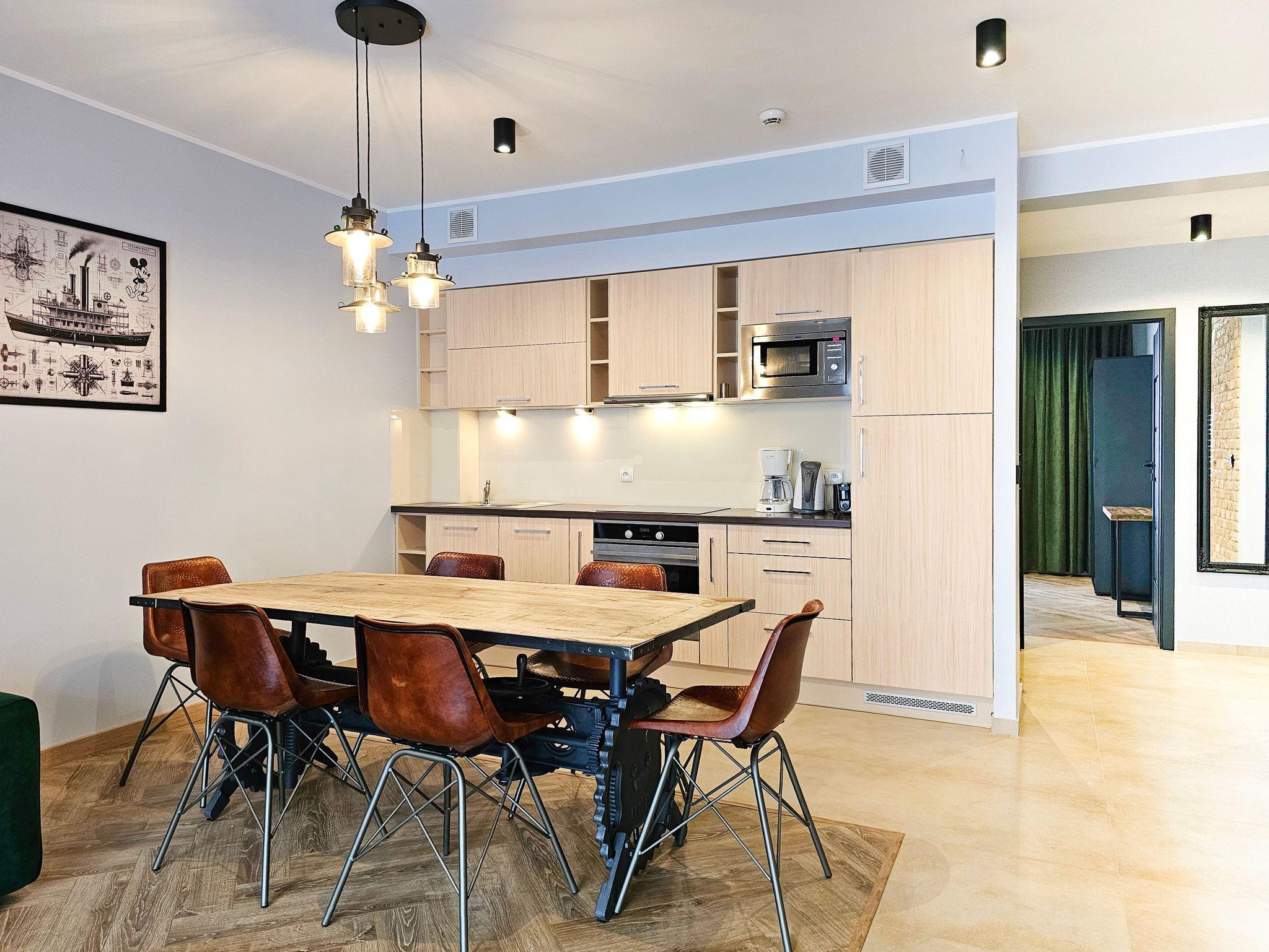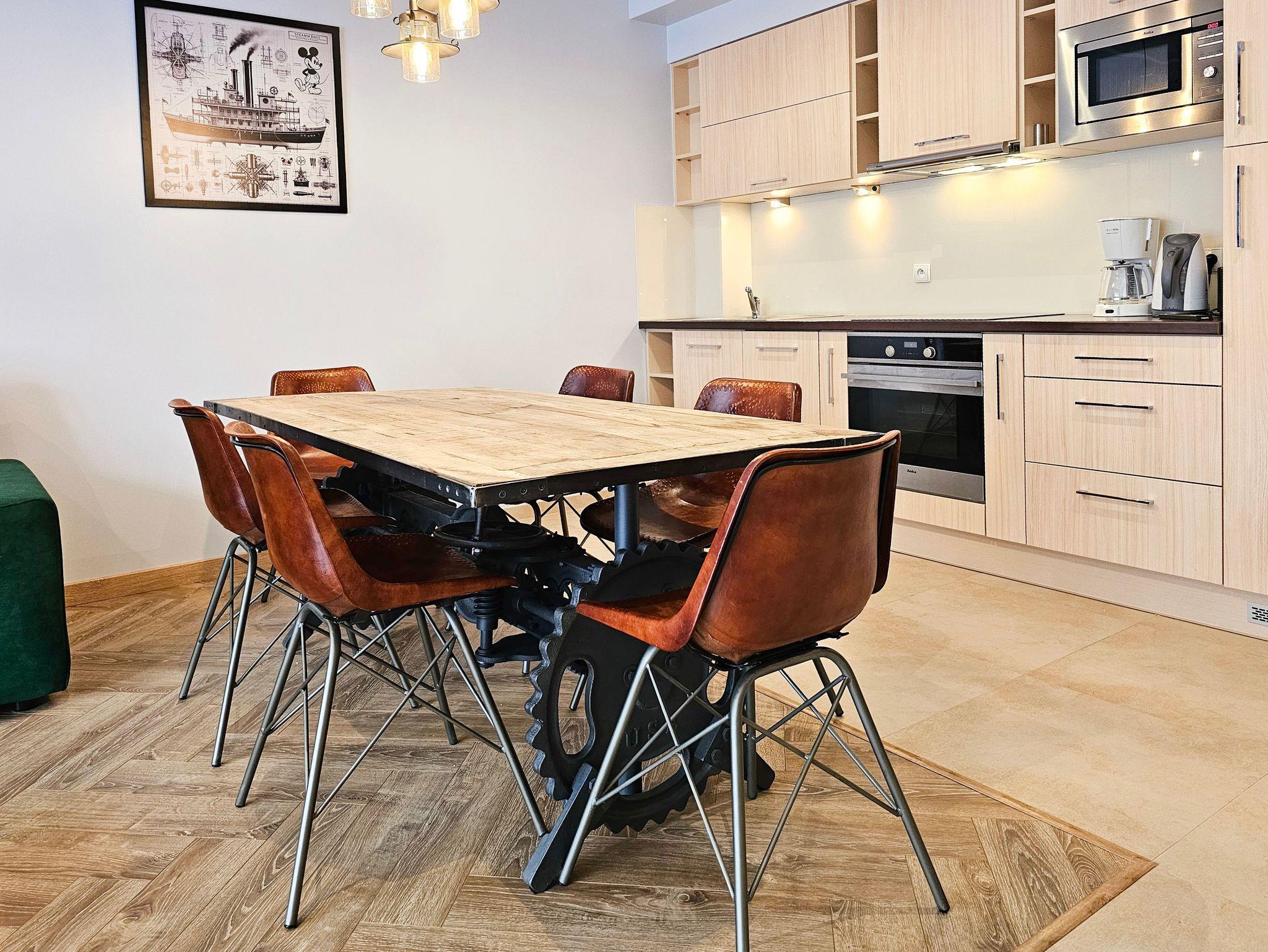 Das Wohnzimmer besteht aus einem ausklappbaren Ecksofa (Fläche nach dem Ausklappen 140x200cm), welches man ebenfalls zum Schlafen nutzen kann, einem Couchtisch, einem Esstisch mit 6 Stühlen und einem Fernseher, der den Empfang polnischer und deutscher Sender ermöglicht.