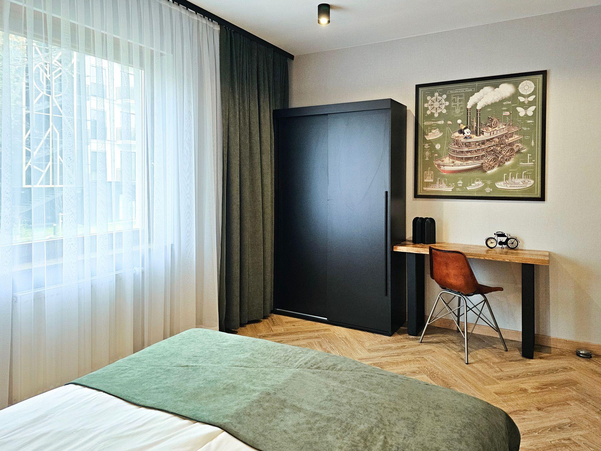 Sie besteht aus zwei Schlafzimmern und einem Wohnzimmer mit Terrasse. Die Fenster der beiden Schlafzimmer sind nach Norden zum gerichtet. Jedes Schlafzimmer ist mit einem Doppelbett, Kleiderschrank und einem Nachttisch mit Lampen ausgestattet.