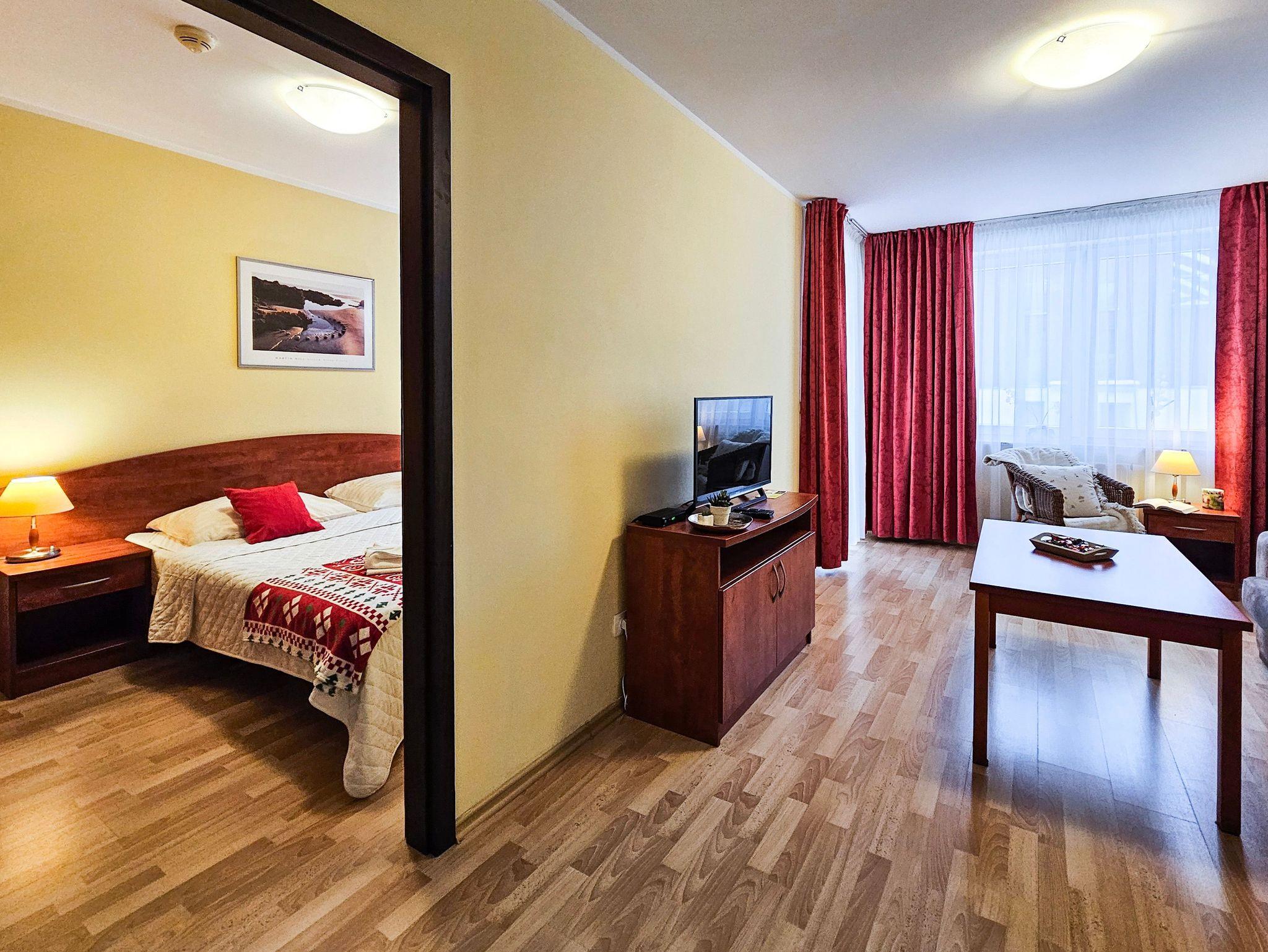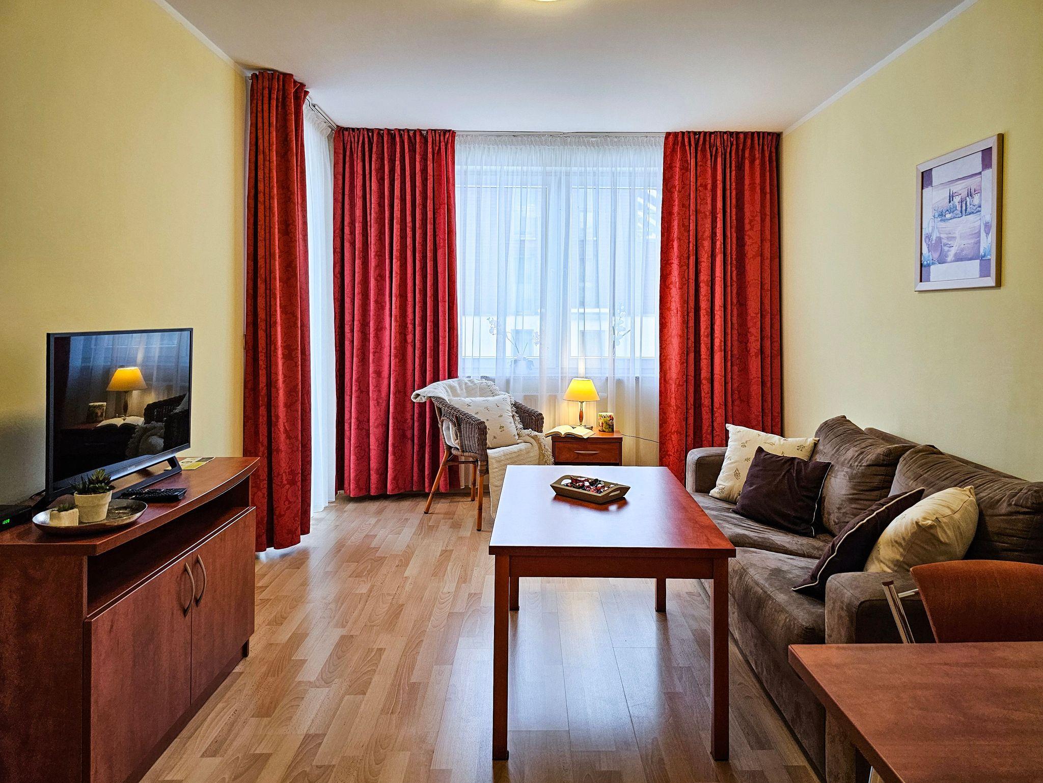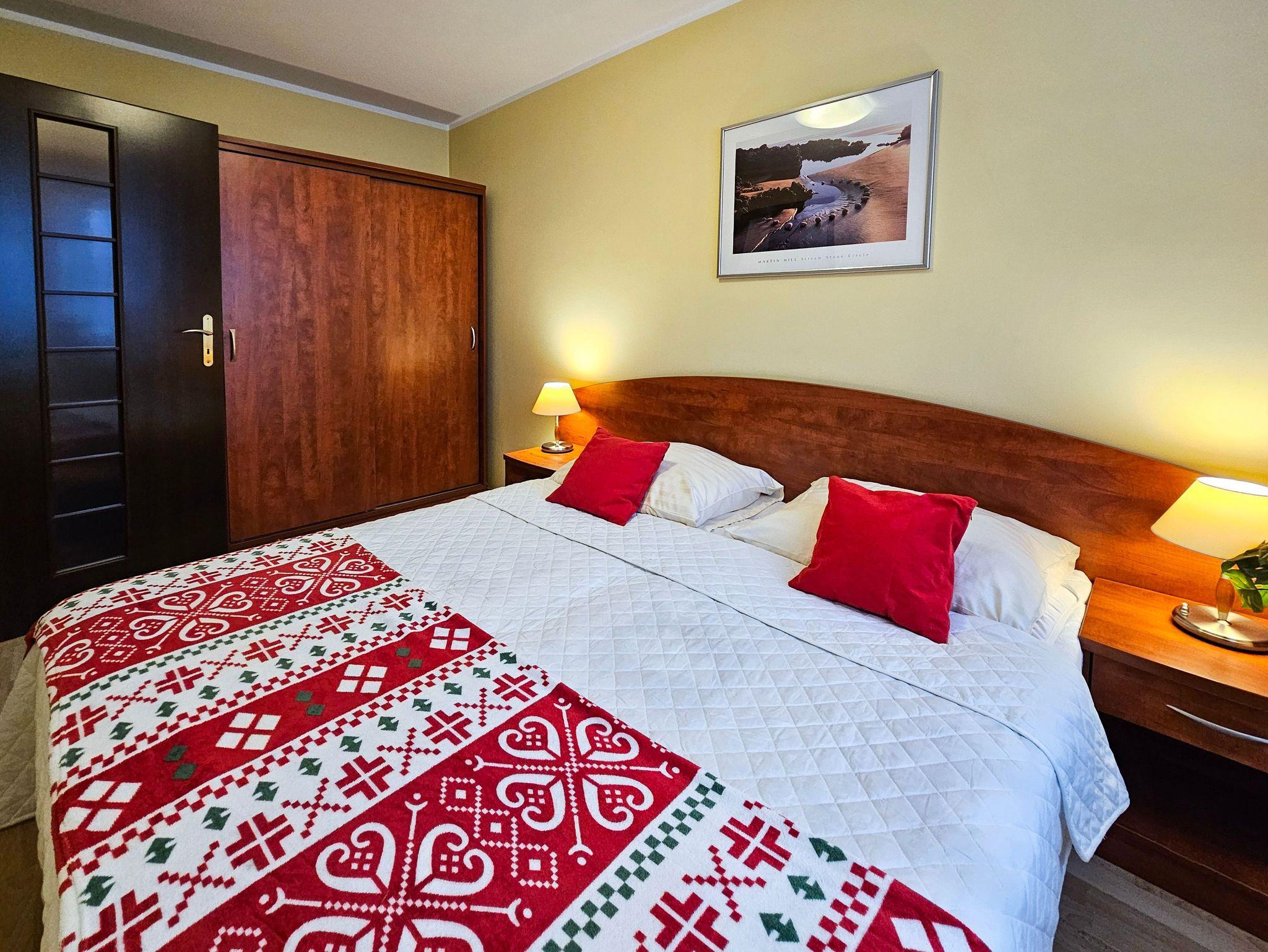 Schlafzimmer mit einem Doppelbett (160x200cm), Nachttischen, einem Kleiderschrank. Wohnzimmer mit Balkon und einem Tisch mit vier Stühlen. Die Wohnung hat der Balkon. Die Fenster und Balkon nach Nord ausgerichtet sind. Badezimmer mit Dusche, WC und Waschbecken.