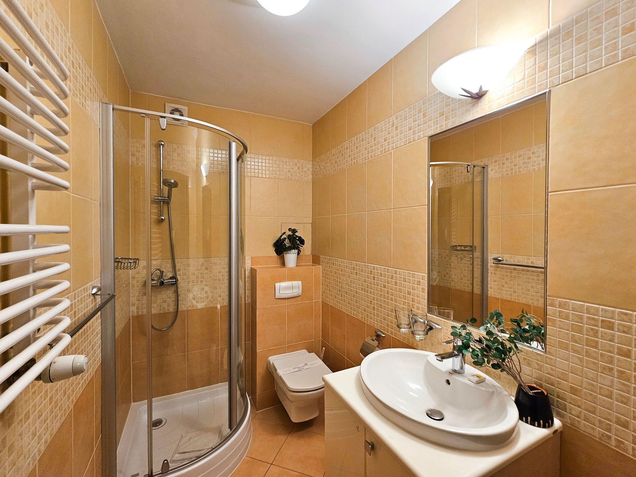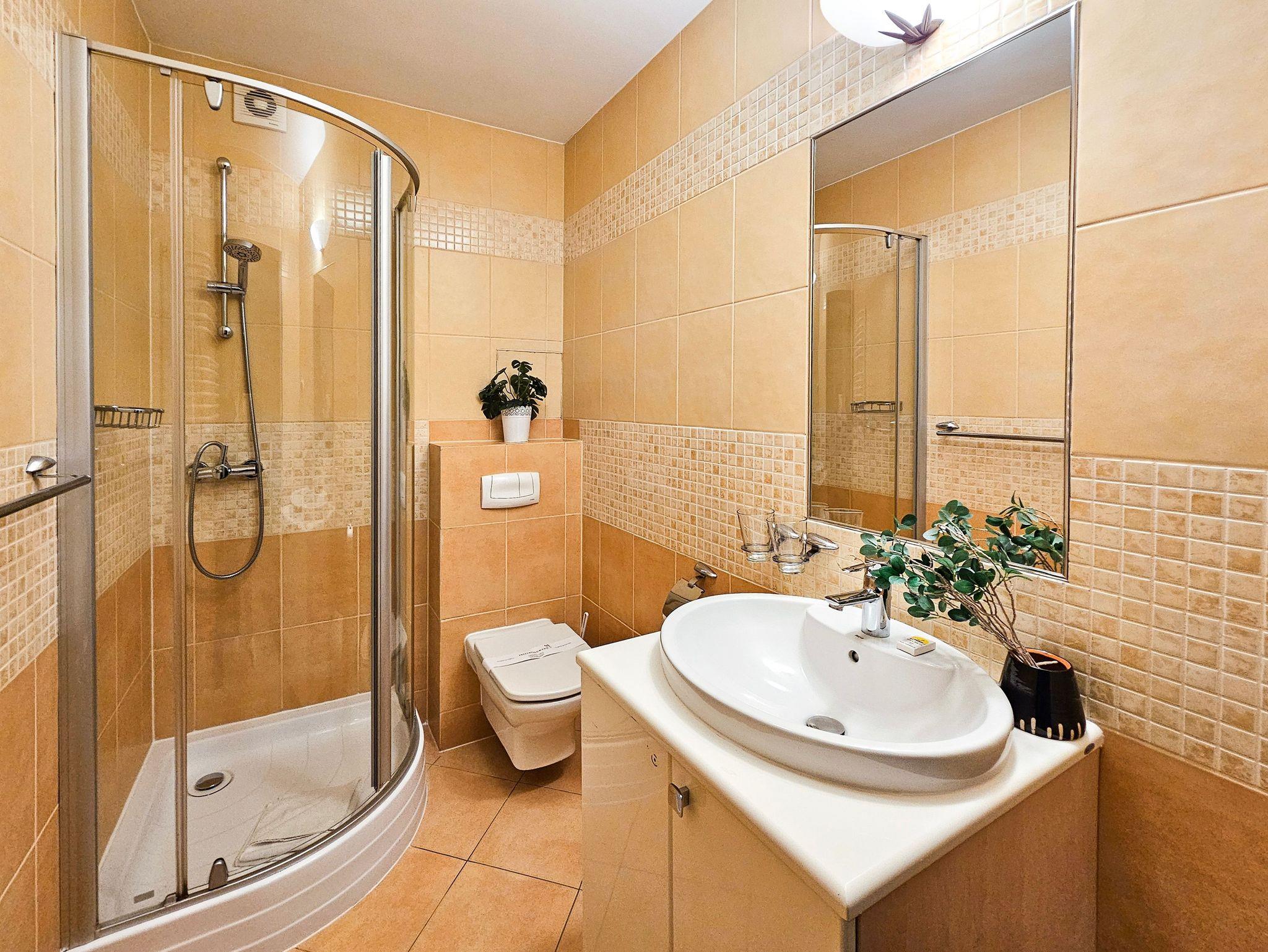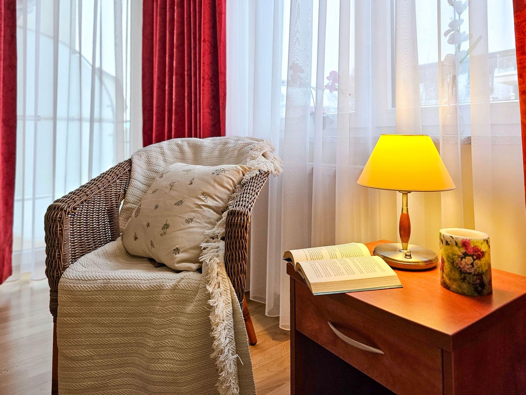 Schlafzimmer mit einem Doppelbett (160x200cm), Nachttischen, einem Kleiderschrank. Wohnzimmer mit Balkon und einem Tisch mit vier Stühlen. Die Wohnung hat der Balkon. Die Fenster und Balkon nach Nord ausgerichtet sind. Badezimmer mit Dusche, WC und Waschbecken.
