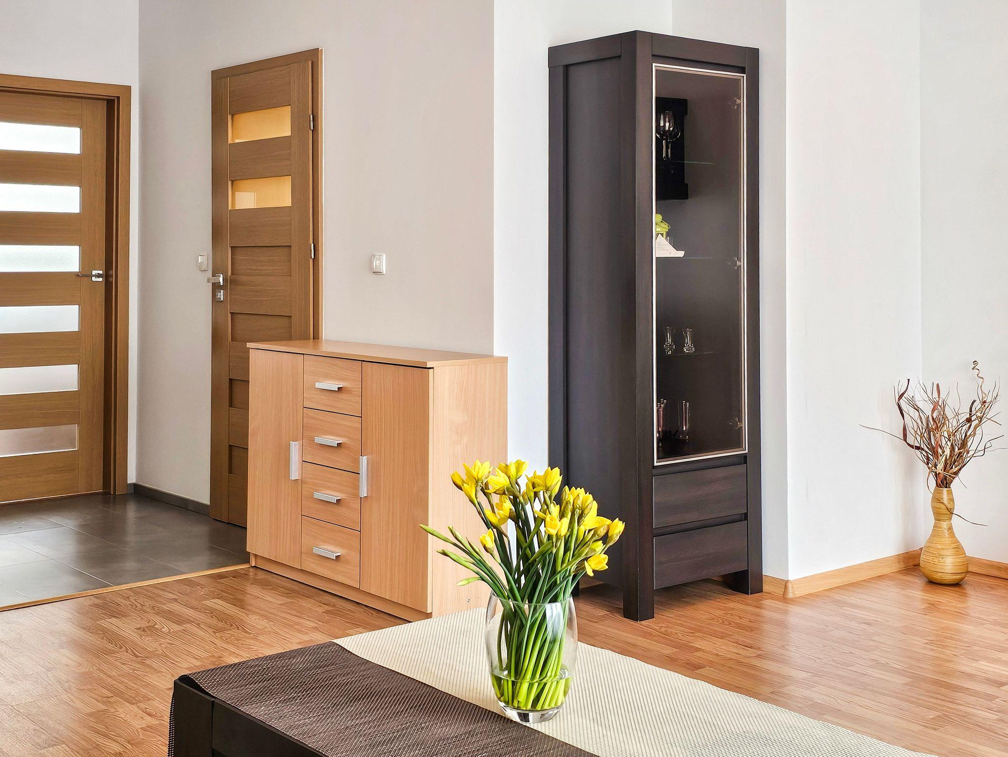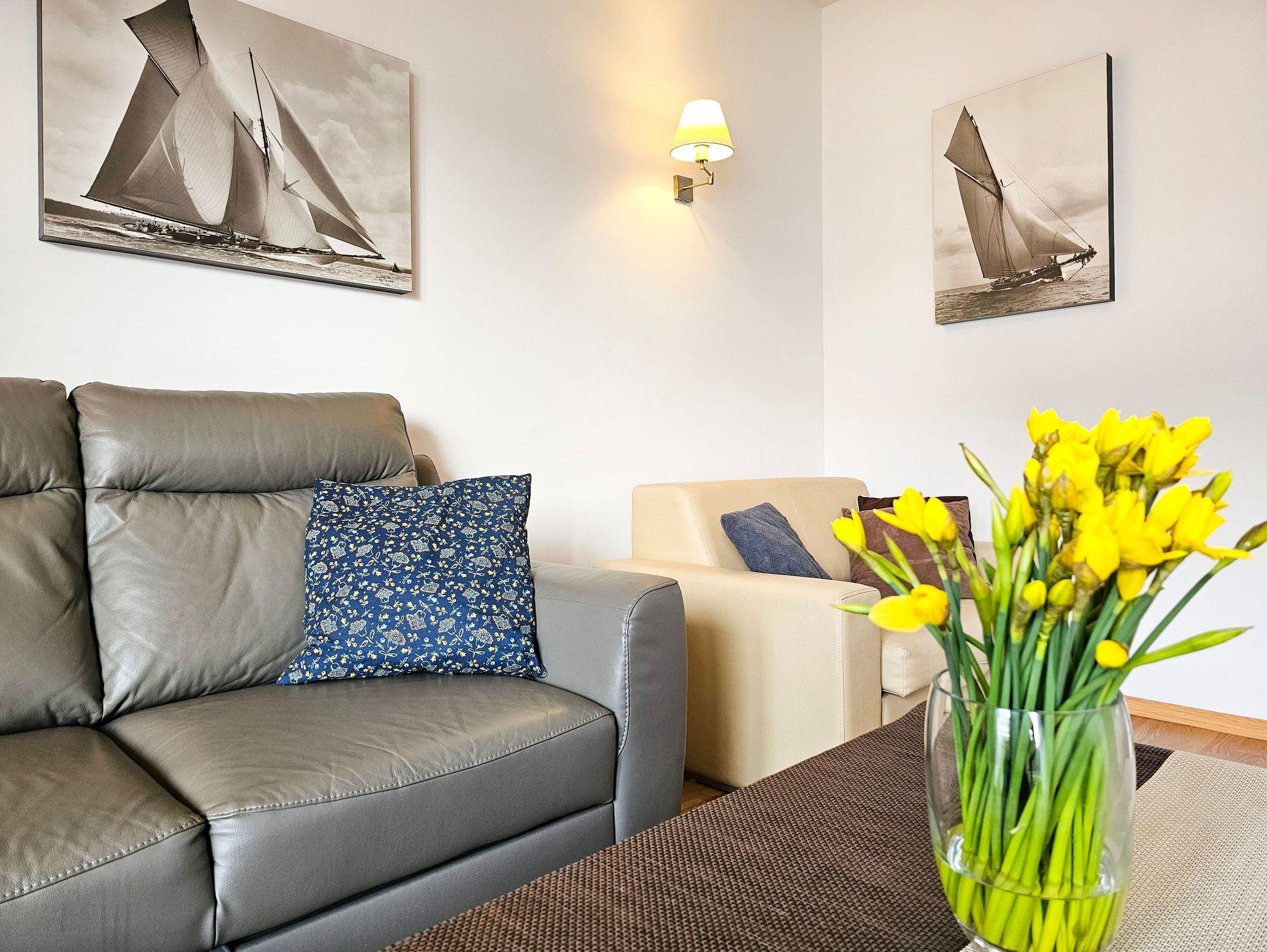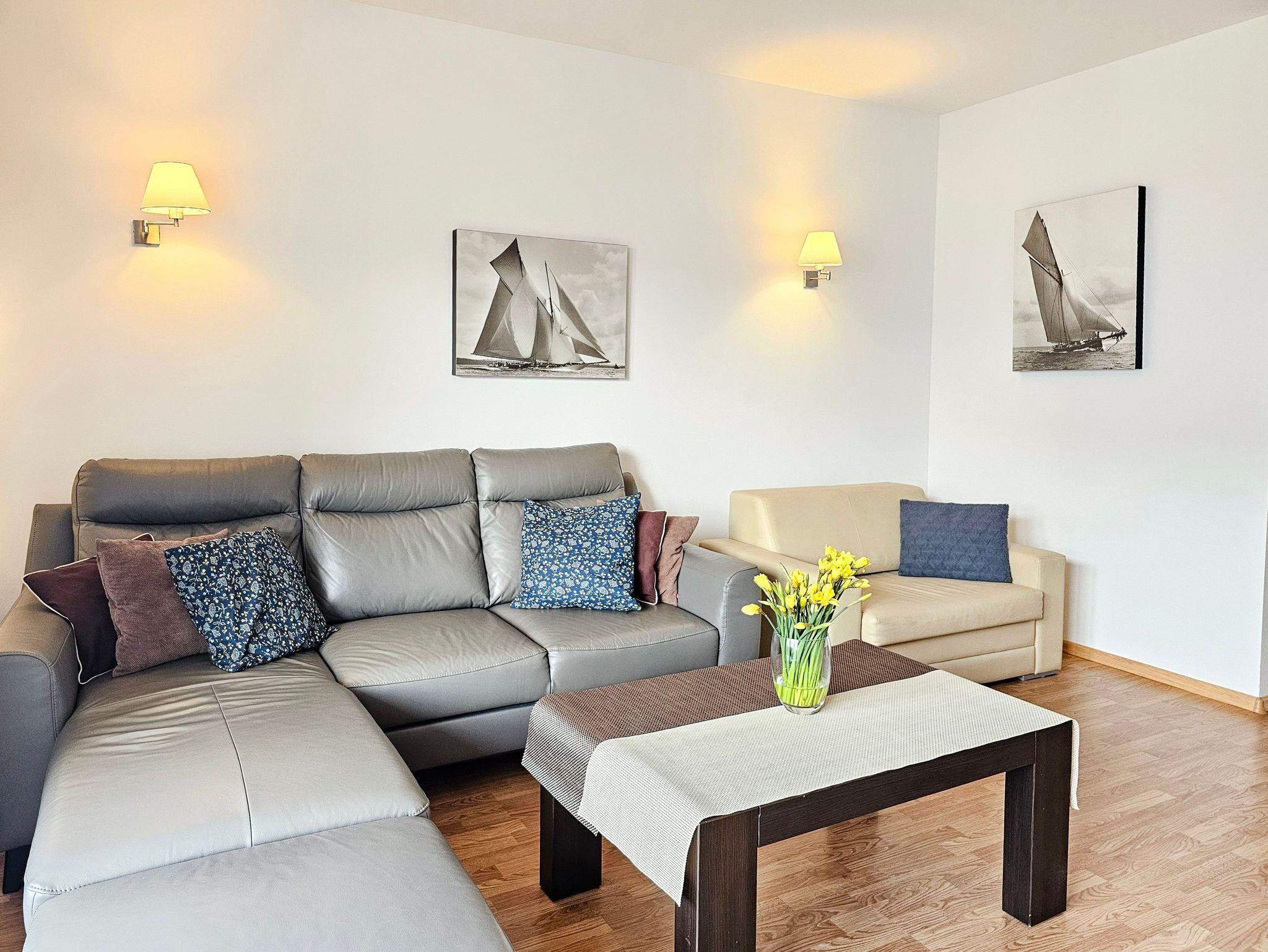 Im Wohnzimmer, mit Balkonausgang, steht eine Kommode mit einem LCD-TV mit Kabelanschluss, Glasvitrine, ein Couchtisch und zwei Schlafsofas (das erste mit einer Liegefläche von 130x190cm, das zweite mit einer Liegefläche von 90x190cm). Das Wohnzimmer schafft einen offenen Raum mit einem Flur (keine Tür). Die Fenster des Wohnzimmers, sowie der Balkon sind nach Westen gerichtet. Auf dem Balkon stehen zwei Holzstühle und ein Tisch.