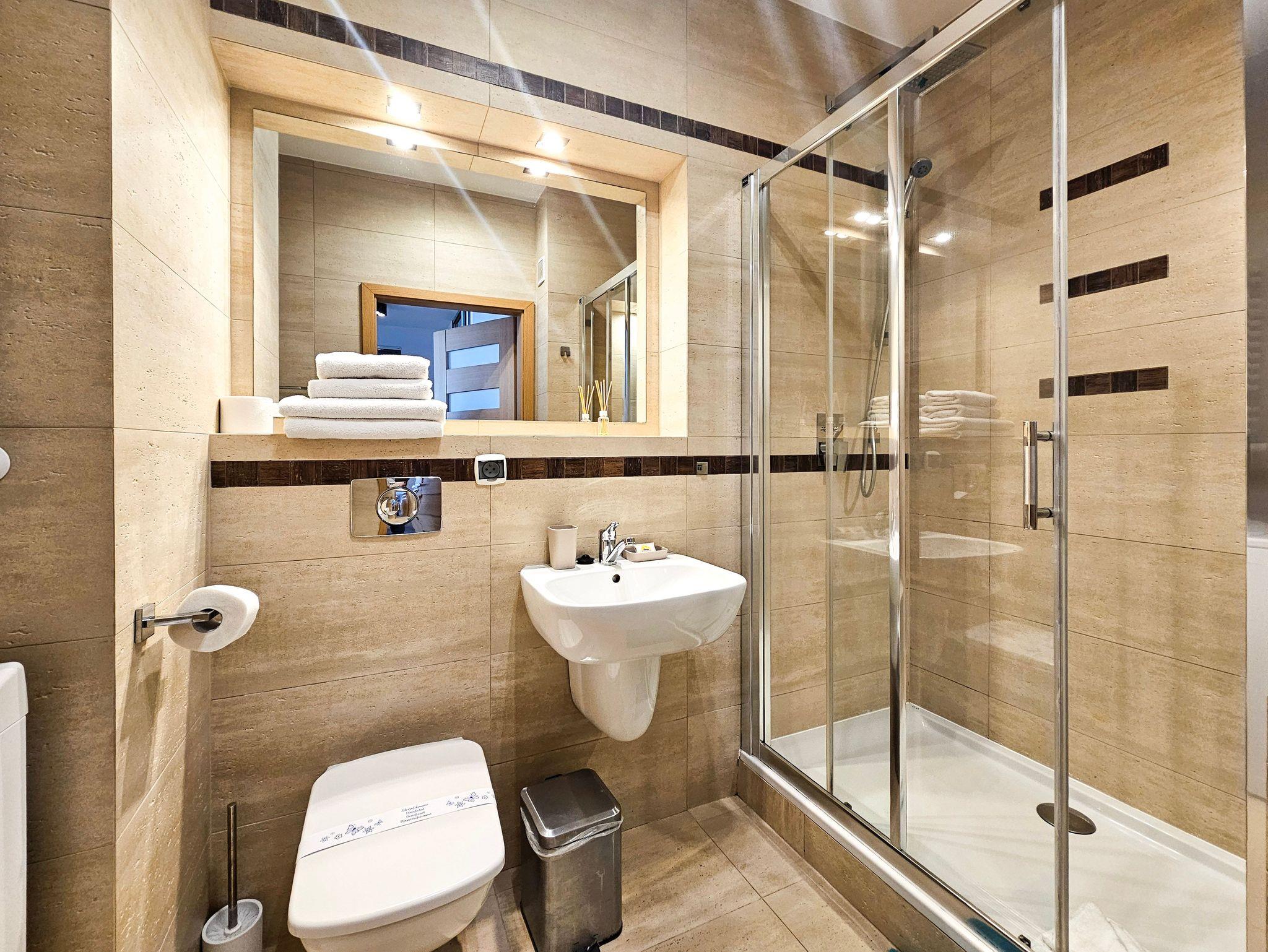 Das Badezimmer mit Dusche und WC ist zusätzlich mit einer Waschmaschine ausgestattet.