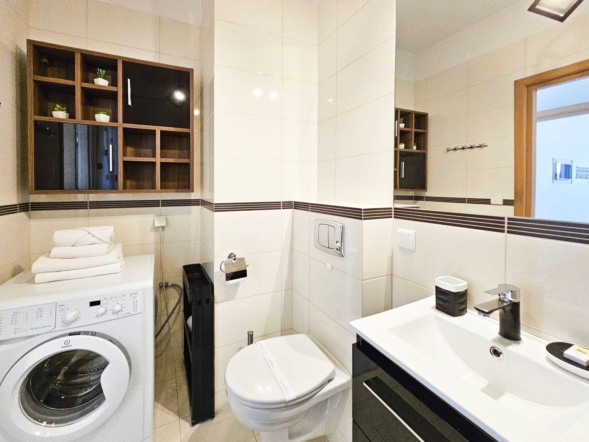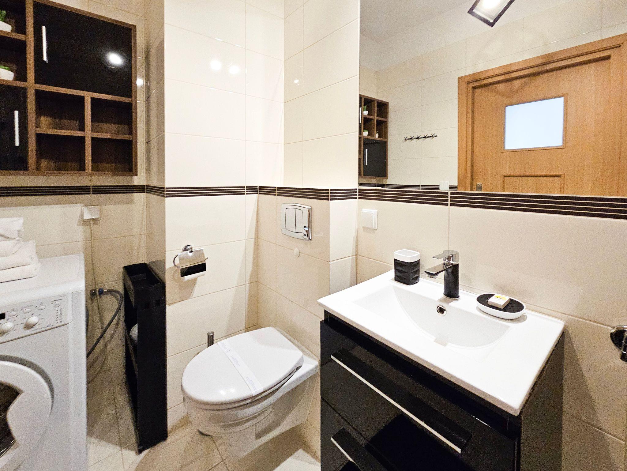 Das Badezimmer mit Badewanne und WC ist zusätzlich mit einer automatischen Waschmaschine ausgestattet.