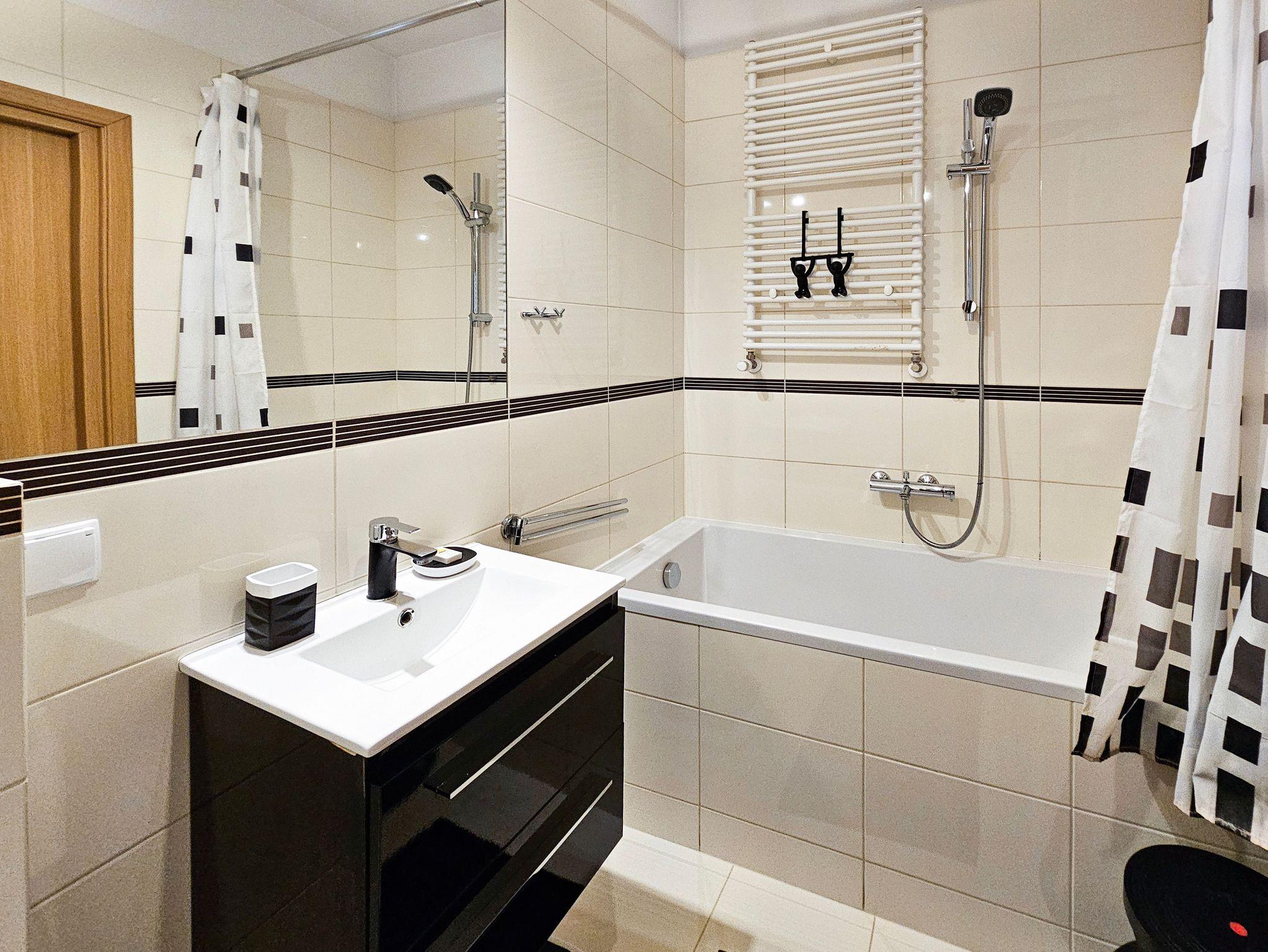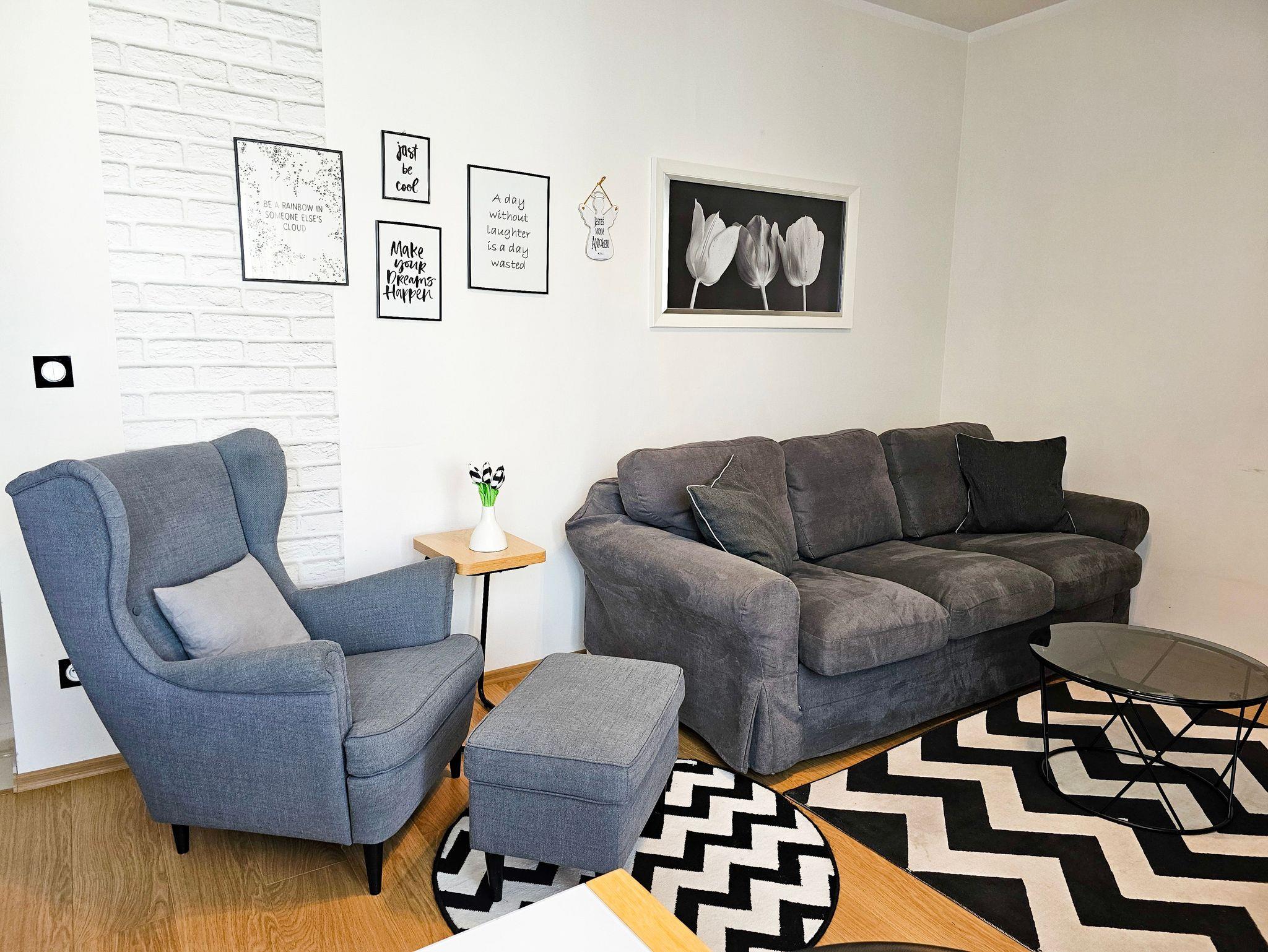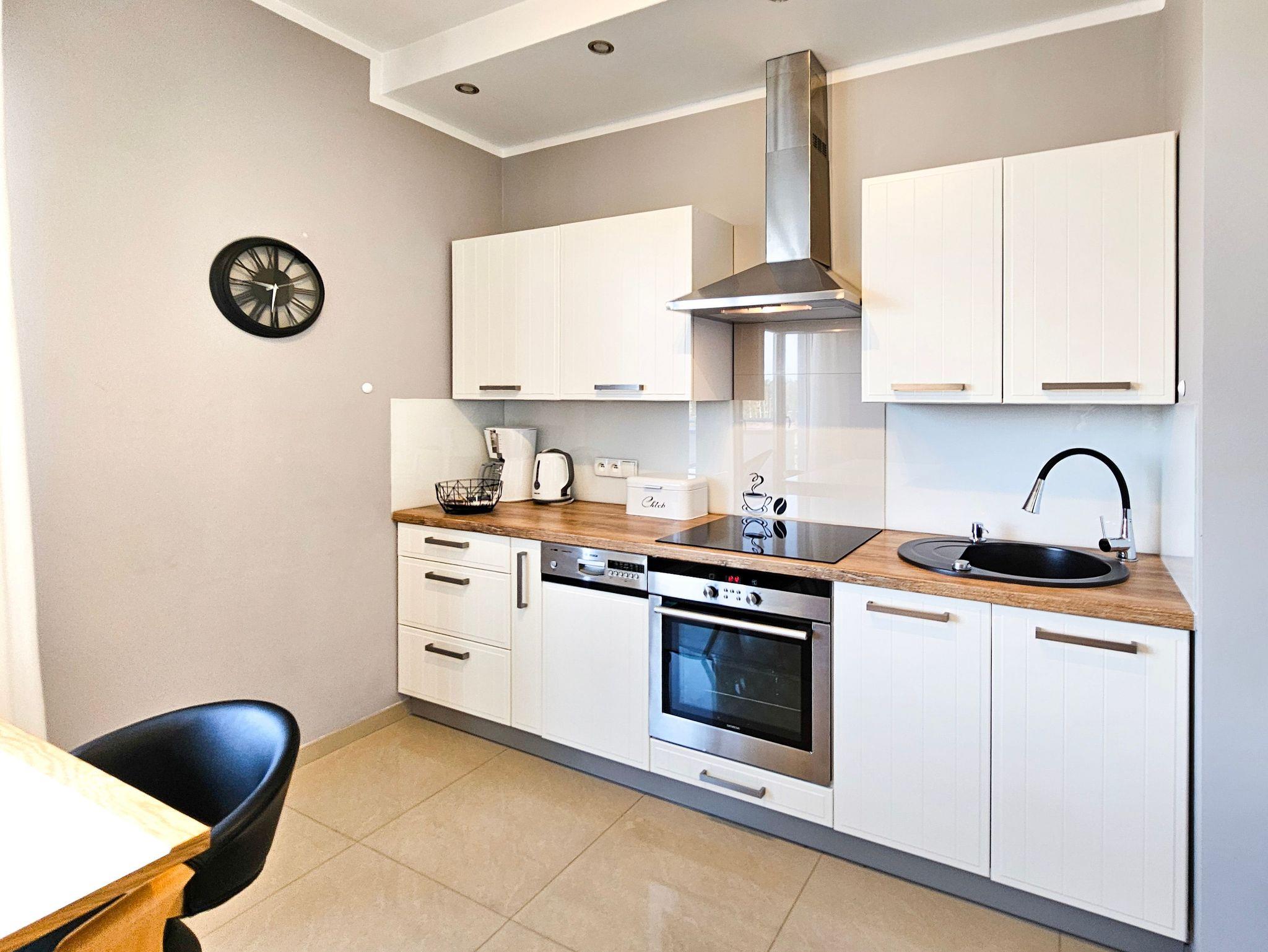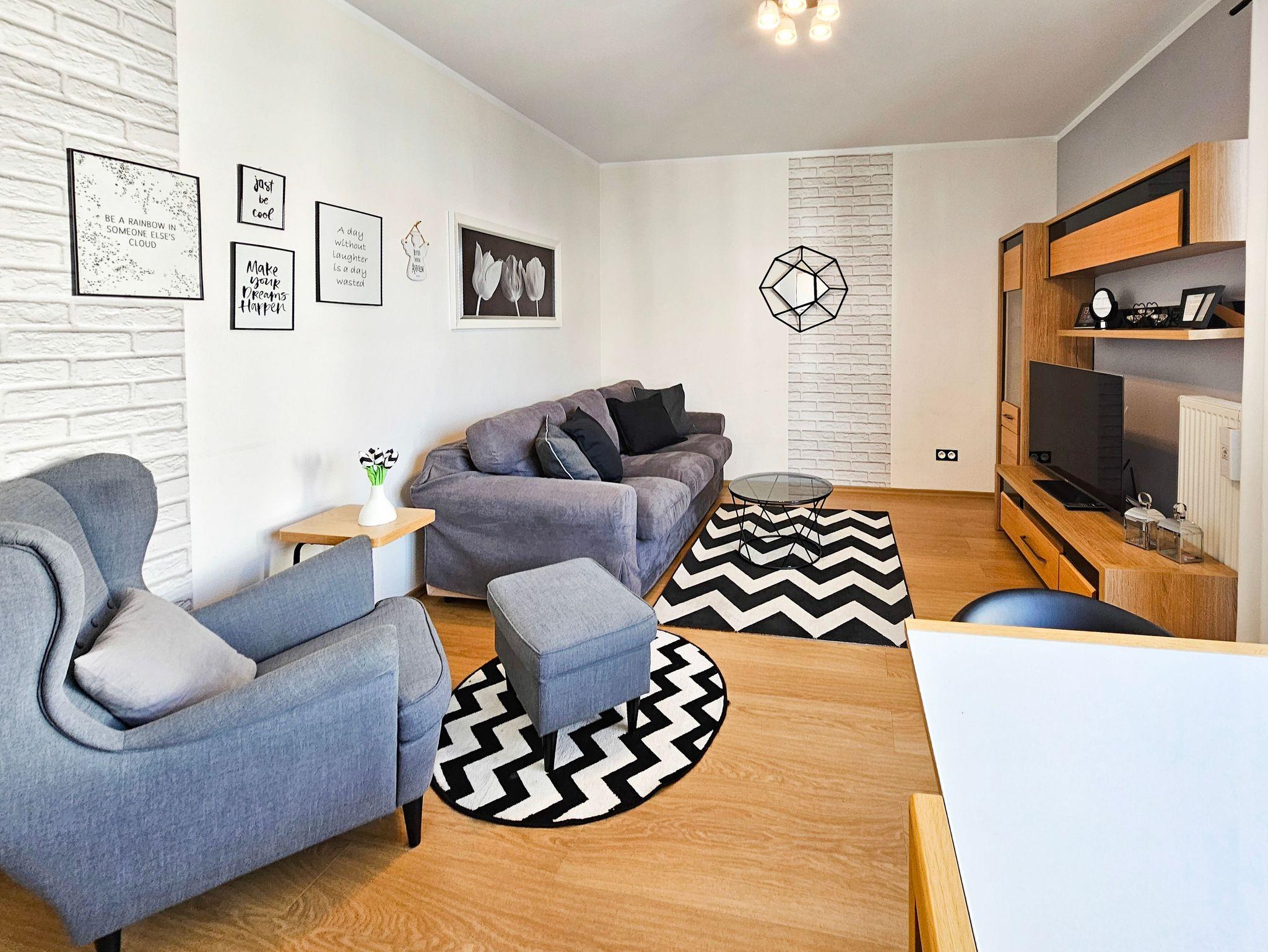 Die geräumige (44m2) 2-Zimmer-Ferienwohnung mit Balkon ist im 3. Stock eines Gebäudes mit Aufzug. Das Wohnzimmer besteht aus einem Erholungsbereich und einer Küchenzeile. Im Wohnzimmer, mit Balkonausgang, steht ein großes Ecksofa mit Schlaffunktion (Schlaffläche 140x200cm), eine Kommode mit einem TV - Kabelanschluss (deutschsprachige Sender sind zugänglich).