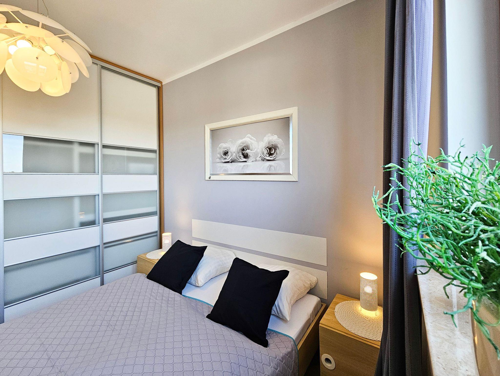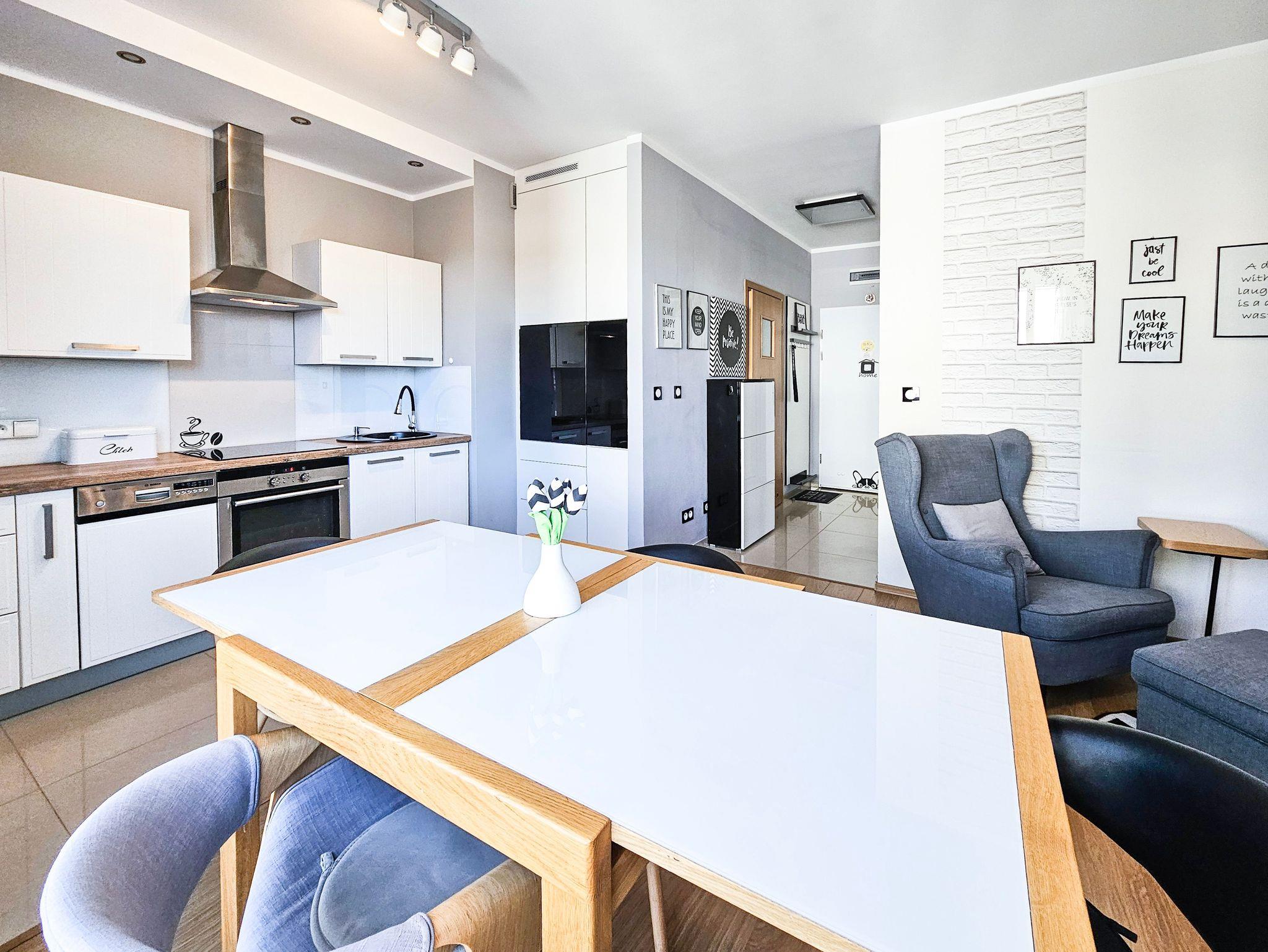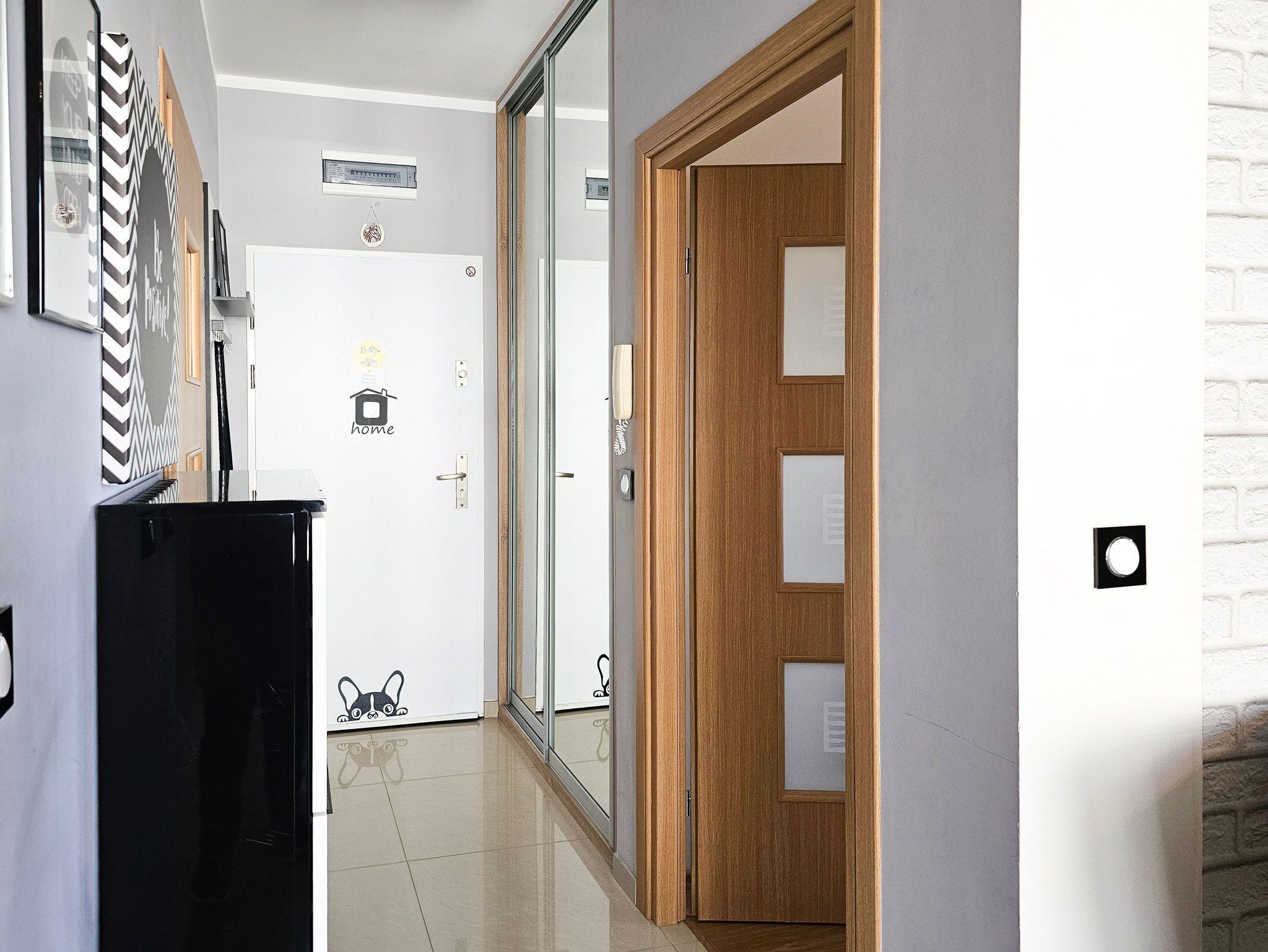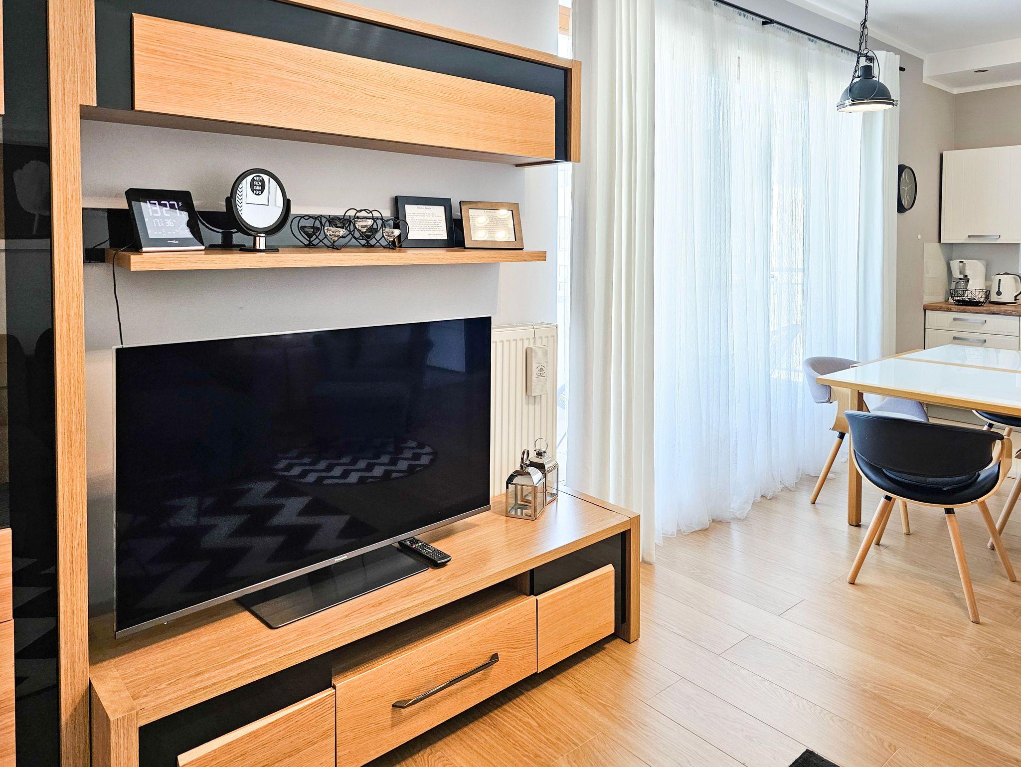 Die geräumige (44m2) 2-Zimmer-Ferienwohnung mit Balkon ist im 3. Stock eines Gebäudes mit Aufzug. Das Wohnzimmer besteht aus einem Erholungsbereich und einer Küchenzeile. Im Wohnzimmer, mit Balkonausgang, steht ein großes Ecksofa mit Schlaffunktion (Schlaffläche 140x200cm), eine Kommode mit einem TV - Kabelanschluss (deutschsprachige Sender sind zugänglich).