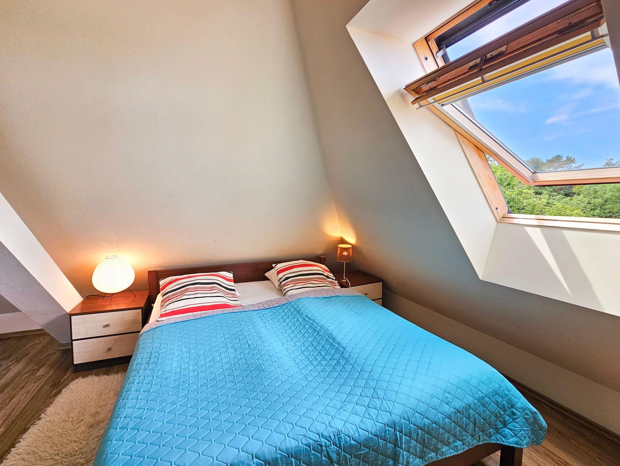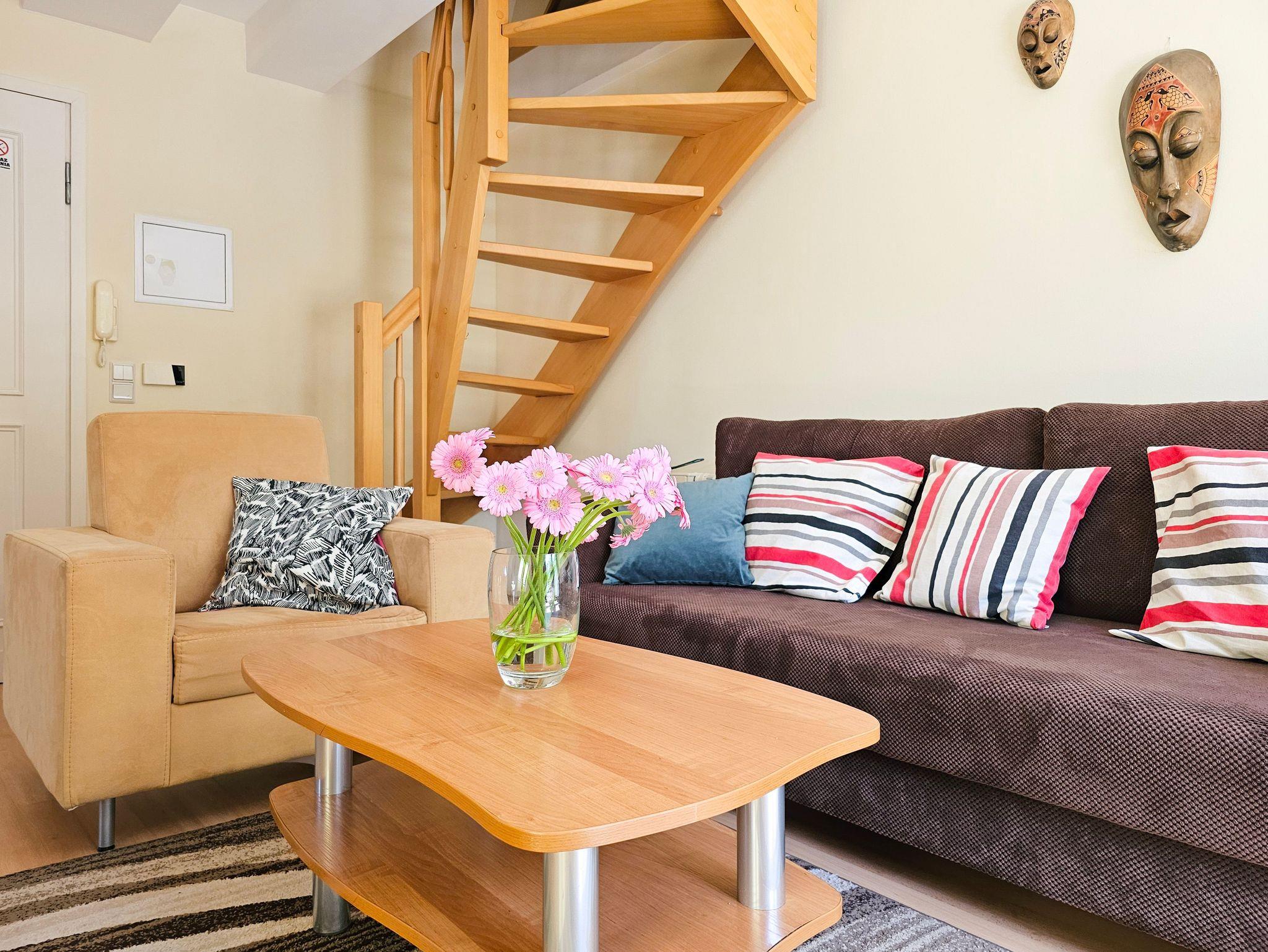 Eine ganz besondere 2-Ebene Dachgeschosswohnung. Im oberen Geschoss befindet sich das Schlafzimmer mit Ehebett (160 x 200 cm). Unten finden Sie eine Doppelcouch (130 x 195 cm), Küchenzeile und Bad mit Badewanne, sowie ein Balkon von der Südseite. Wohnung ausgestattet mit einer Waschmachine und DVD