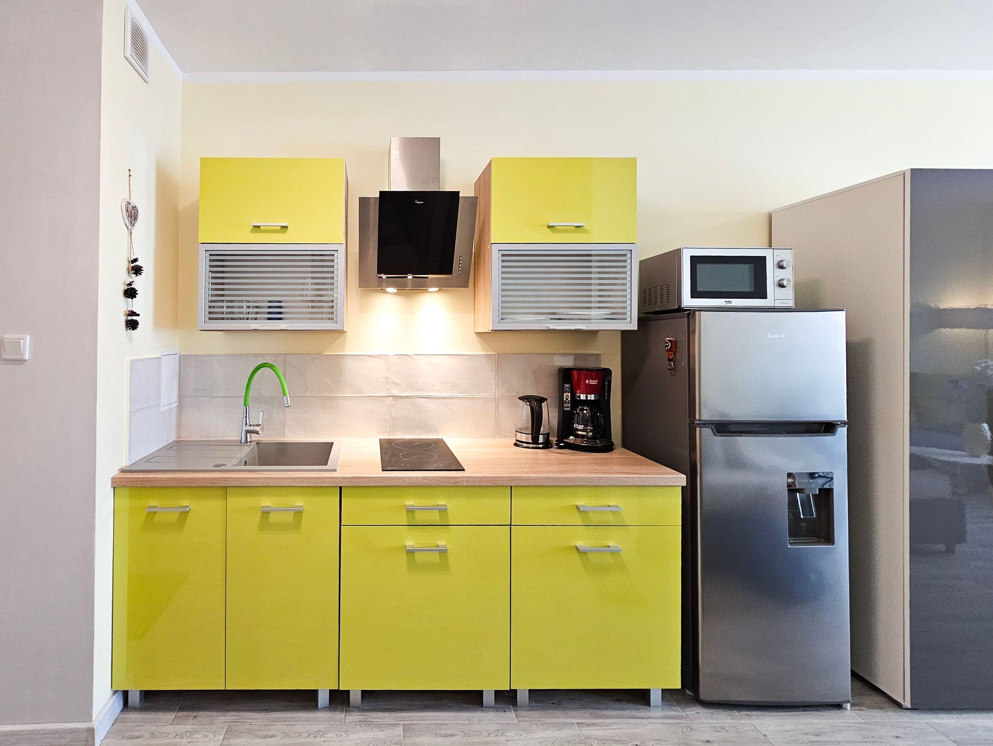 Die Küchenzeile ist mit notwendigen Geschirr und Besteck für die Zubereitung und den Verzehr von Mahlzeiten ausgestattet, ebenfalls mit einem Elektroherd mit 2 Heizflächen, einer Überlauf-Kaffeemaschine und einem Toaster.